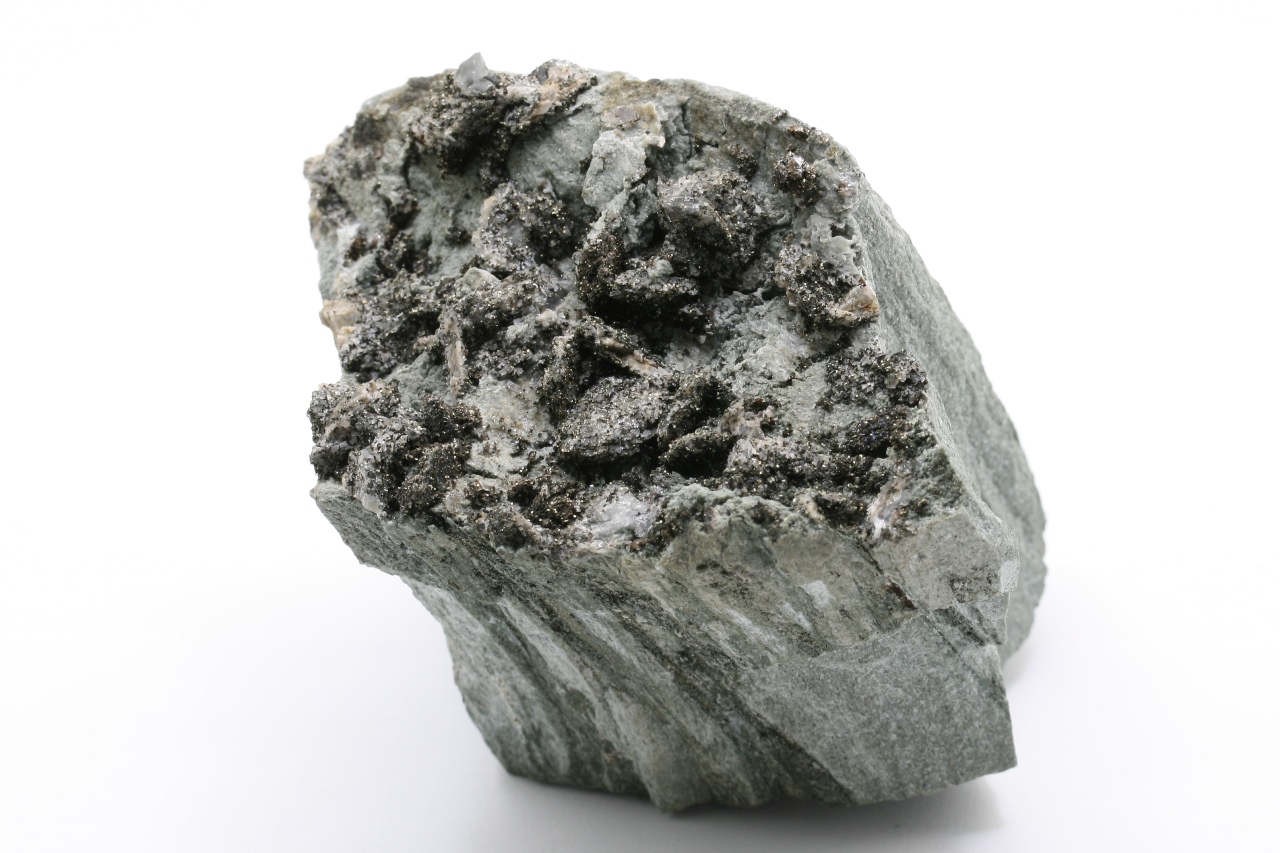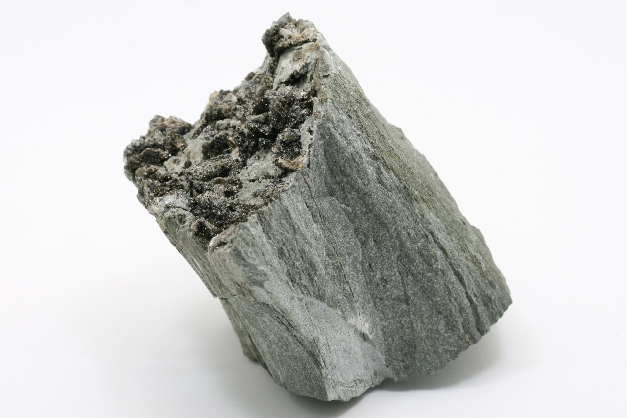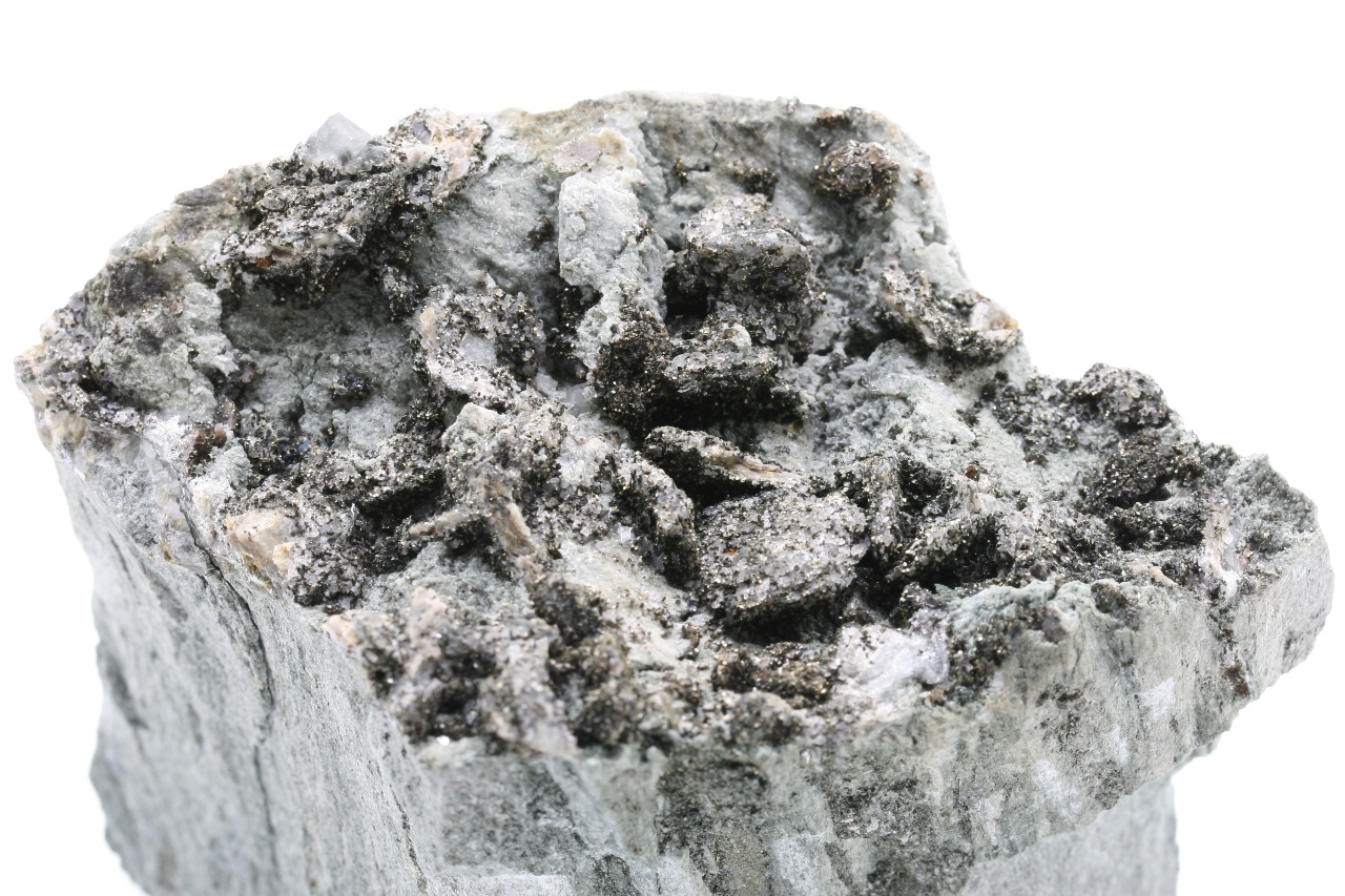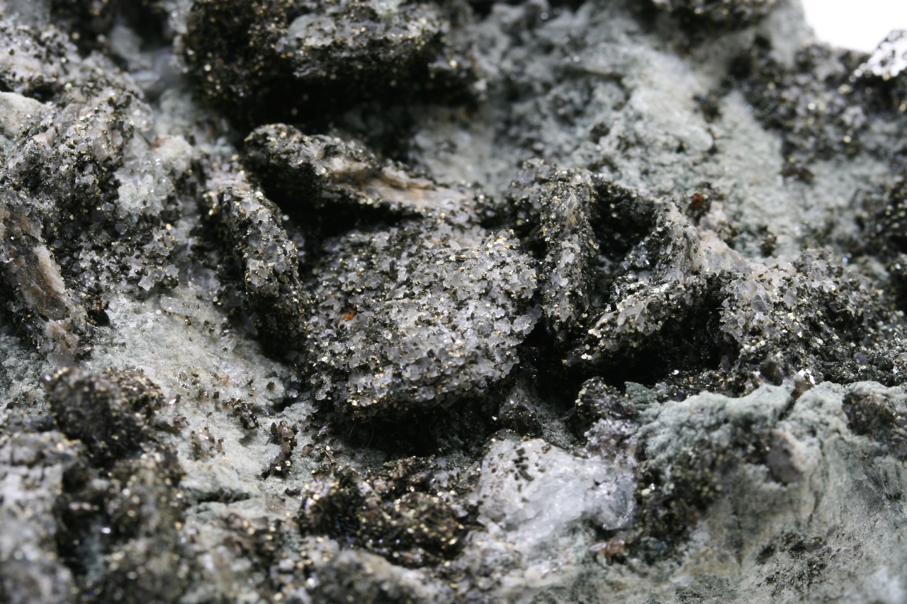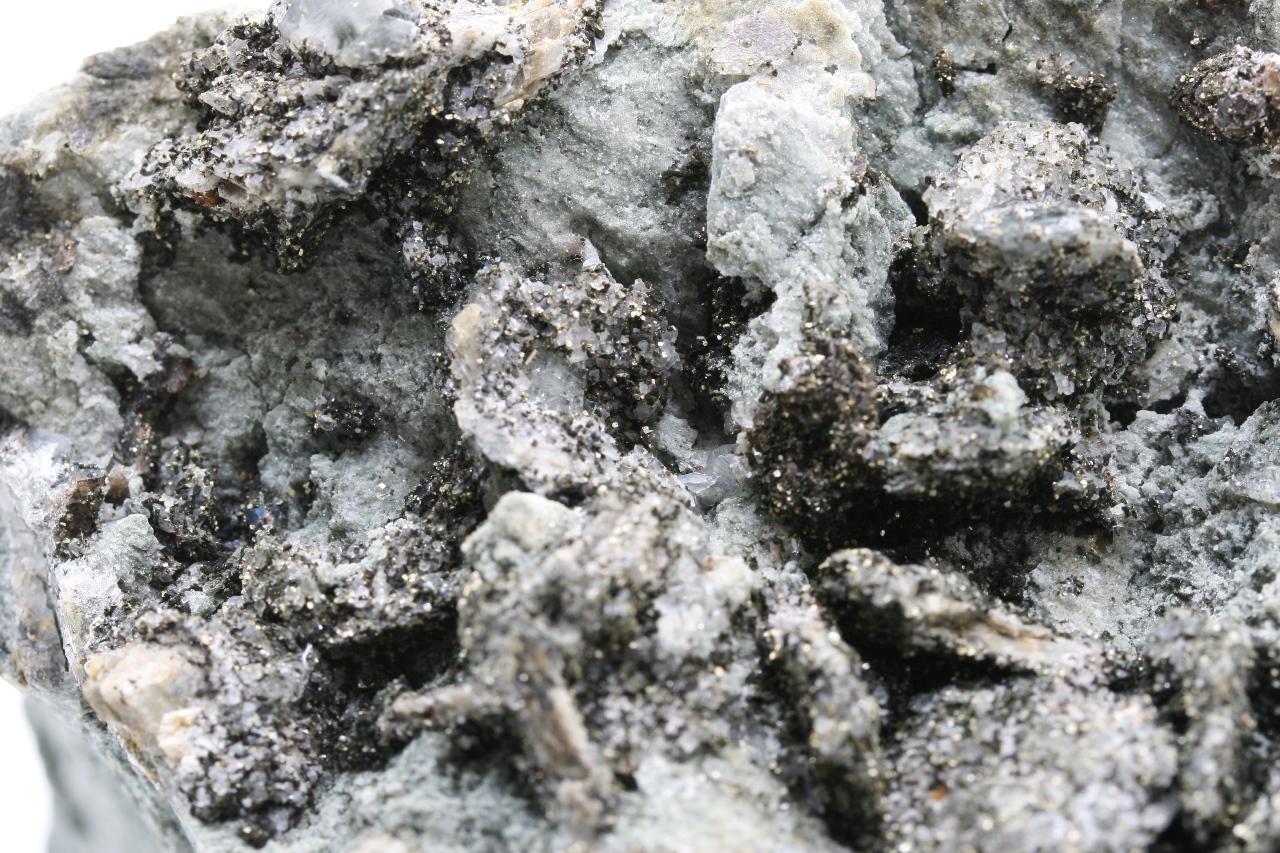 Grauweiße Chloritkristalle bewachsen mit kleinen glänzenden Chloritkristallen.