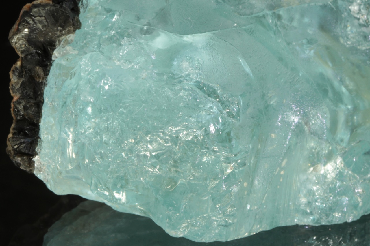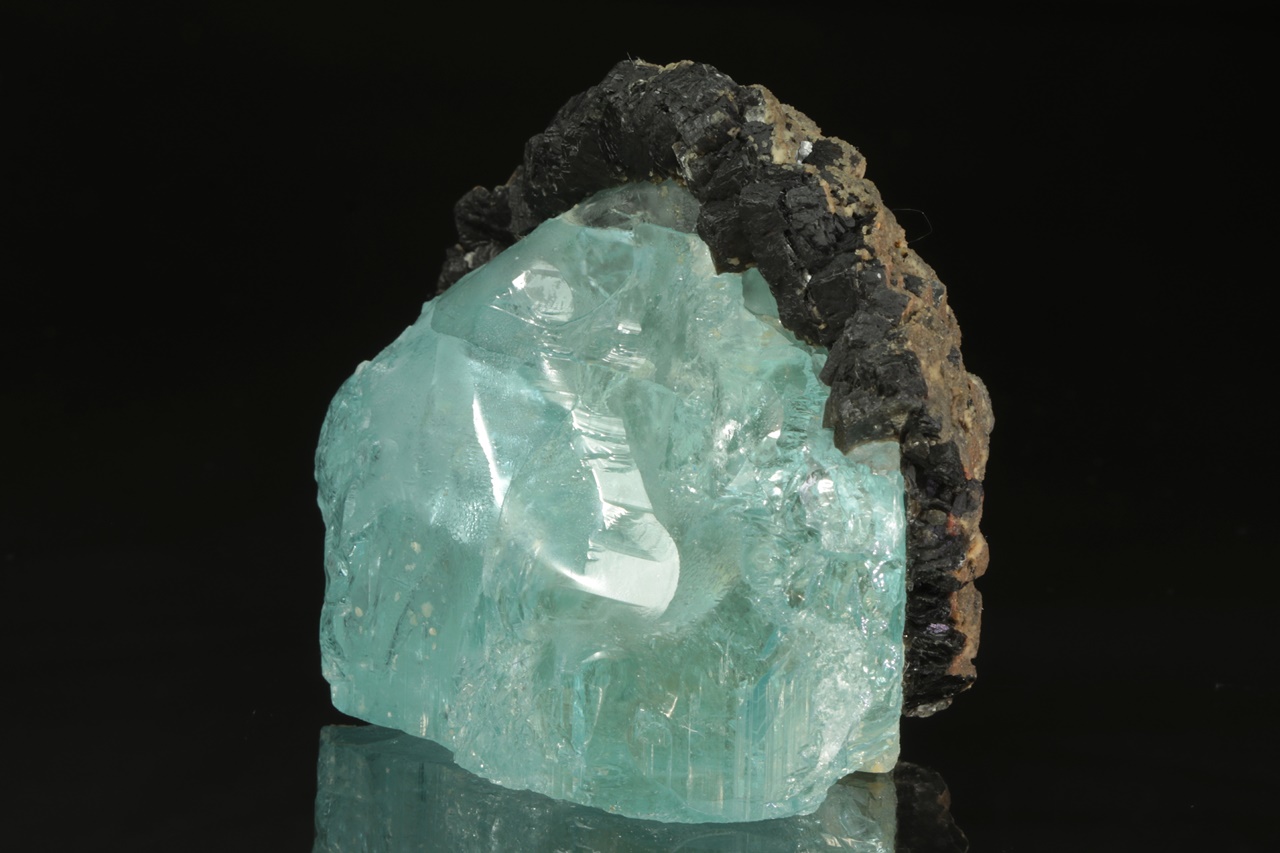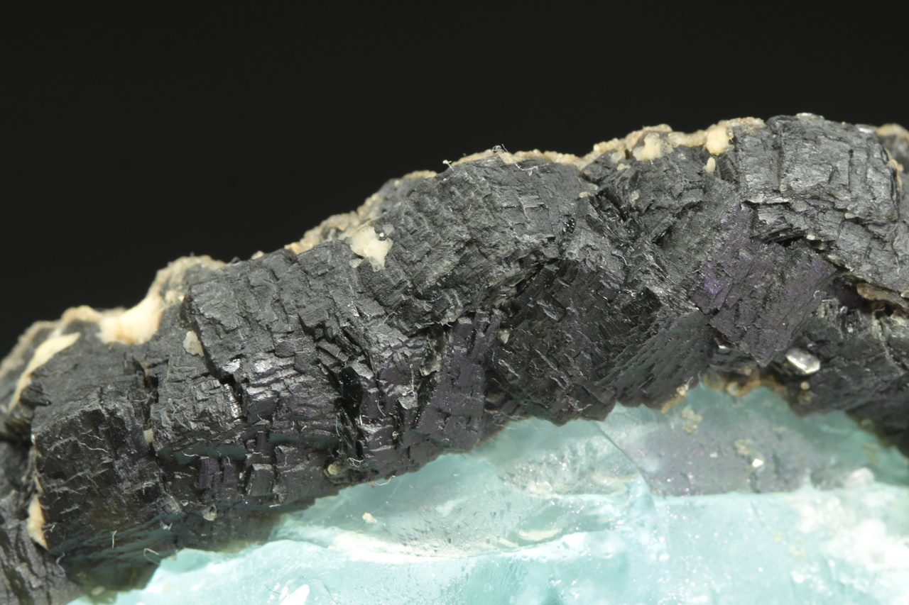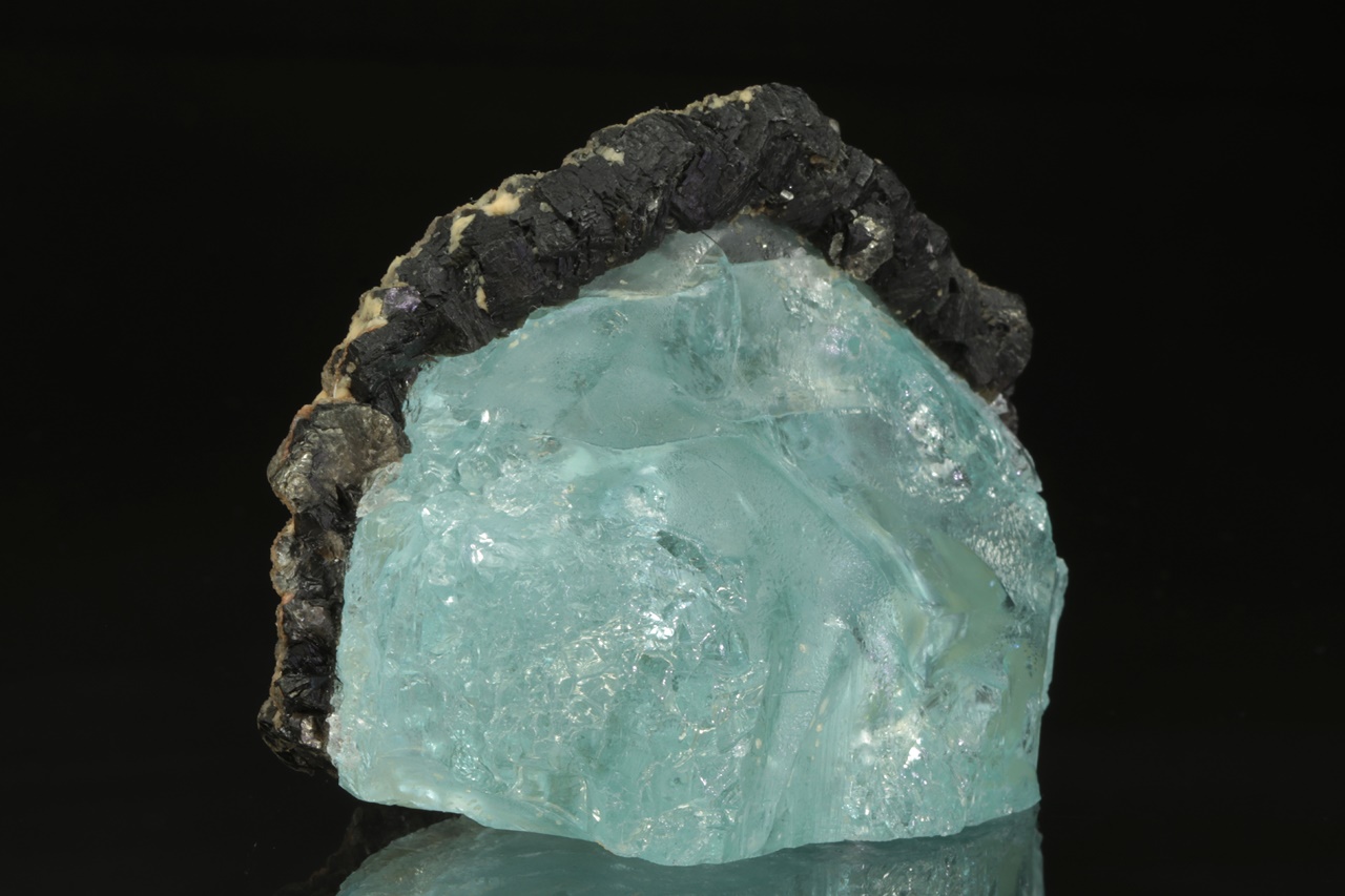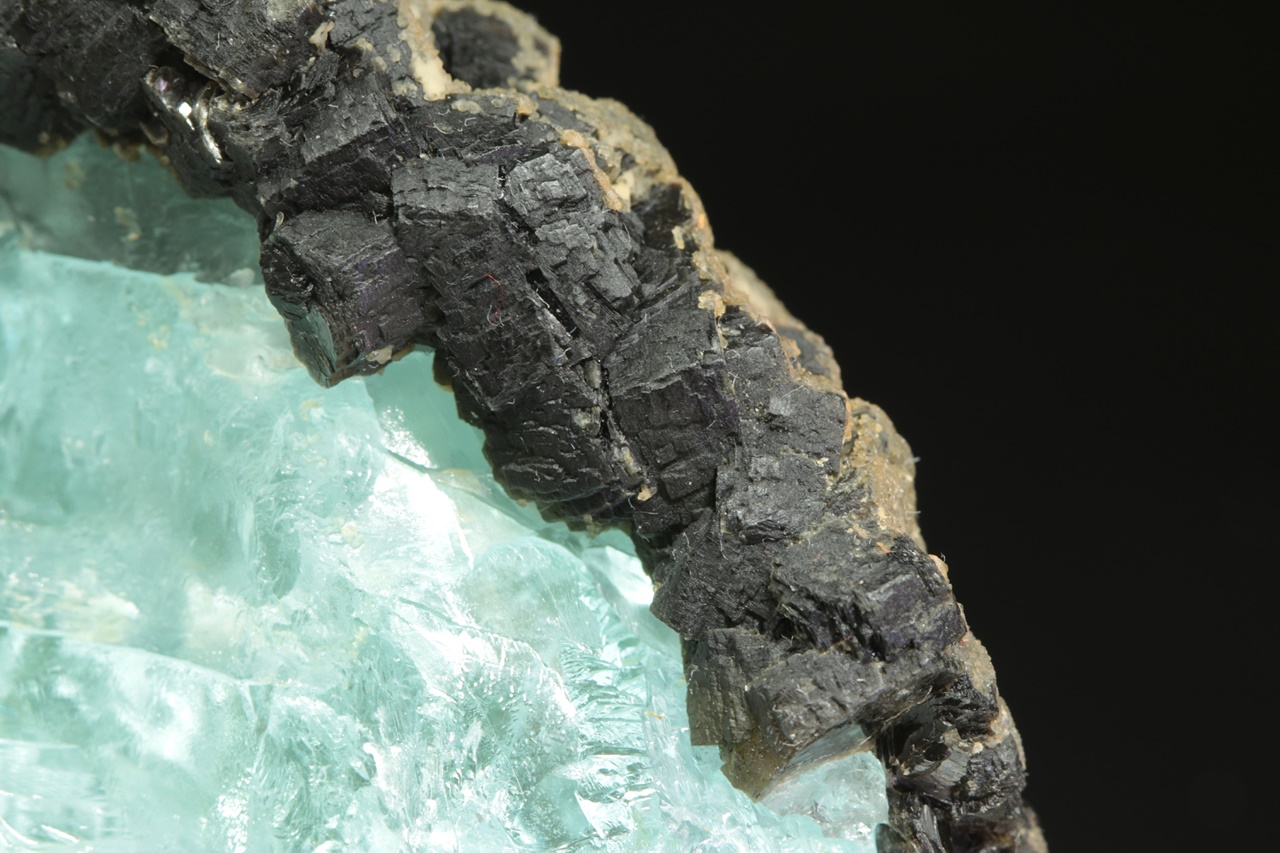 Kristall von intensiv blauem Topas, der auf einer Seite mit schwarzem Biotit überwachsen ist .