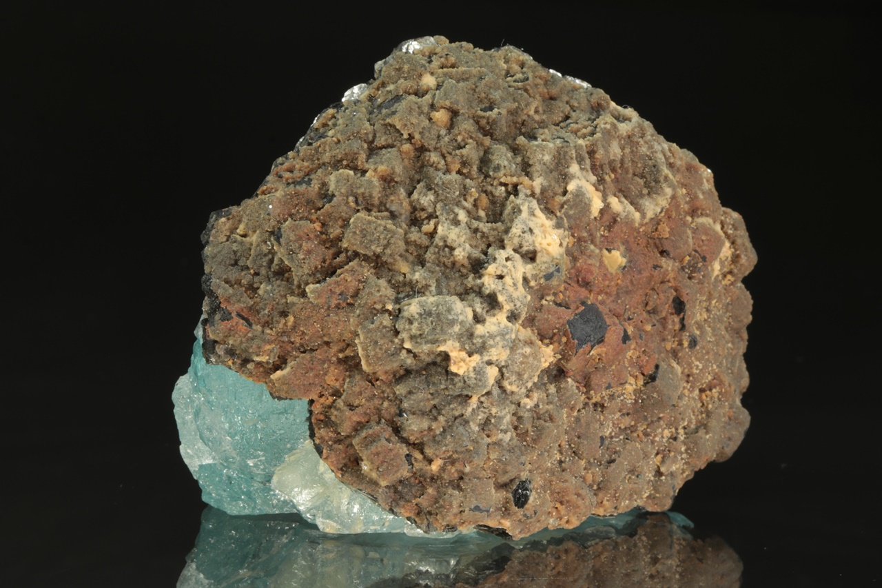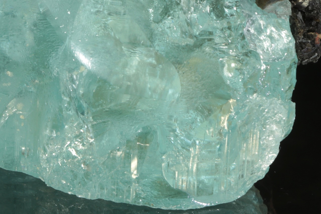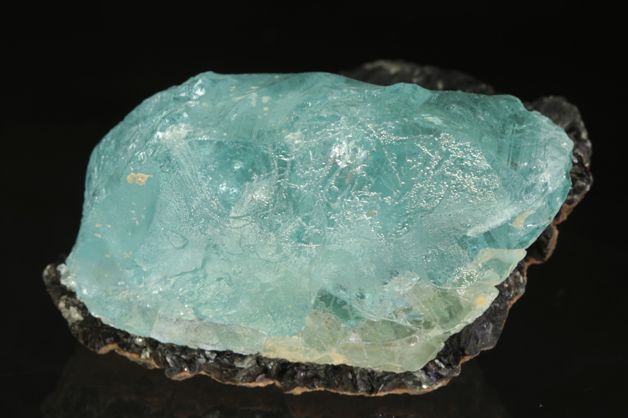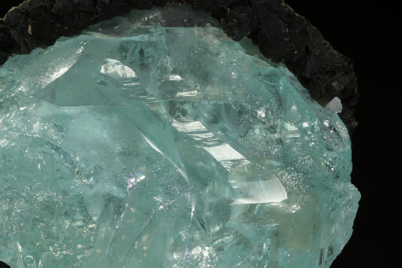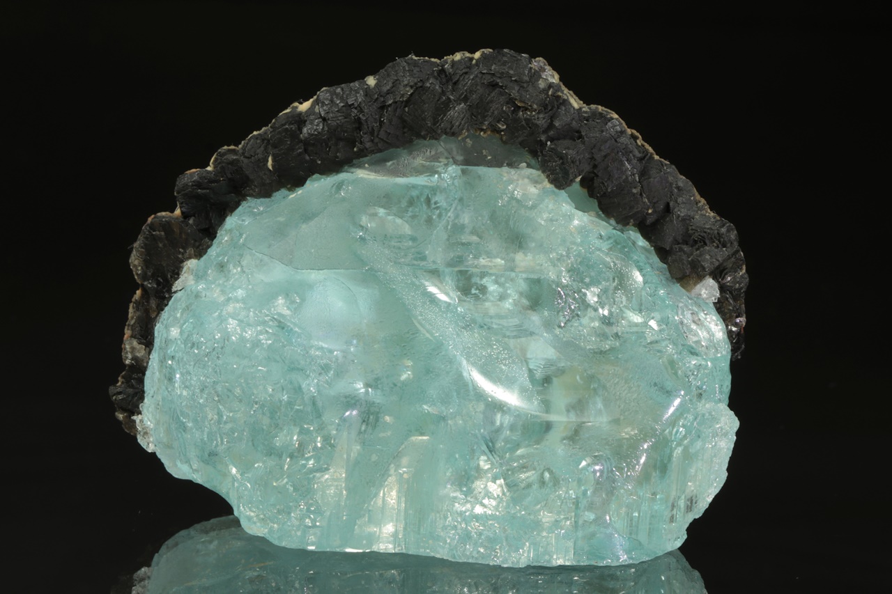 Kristall von intensiv blauem Topas, der auf einer Seite mit schwarzem Biotit überwachsen ist .