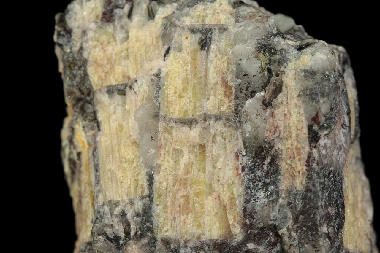 Faserige Varietät von Topas mit eingewachsenen Kristallen von Cinvaldit.