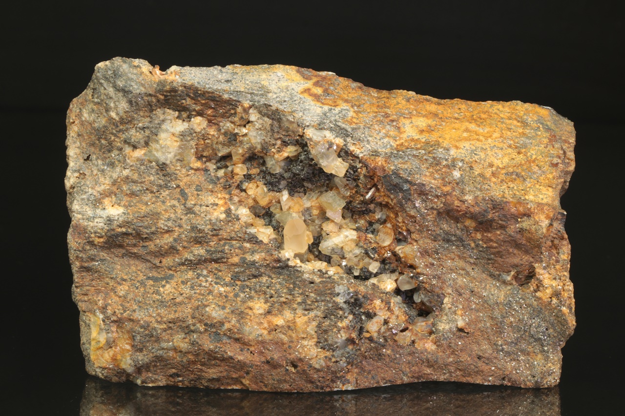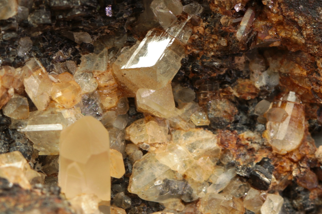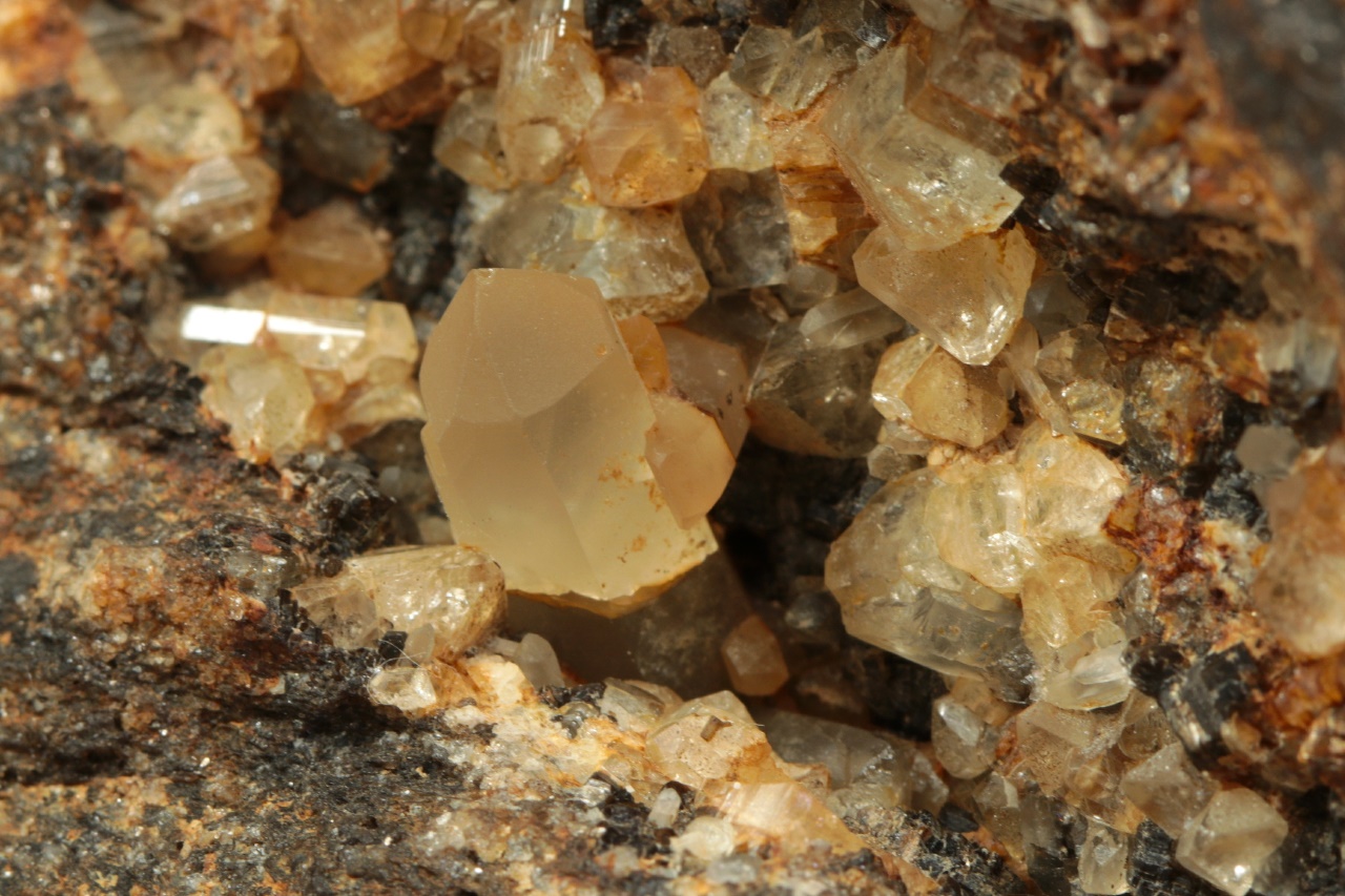 Světle žluté krystaly topazu až 9 mm velké narostlé do dutiny s krystalem křemene.
