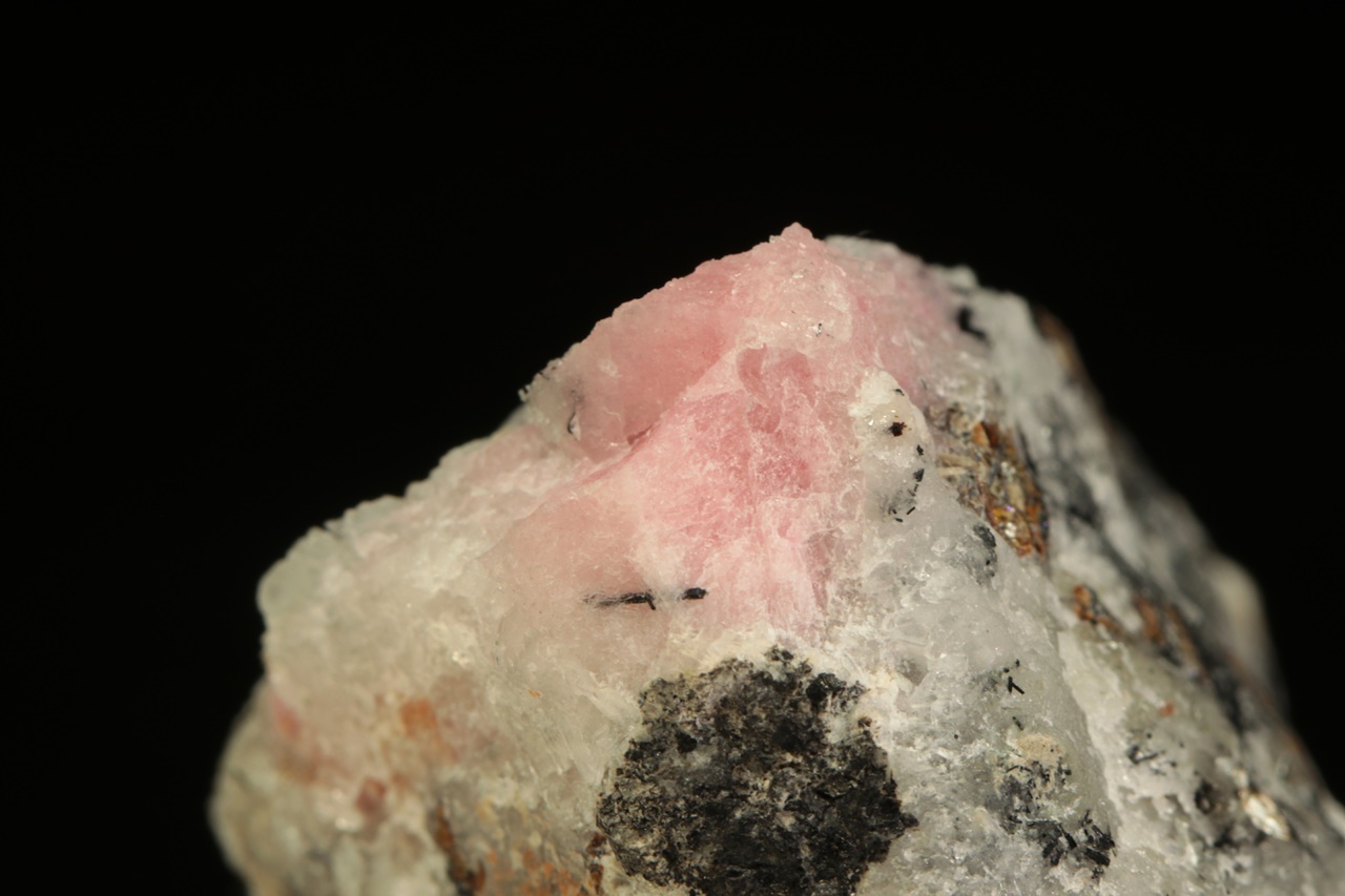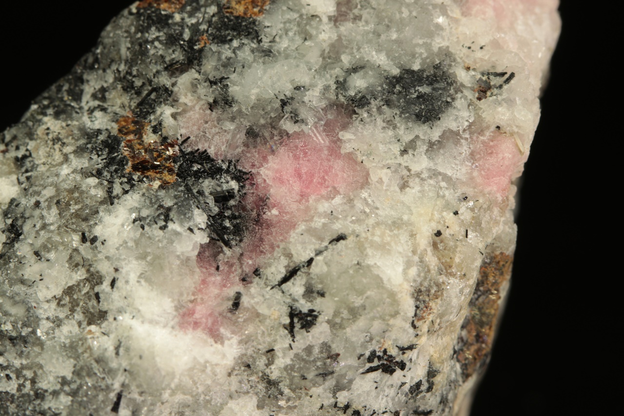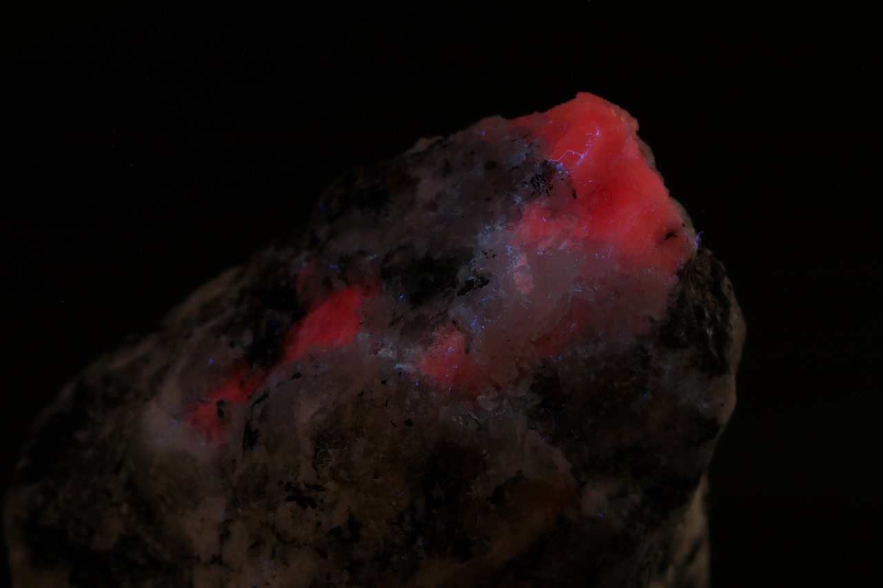 Vzorek vzácného růžového silikátu berylia – tugtupitu se schopnosti tzv. tenebrescence (po nasvícení UV zářením změní barvu). Velikost největšího zrna je 15 mm.