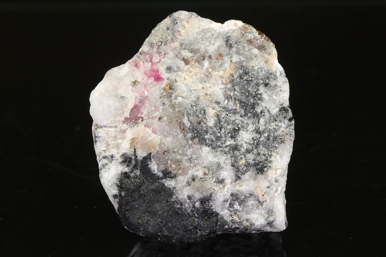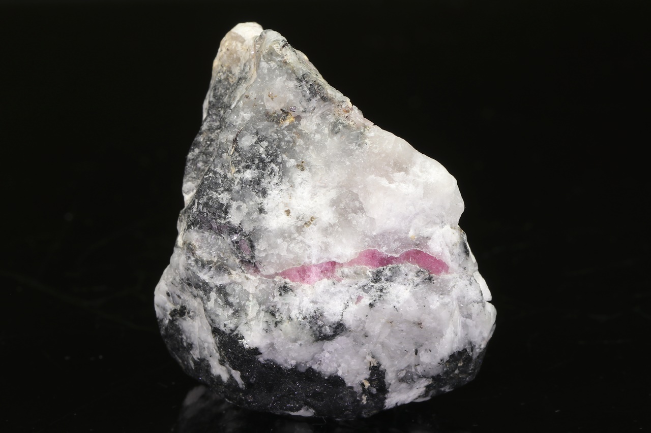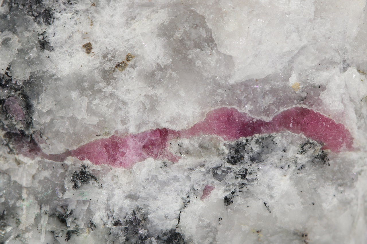 Körner des seltenen Silikatminerals Beryll – Tugtupit mit der Fähigkeit der sogenannten Tenebreszenz (nach Bestrahlung mit UV-Licht ändert es vorübergehend die Farbe).
