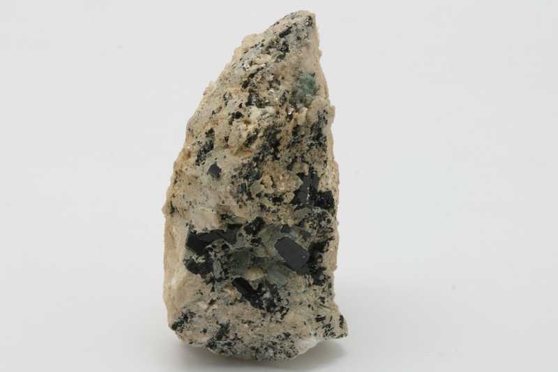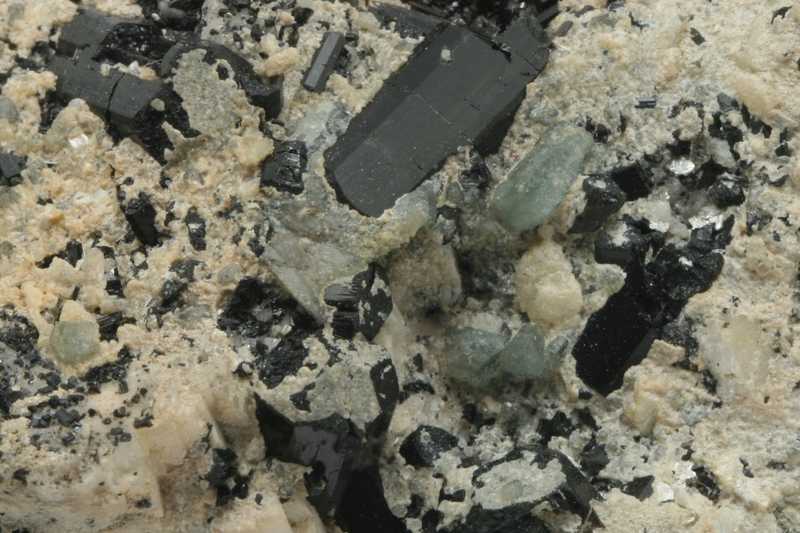 Ästhetische Probe des Pegmatits mit schwarzem Turmalín und bläulichem Apatit. Der größte Turmalín-Kristall ist 15 mm groß, Apatit 5 mm. Die Probe stammt aus der Oldřich-Adern von 1968.