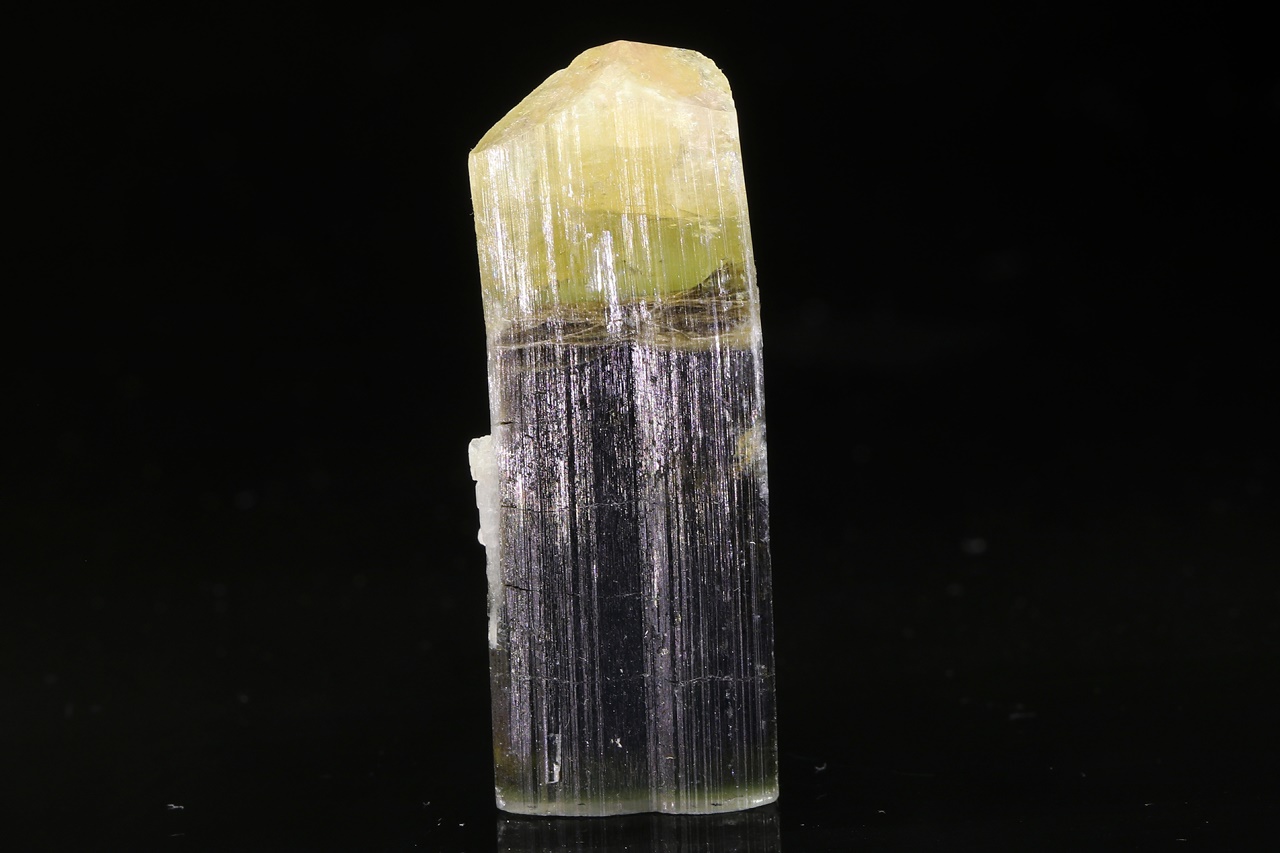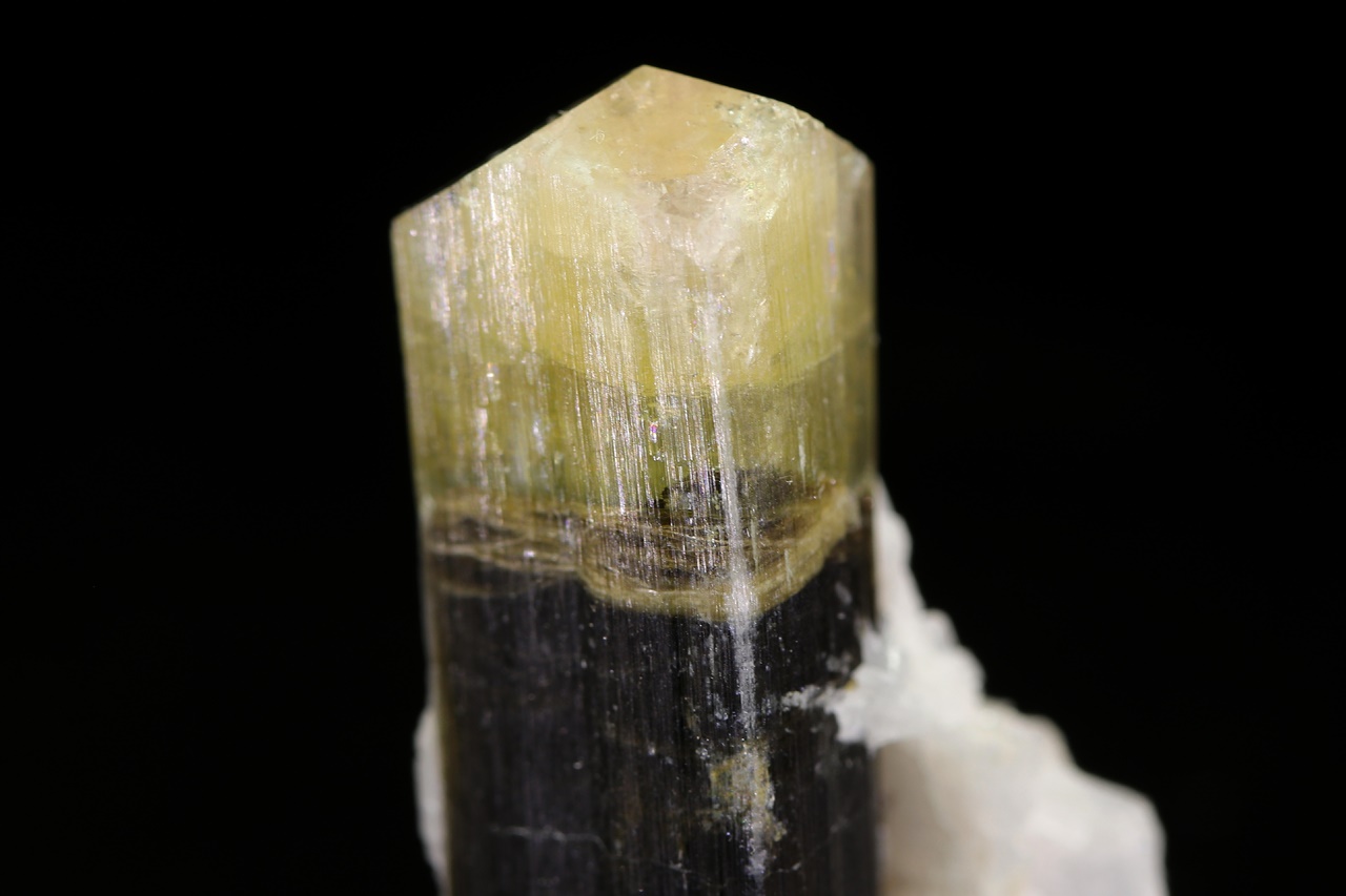 Dunkelgrüner Turmalin mit heller Spitze, umgeben von Albit. Der Kristall ist beidseitig abgeschlossen.