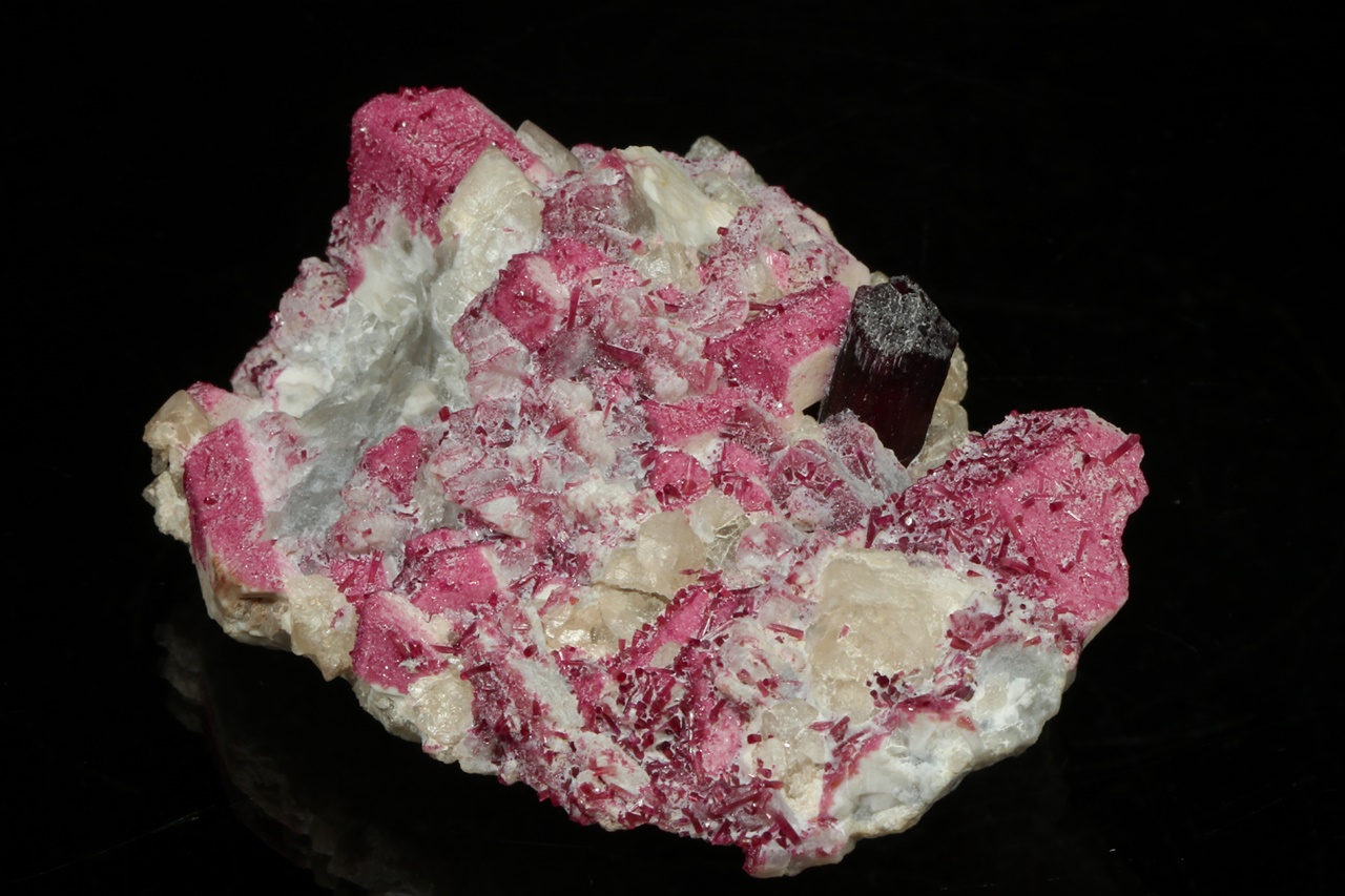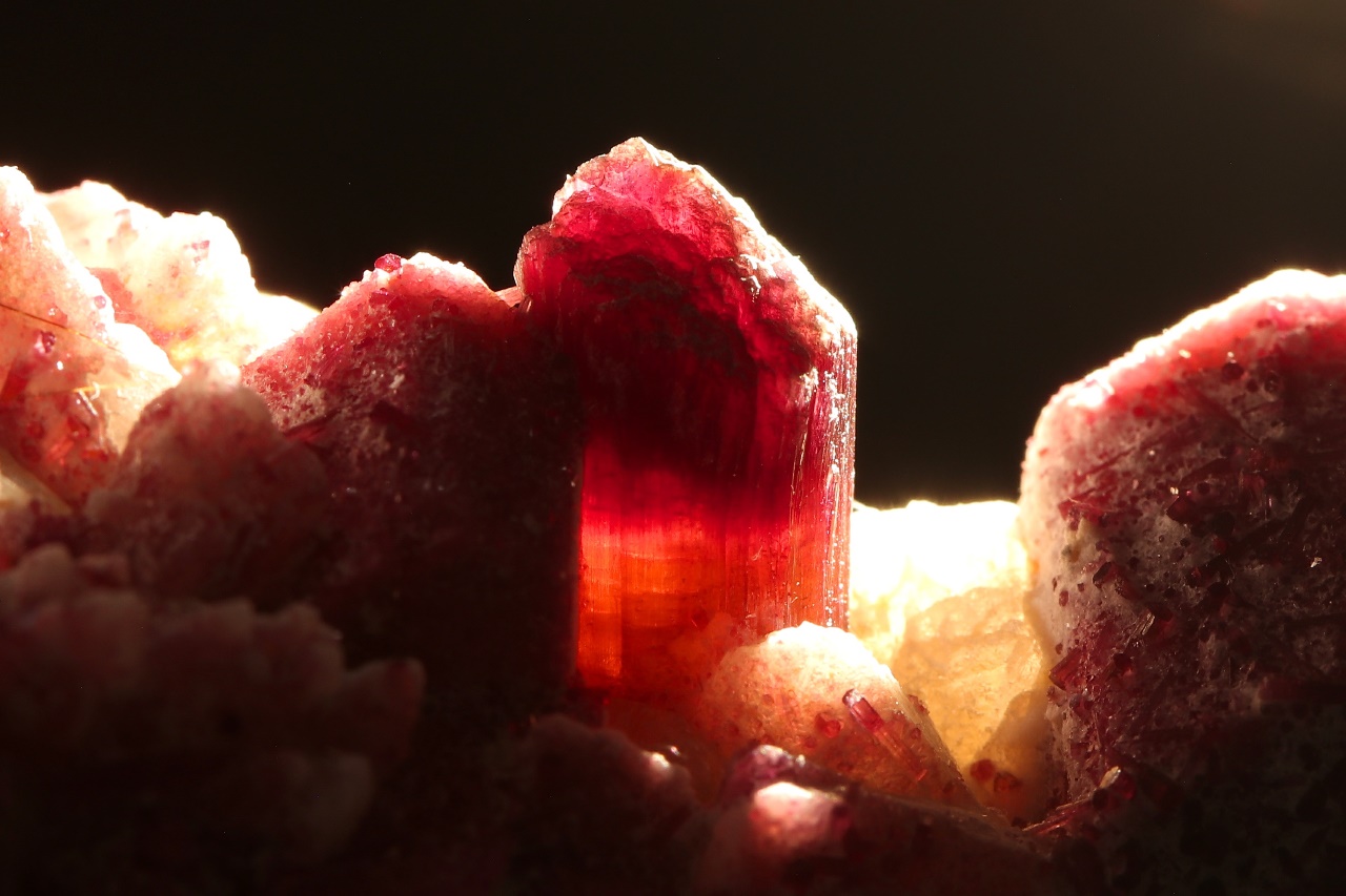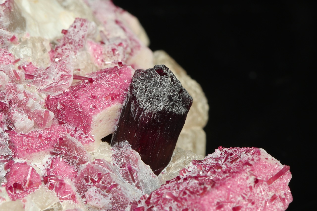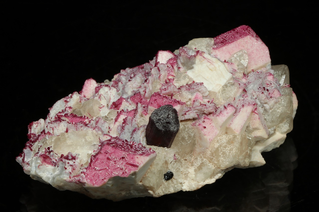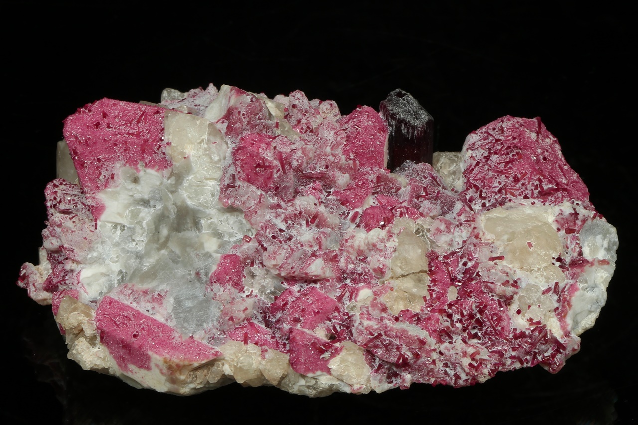 Ästhetische Druse aus Orthoklas und Quarz mit zwei Generationen von Turmalin. Die erste Generation wird durch einen 14 mm großen, intensiv roten, durchsichtigen Kristall dargestellt, die zweite wächst als kleine Kristalle auf dem Orthoklas.