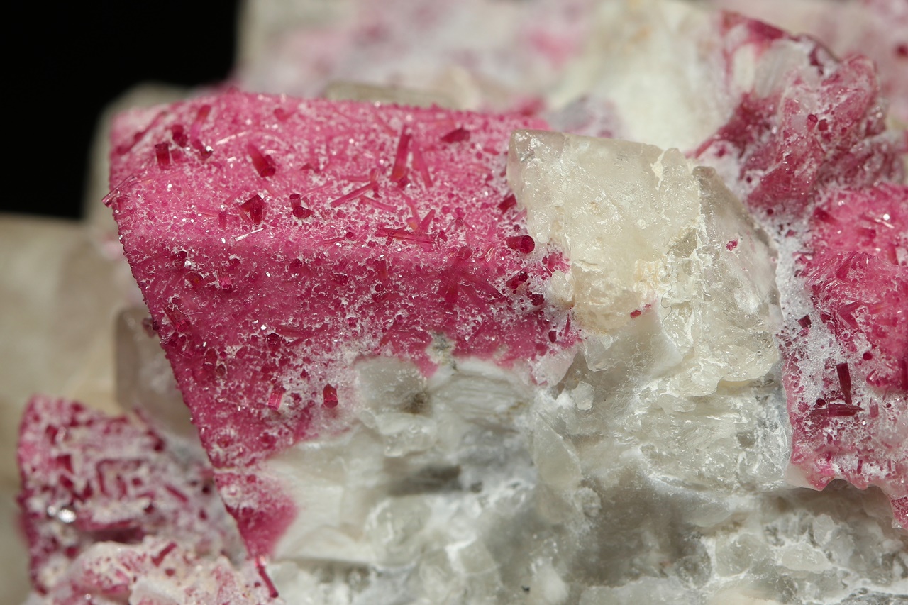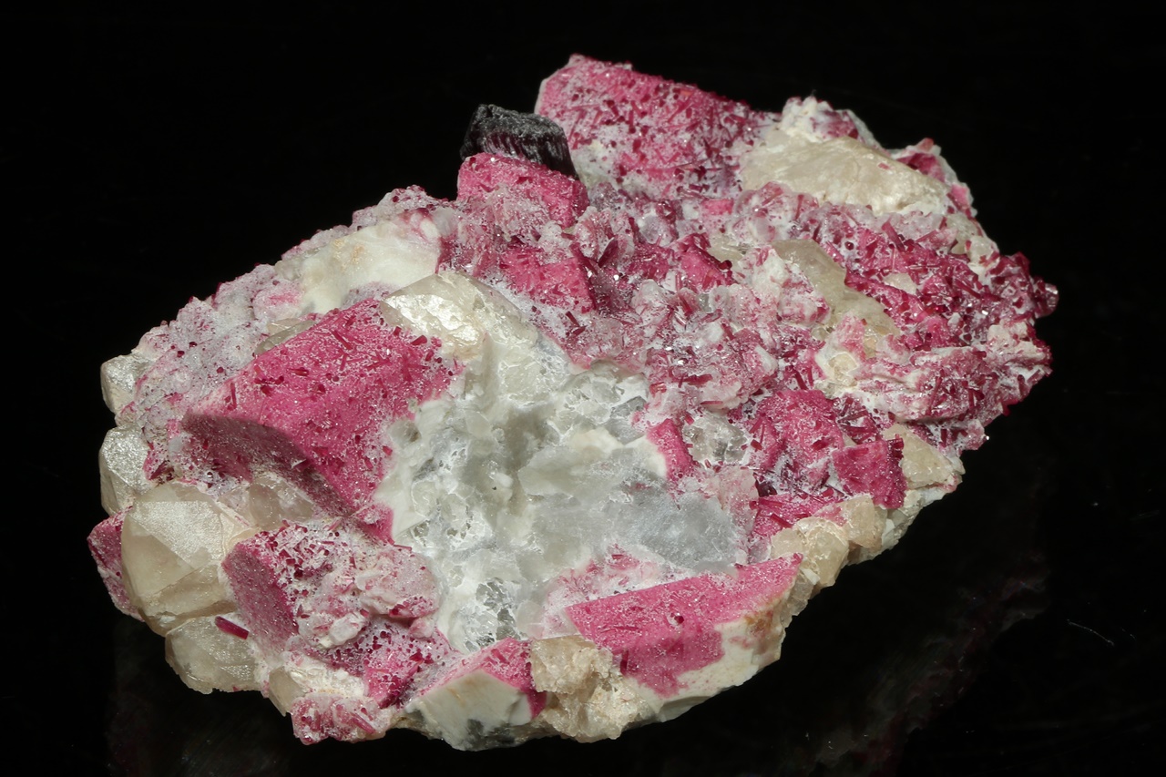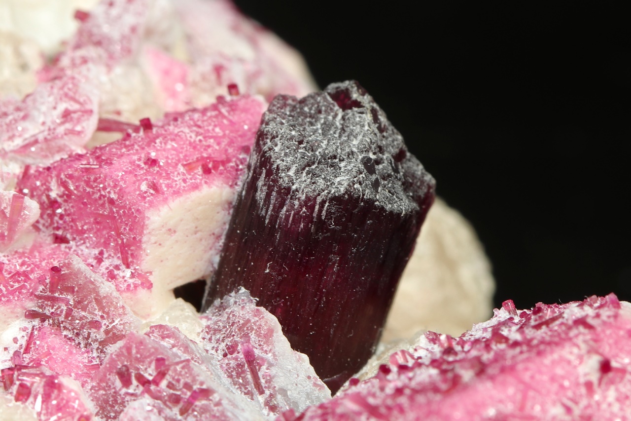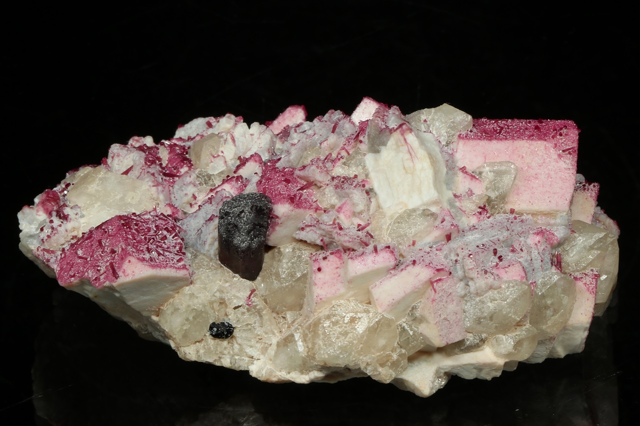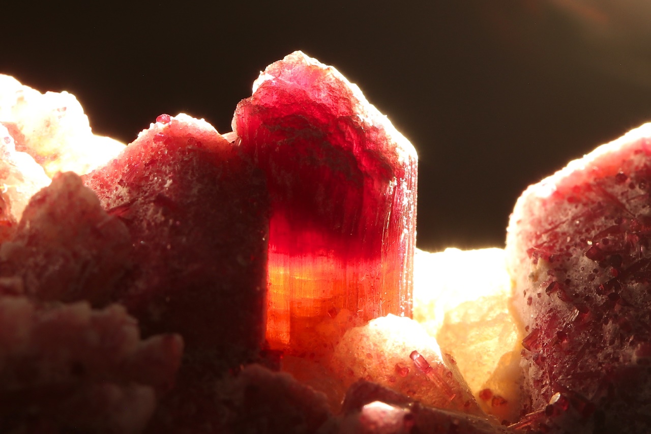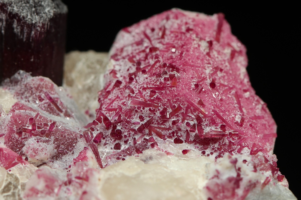 Ästhetische Druse aus Orthoklas und Quarz mit zwei Generationen von Turmalin. Die erste Generation wird durch einen 14 mm großen, intensiv roten, durchsichtigen Kristall dargestellt, die zweite wächst als kleine Kristalle auf dem Orthoklas.