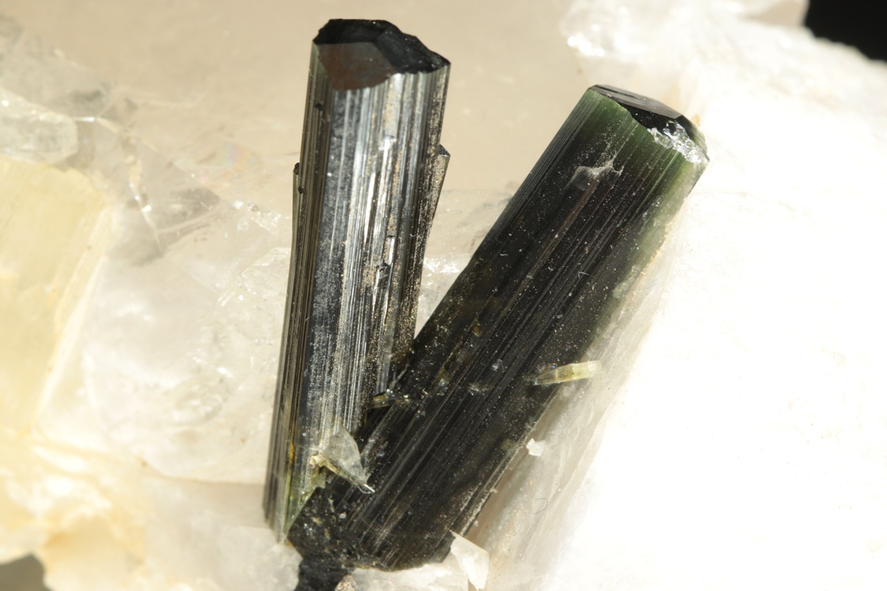Bis zu drei Zentimeter große Kristalle von dunkelgrünem Turmalin mit hellerer Spitze eingeschlossen in einem Kristall aus Quarz und Feldspat.