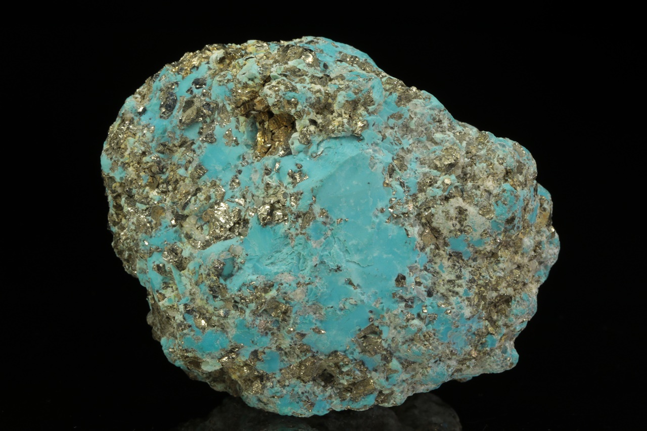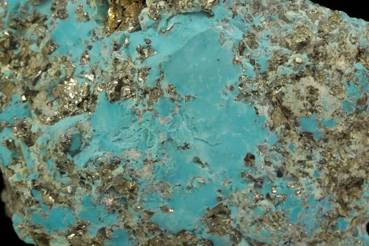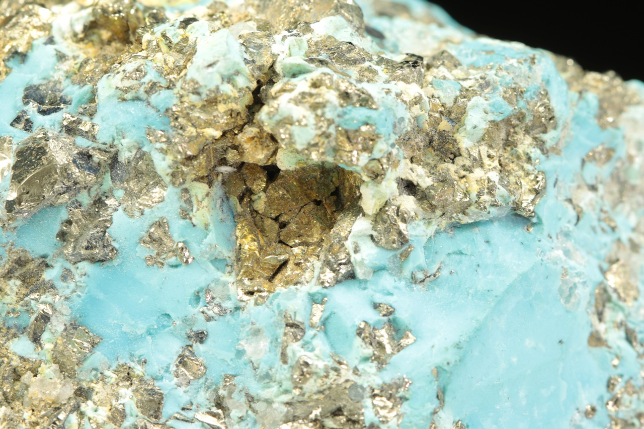 Nádherně modrý tyrkys s agregáty pyritu z íránské lokality známe již 4000 let.