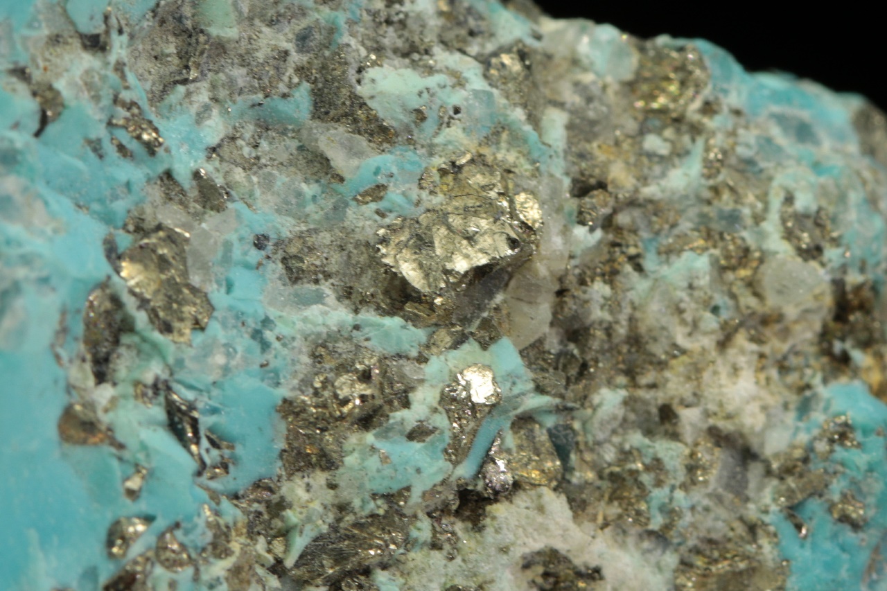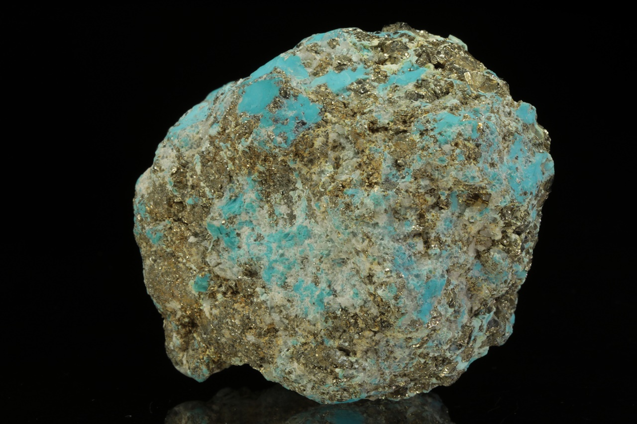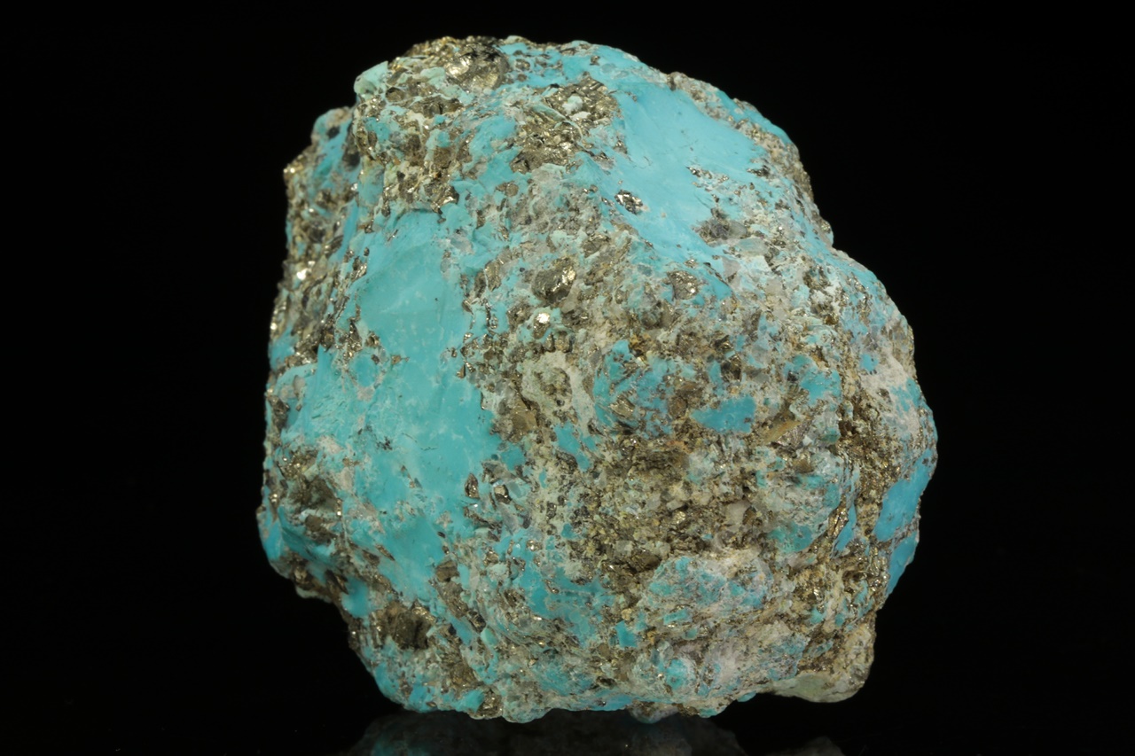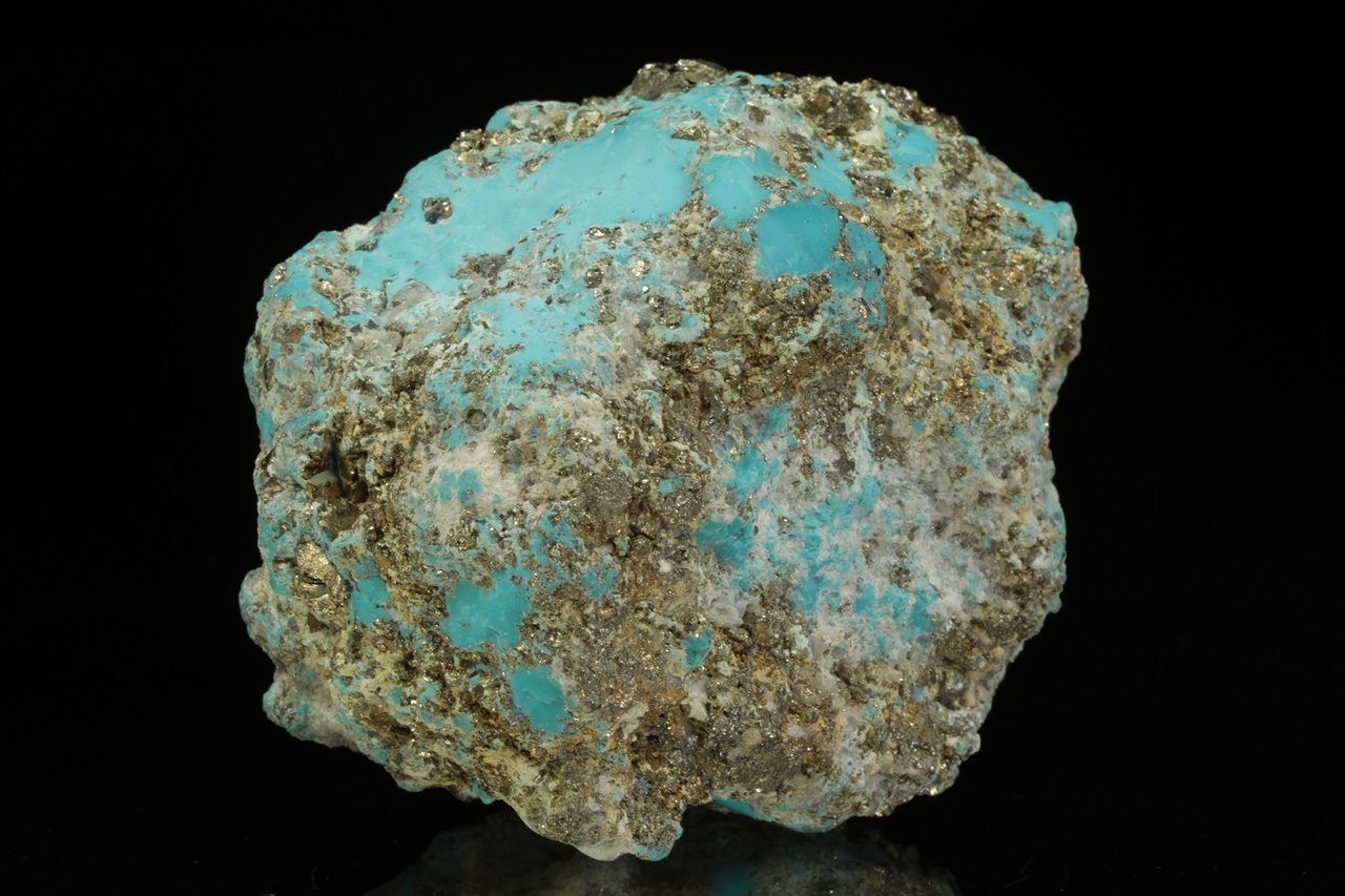 Nádherně modrý tyrkys s agregáty pyritu z íránské lokality známe již 4000 let.