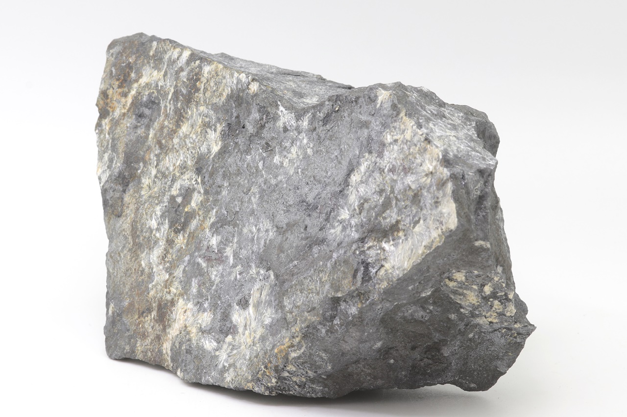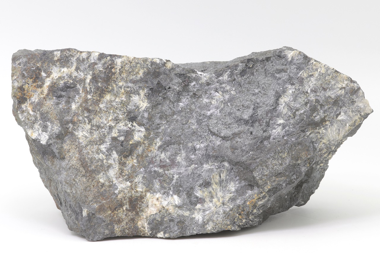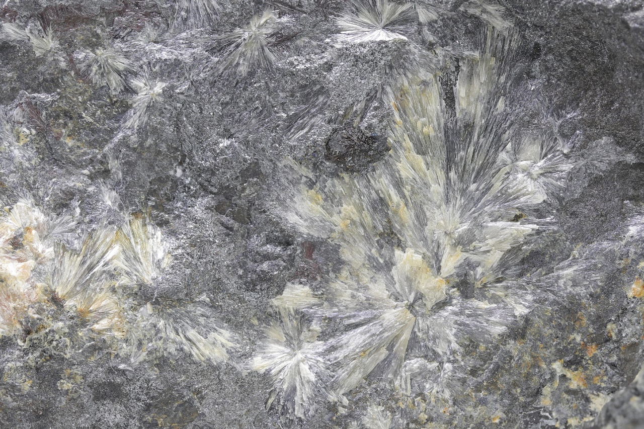 Radiäre Aggregate aus weißem Antimonoxid – Valentinit. Die größten Kristalle sind 1 cm groß.