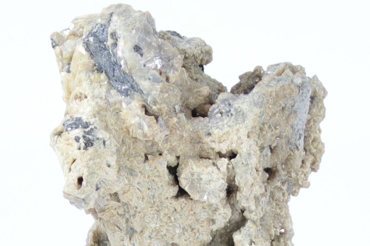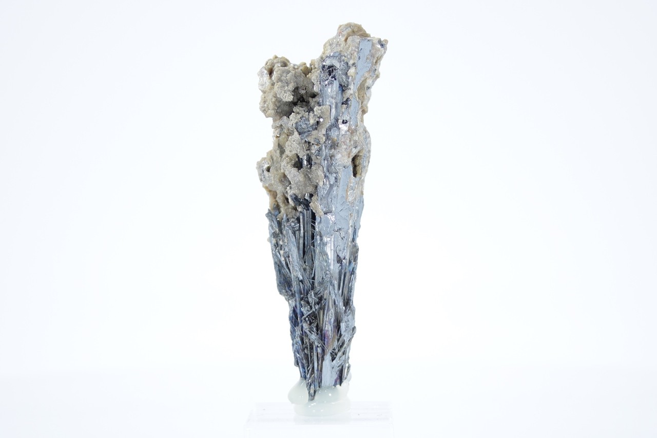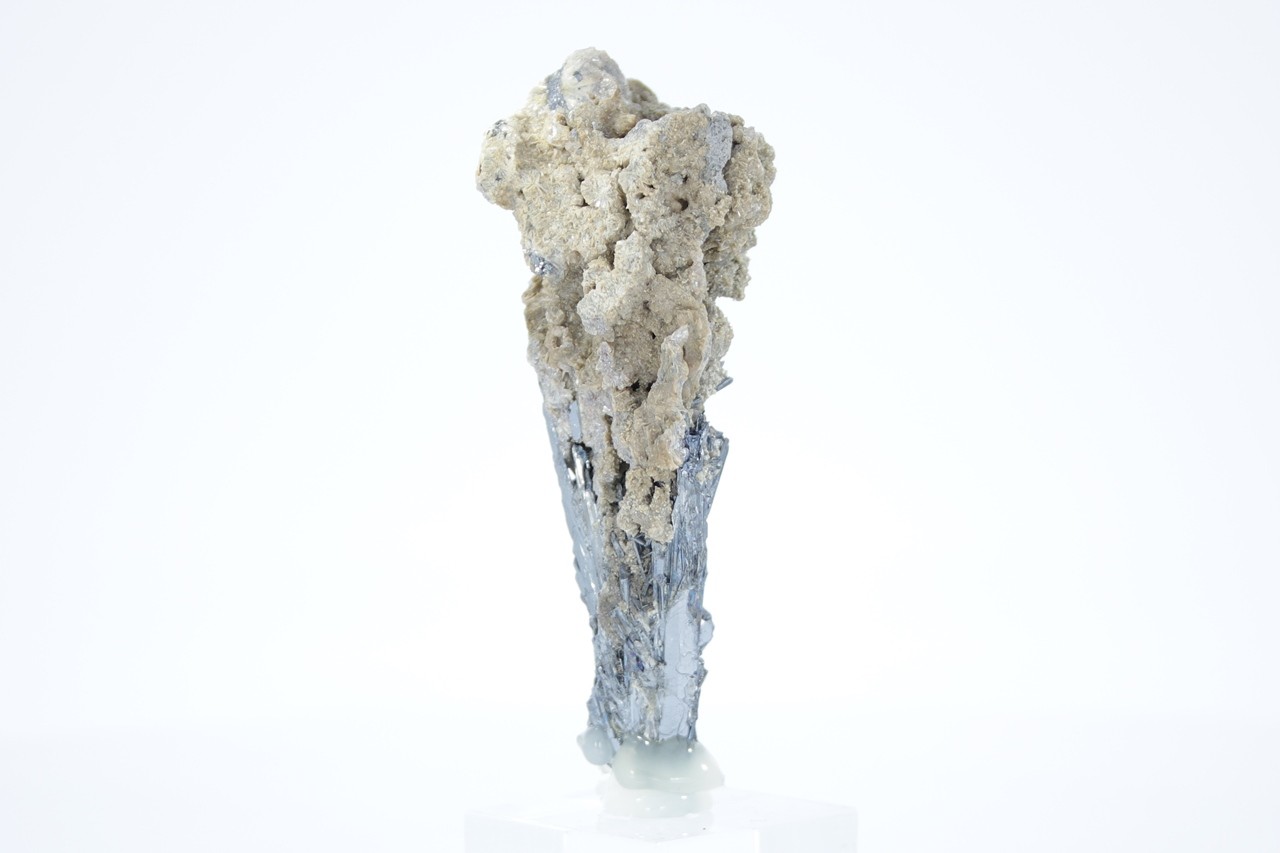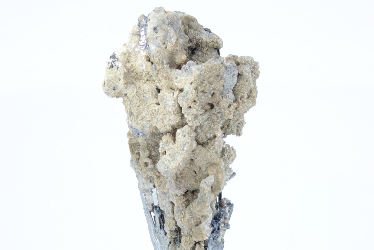 Radial verzahntes Aggregat von metallisch glänzenden Antimonit-Kristallen überlagert von einem radialen Aggregat beige Valentinit .