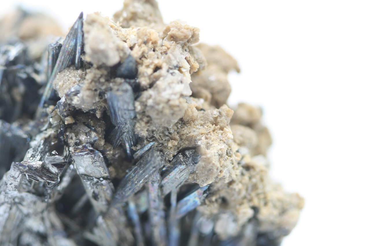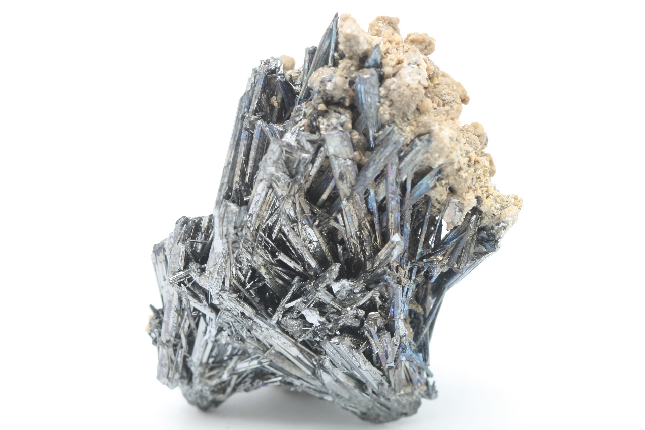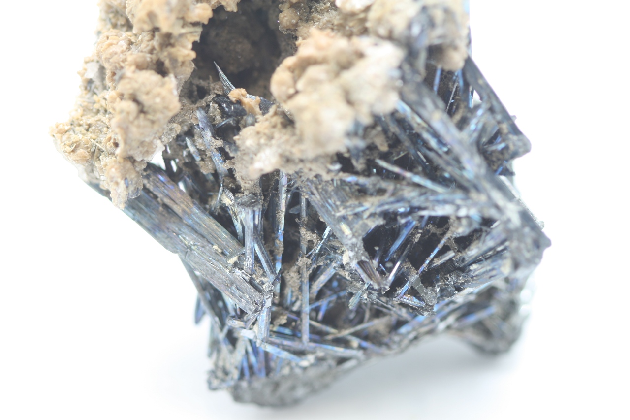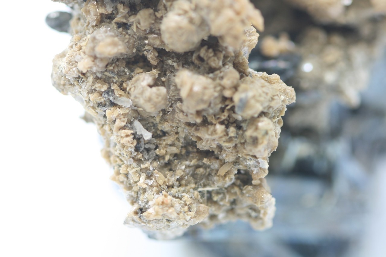 Beige, tafelförmige Kristalle und radiale Aggregate von Antimonoxid.