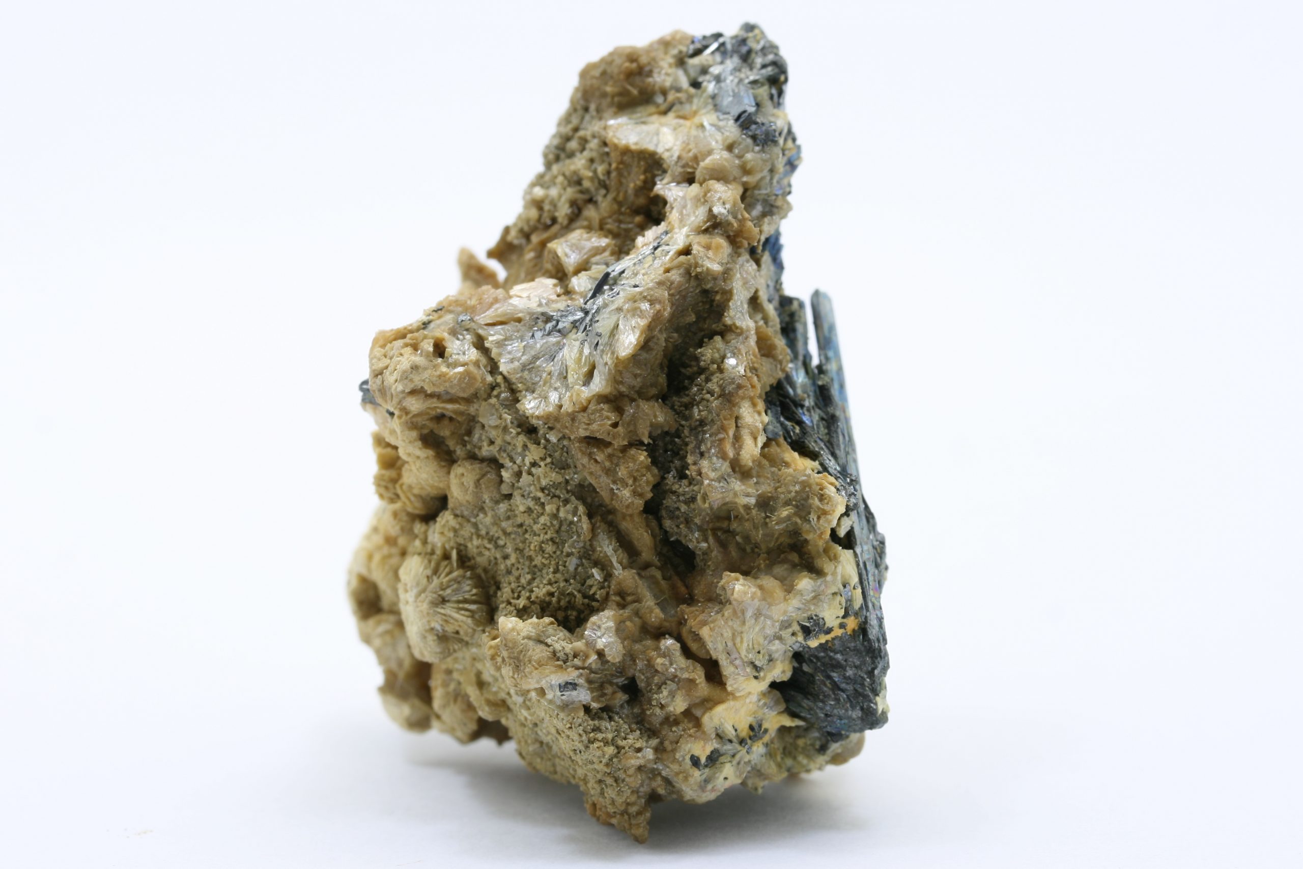 Beigefarbige, tafelförmige Kristalle und radiale Aggregate von Antimonoxid – Valentinit mit metallisch glänzenden Kristallen von Antimonit. Der größte Antimonit-Kristall ist 2 cm lang.