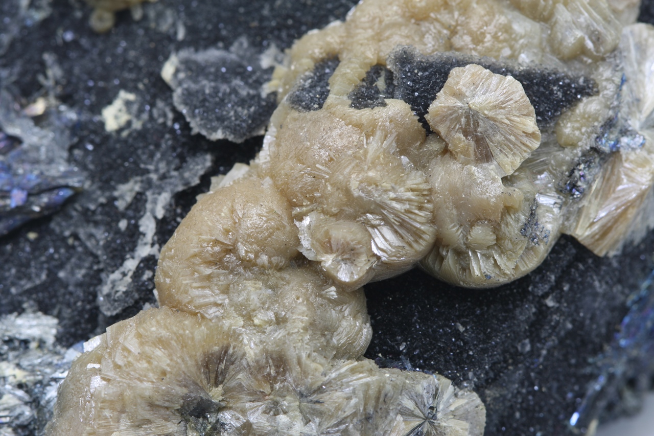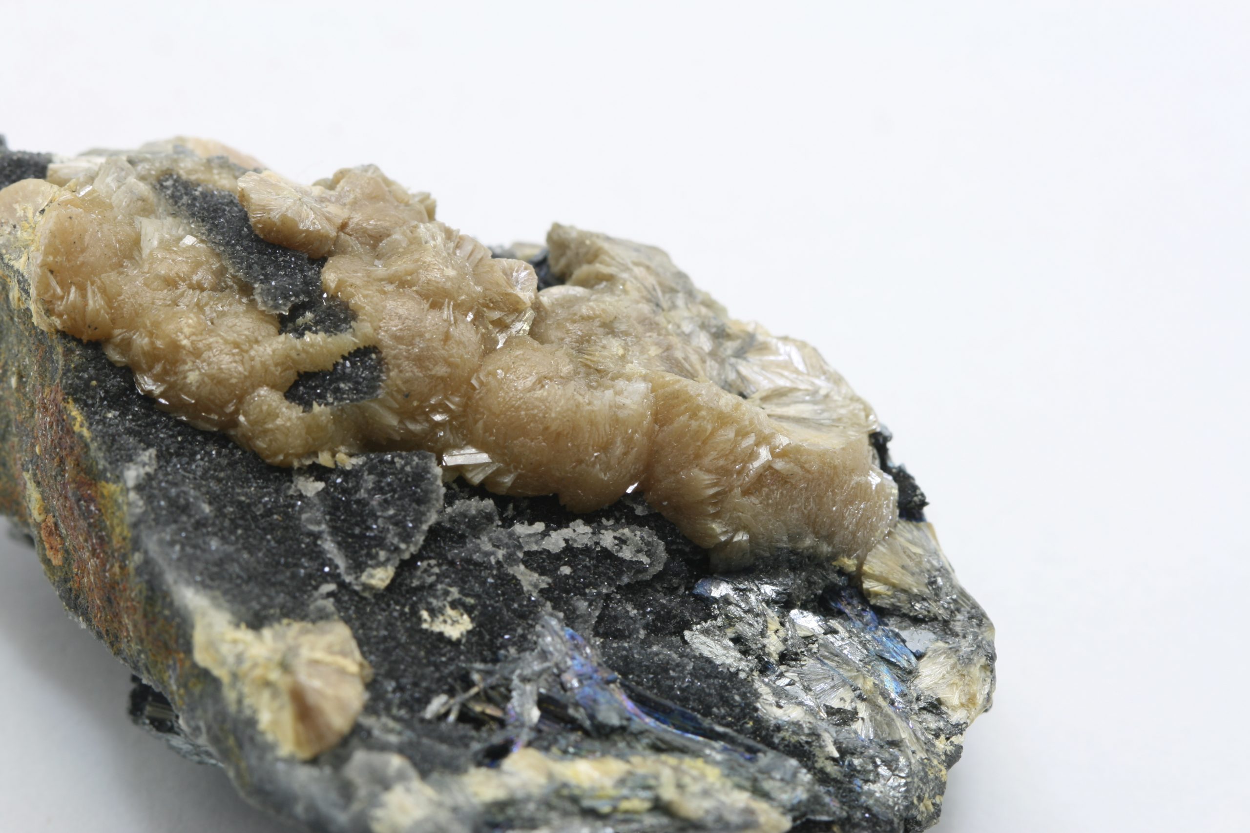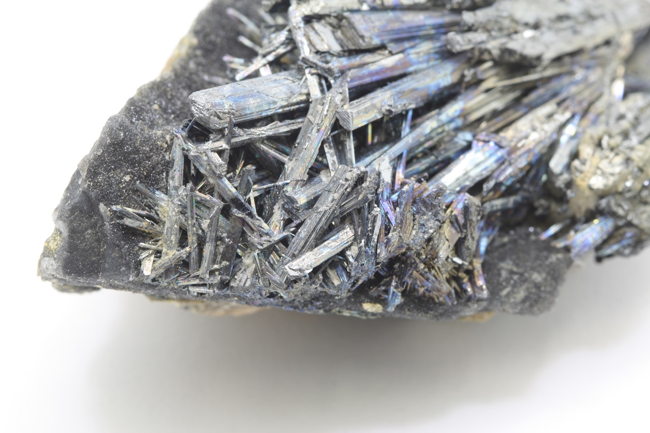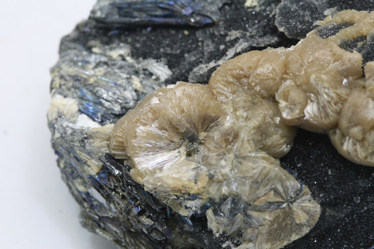 Schöne beidseitige Stufe mit einer Seite Valentinit und auf der anderen Seite Aggregaten von Antimonitkristallen .