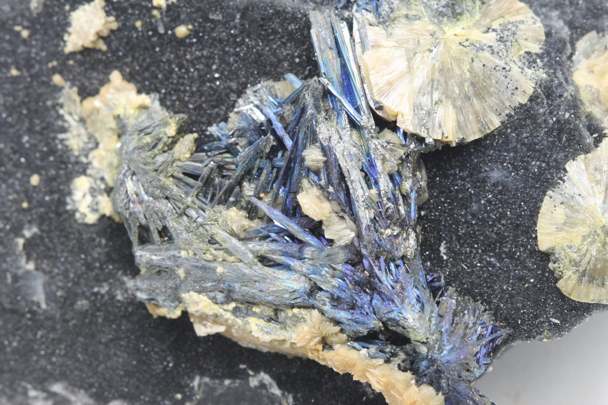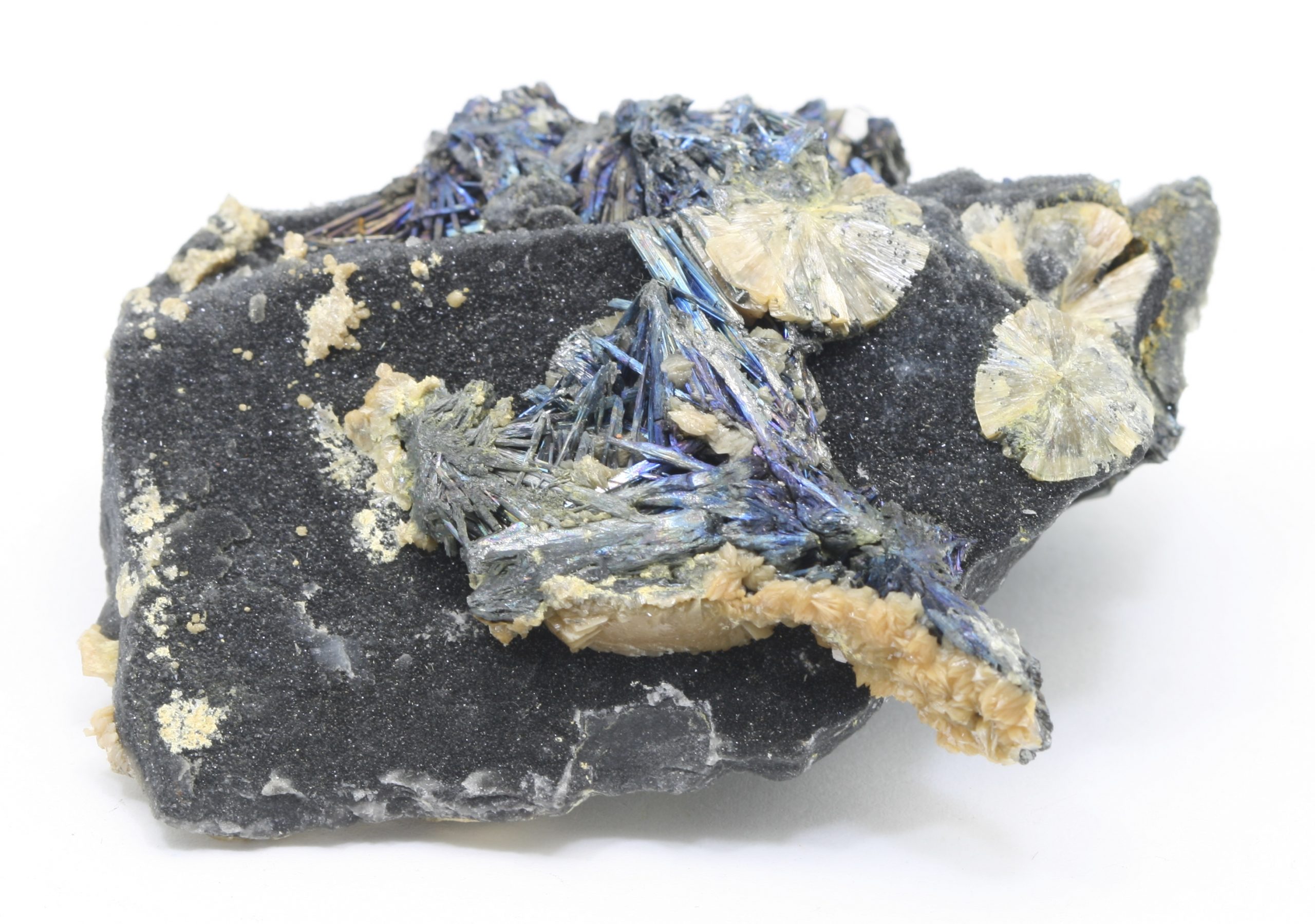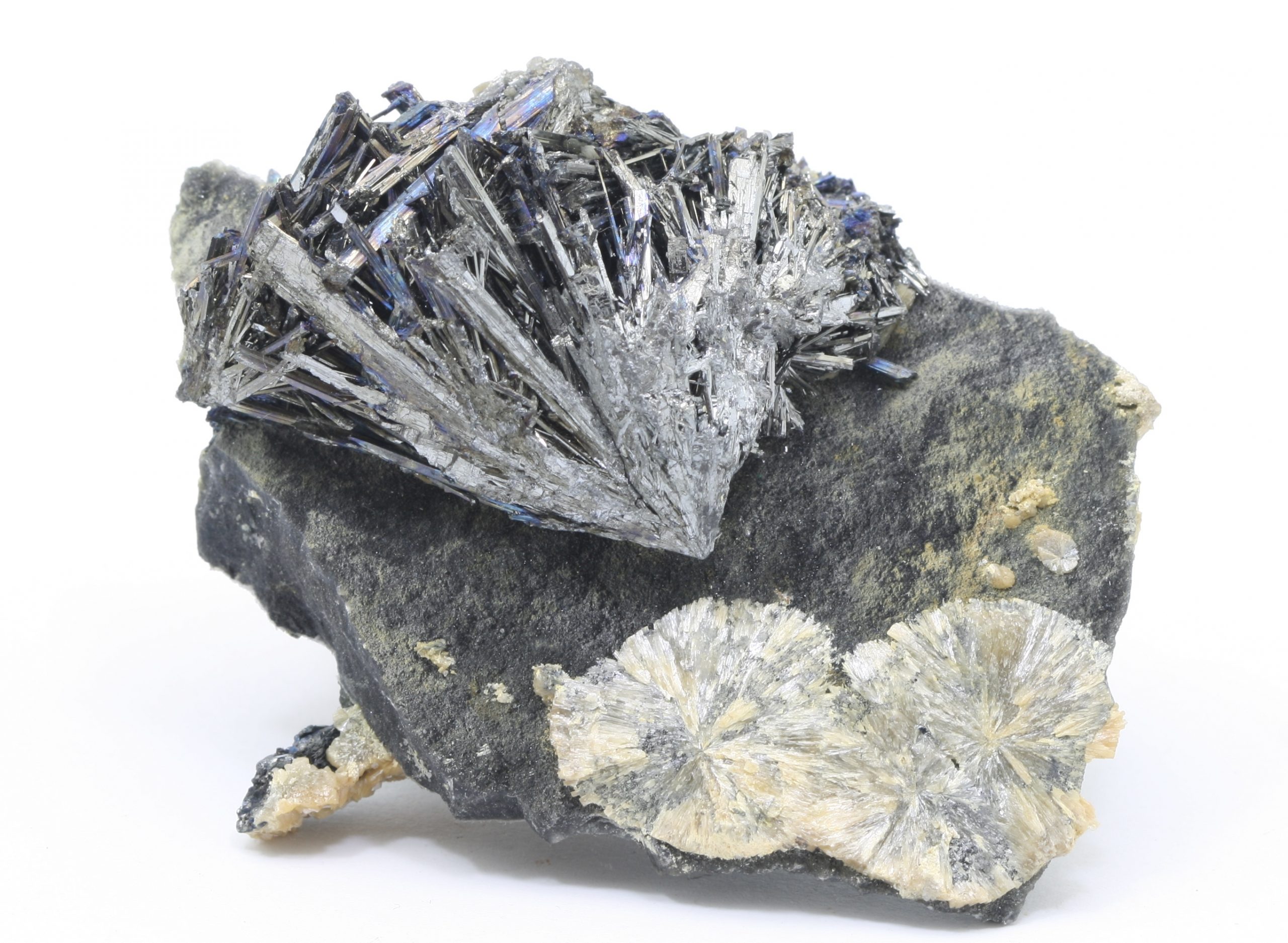 Wunderschöne Stufe von radialstrahligen Aggregaten des Valentinit mit Aggregaten von Antimonit. Antimonit ist gewachsen auf einer Matrix von gerade Valentinit!