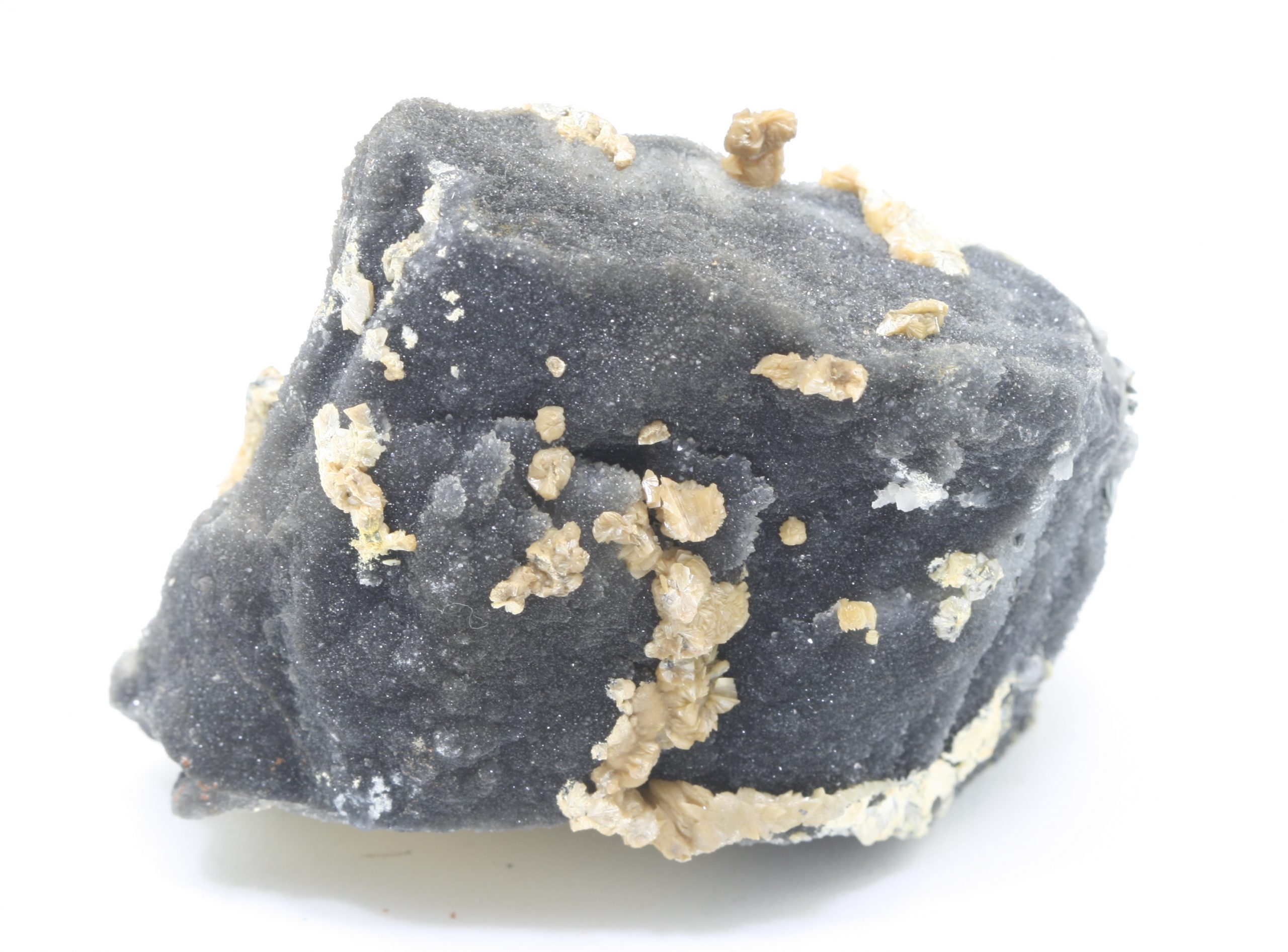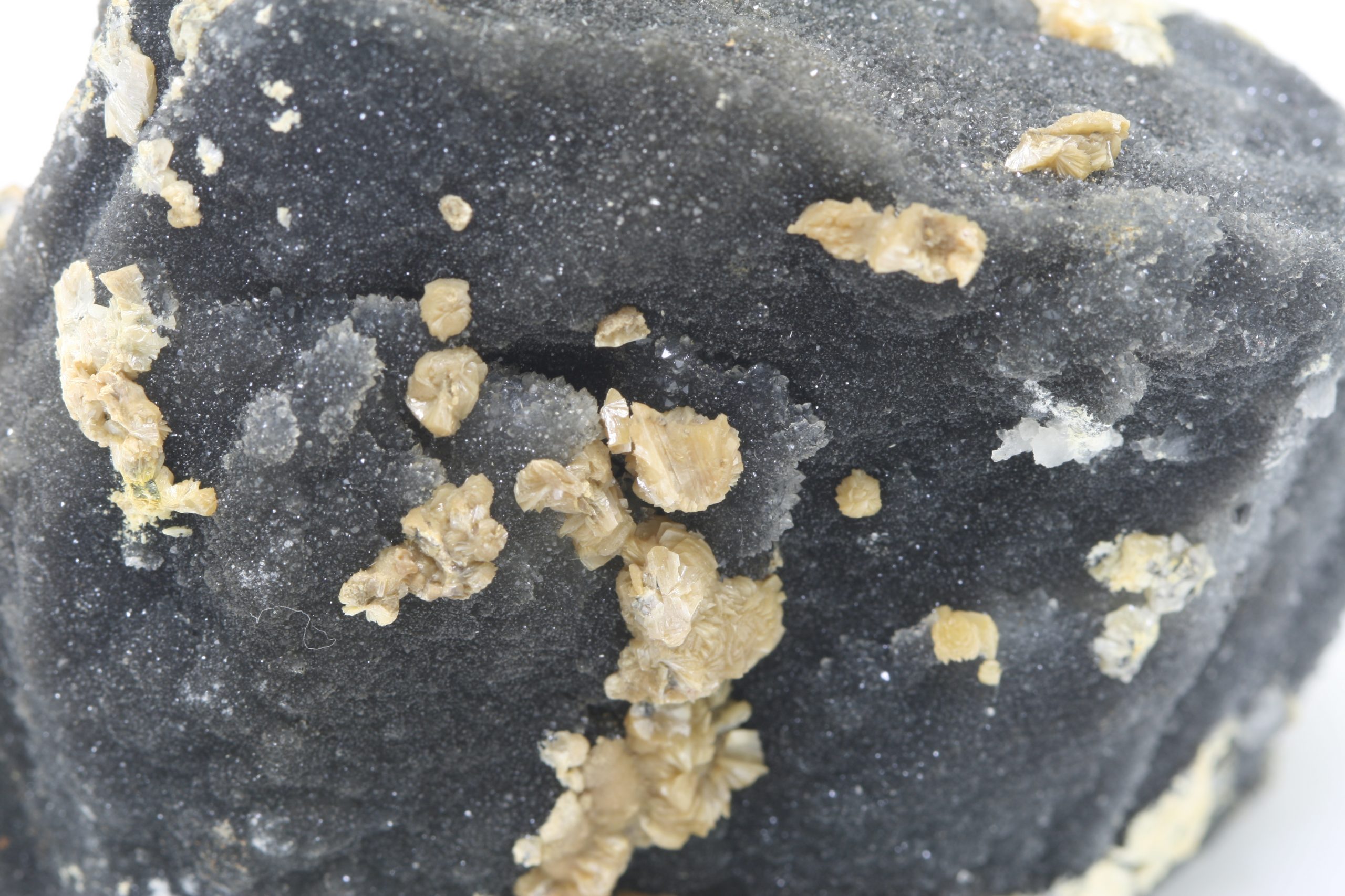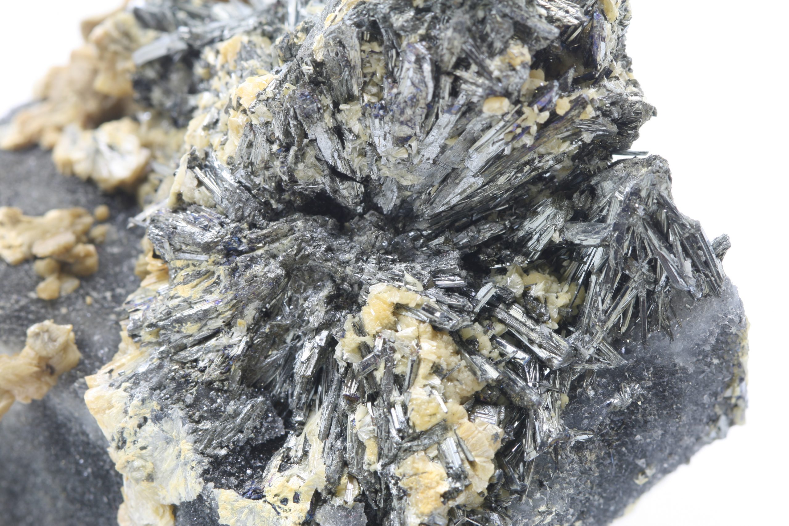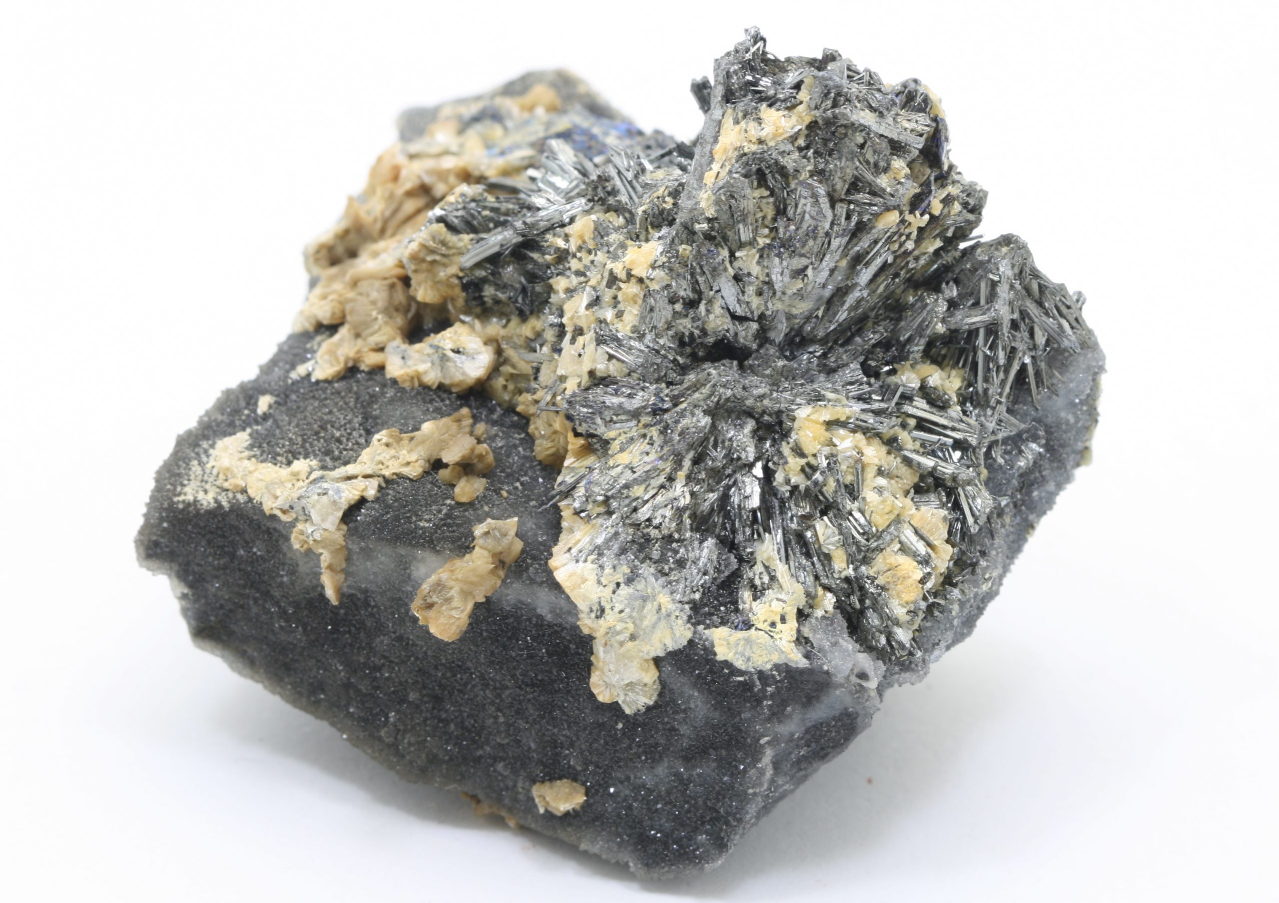 Beige radialartige Aggregate aus Antimonoxid – Valentinit, durchwachsen auf säulenförmigem Antimonit.