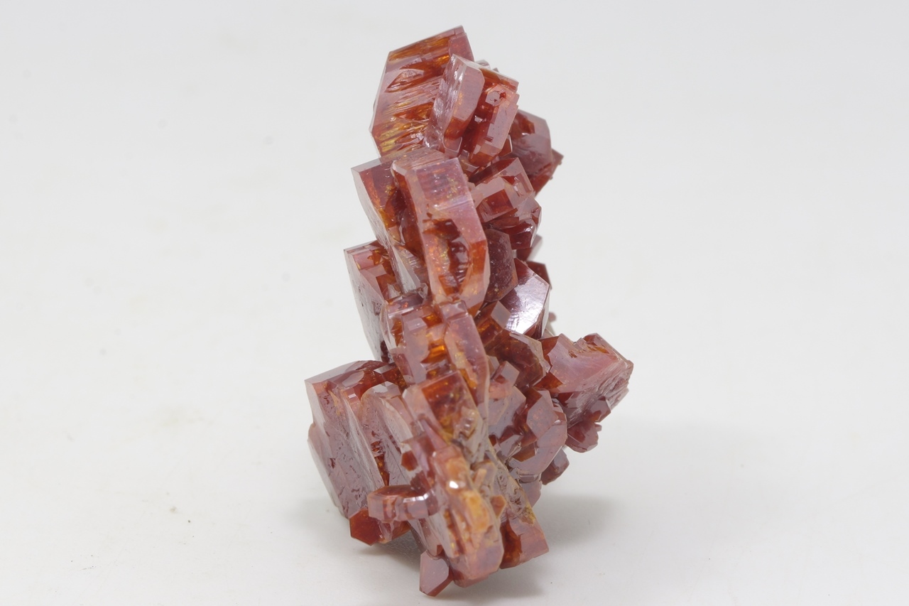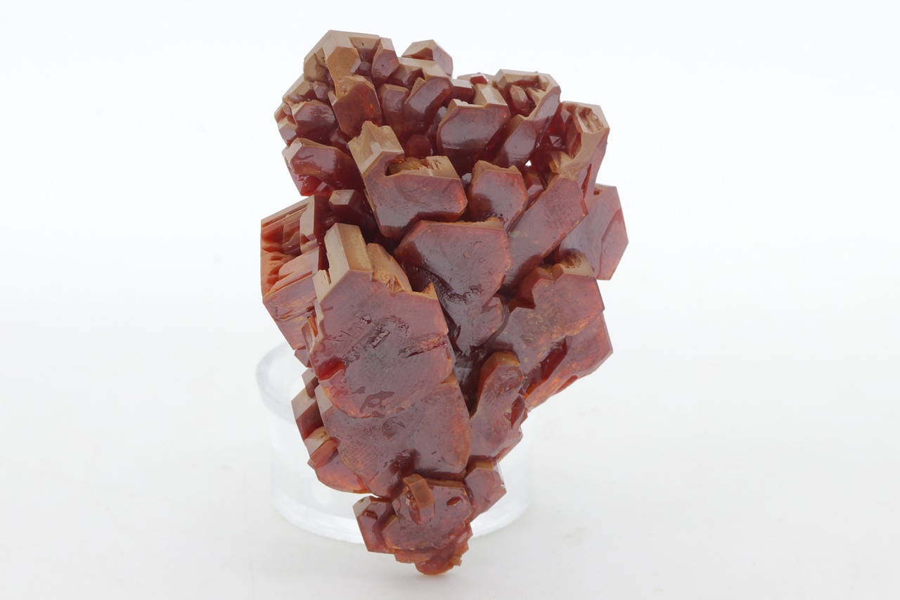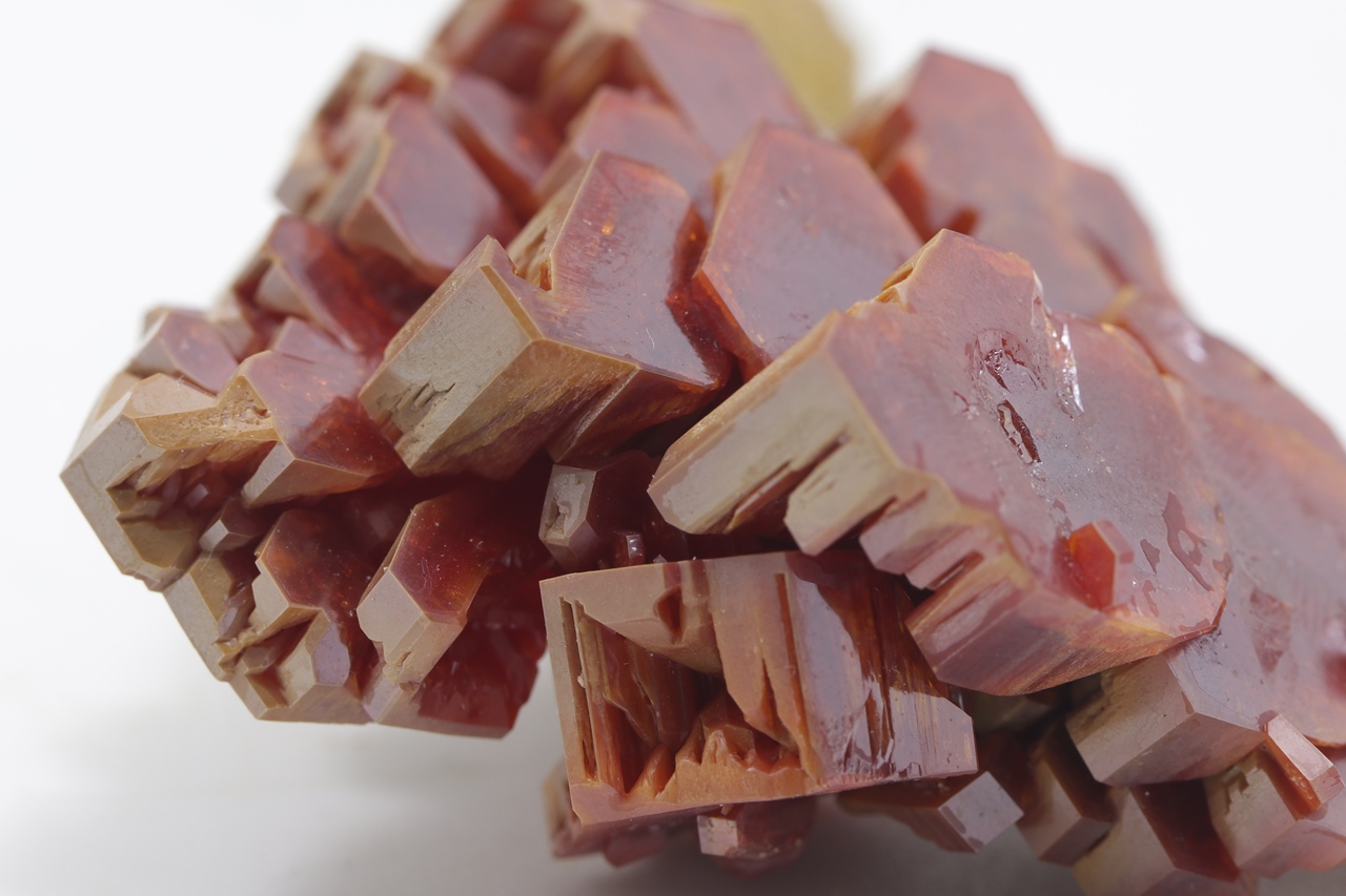 Prächtiger intensiv roter Vanadinit mit einzigartiger skelettartiger Entwicklung hypoparareller Kristalle, die zu einem dendritischen Aggregat verwachsen sind. Das Exemplar ist ein „Floater“, und sogar eine mehrere Millimeter große, kaum sichtbare Fläche, mit der diese „Rose“ ursprünglich mit der Matrix verwachsen war, ist durch Kristallflächen ausgeheilt.