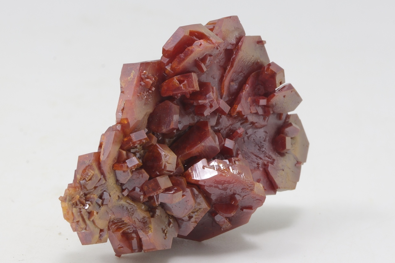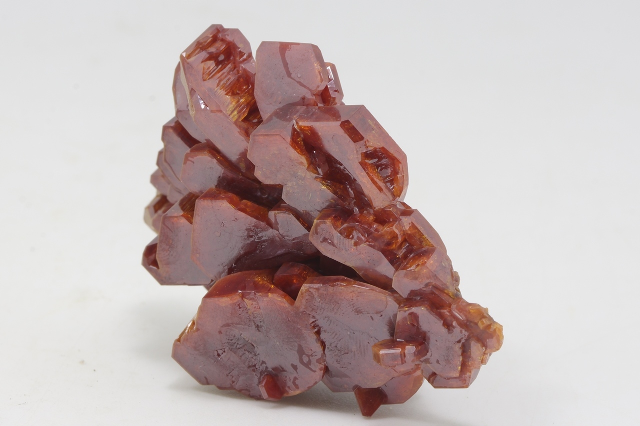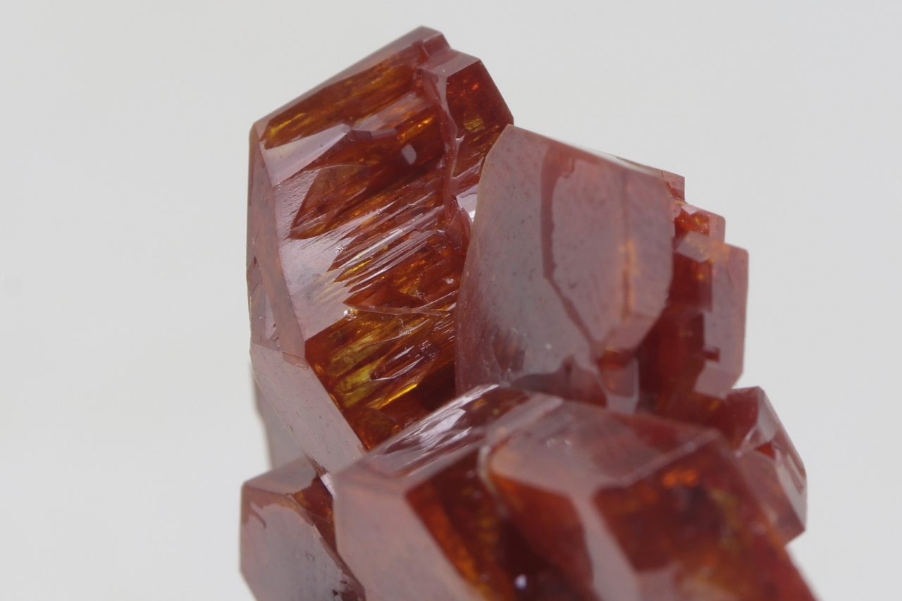Prächtiger intensiv roter Vanadinit mit einzigartiger skelettartiger Entwicklung hypoparareller Kristalle, die zu einem dendritischen Aggregat verwachsen sind. Das Exemplar ist ein „Floater“, und sogar eine mehrere Millimeter große, kaum sichtbare Fläche, mit der diese „Rose“ ursprünglich mit der Matrix verwachsen war, ist durch Kristallflächen ausgeheilt.