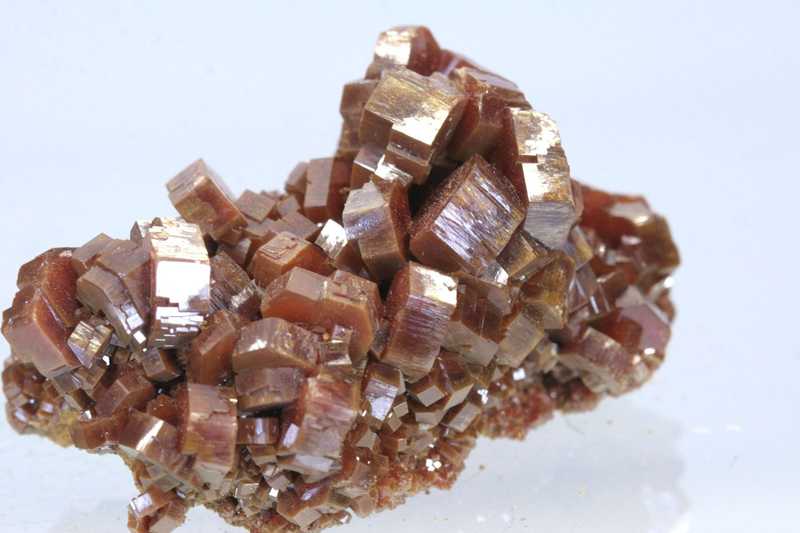 Ästhetische Druse von bis zu 12 mm großen, perfekt begrenzten Kristallen des seltenen Blei-Vanadats Vanadinit. Hochwertige Druse von größeren leuchtend roten, glänzenden Vanadinit-Kristallen aus Marokko.
