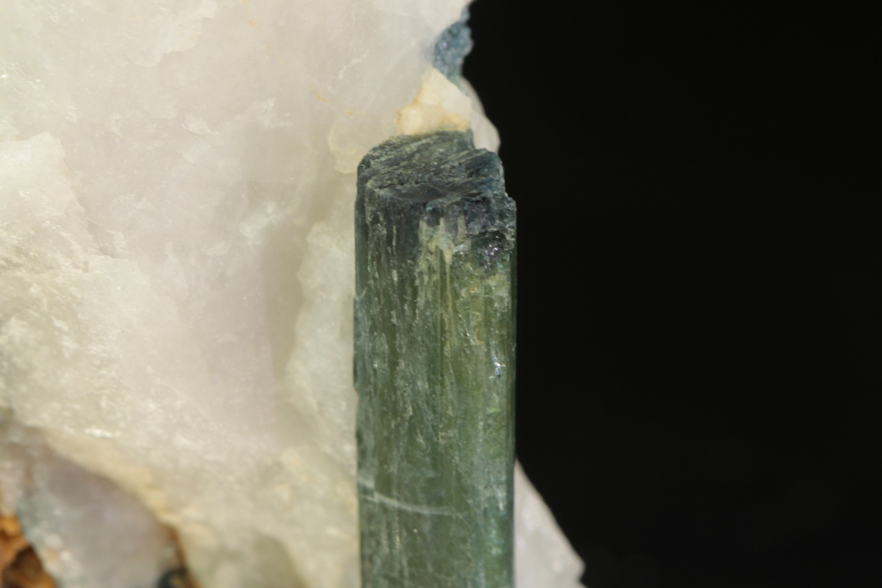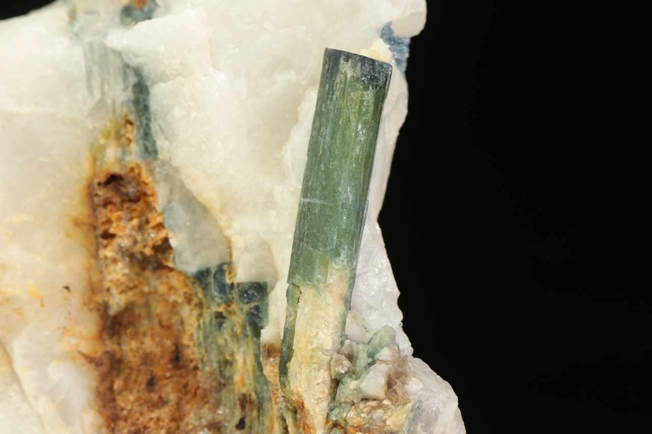 Dreizentimetergroßer Kristall des grünen Turmalins in kontrastierendem weißen Quarz.