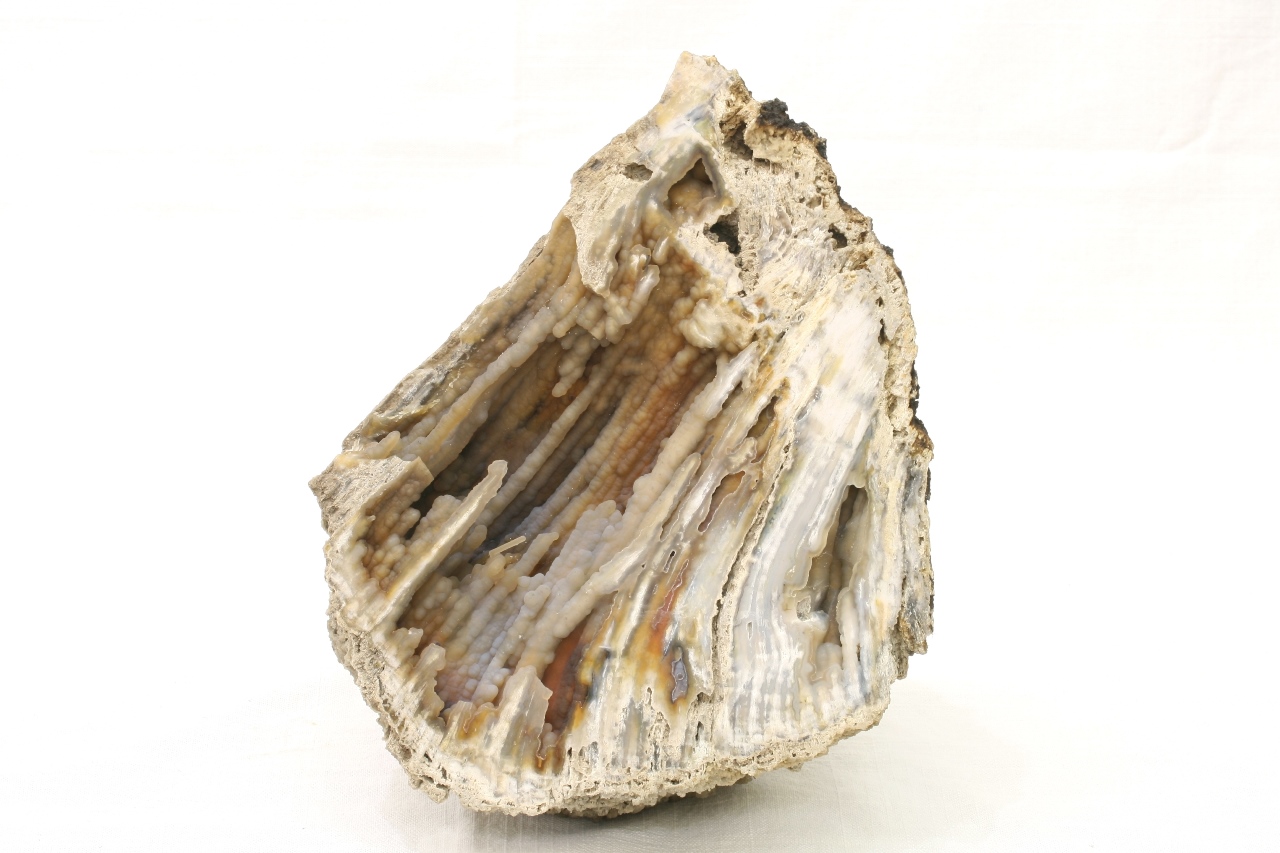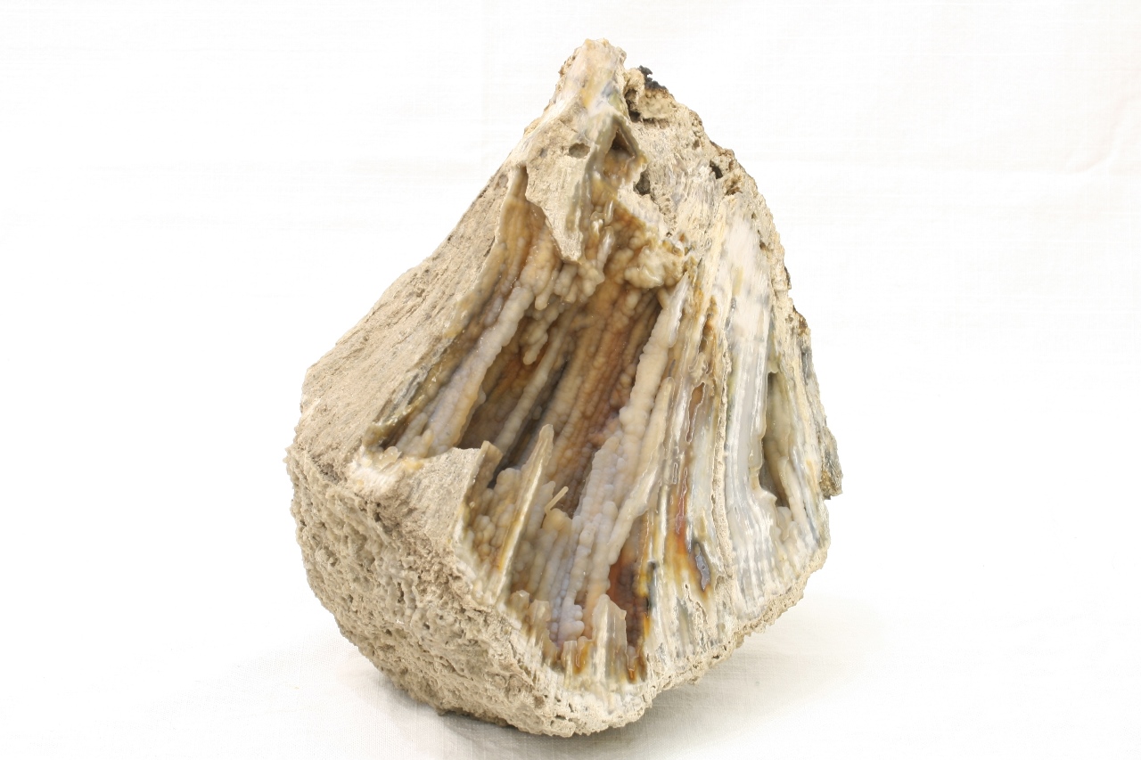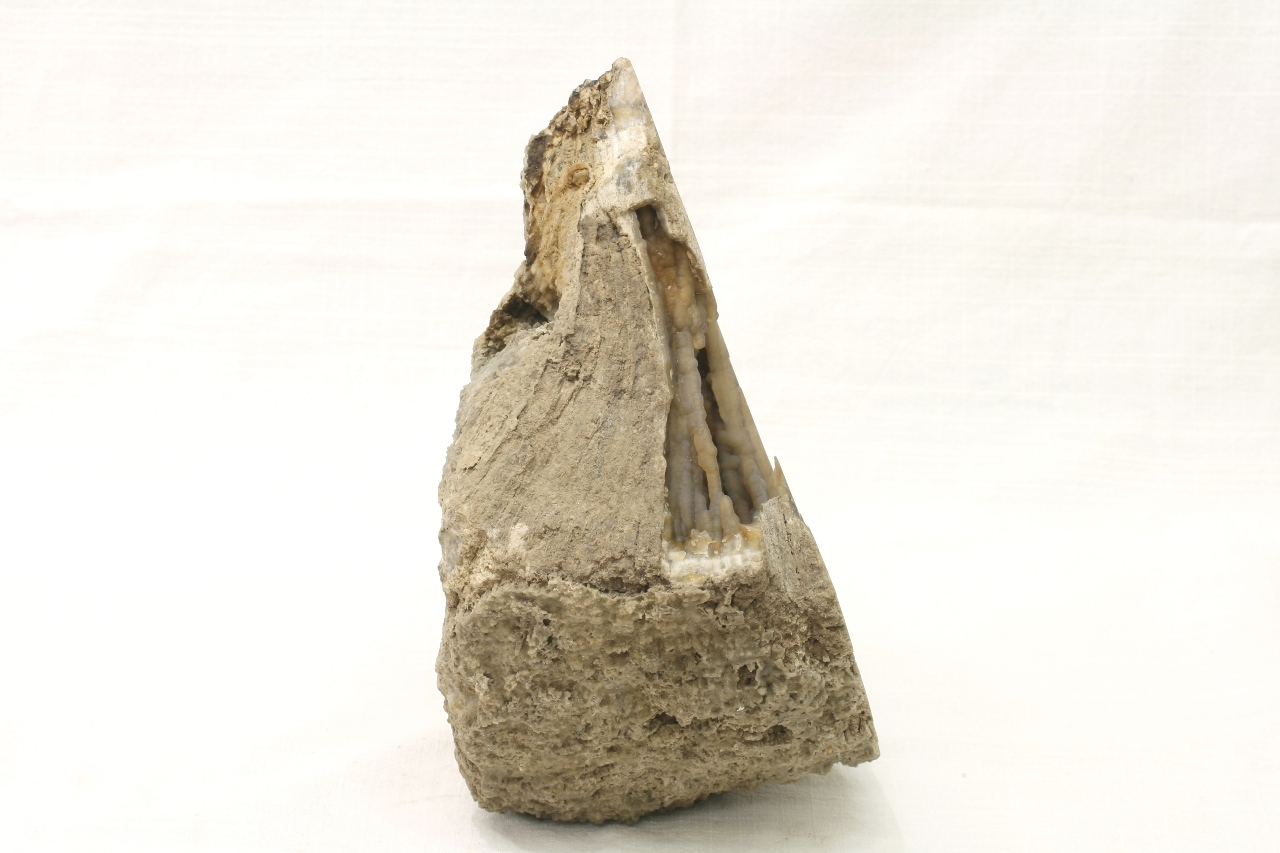 Fossiler Koralle mit einer Höhle, die mit Chalcedon-Stalaktiten gefüllt ist.