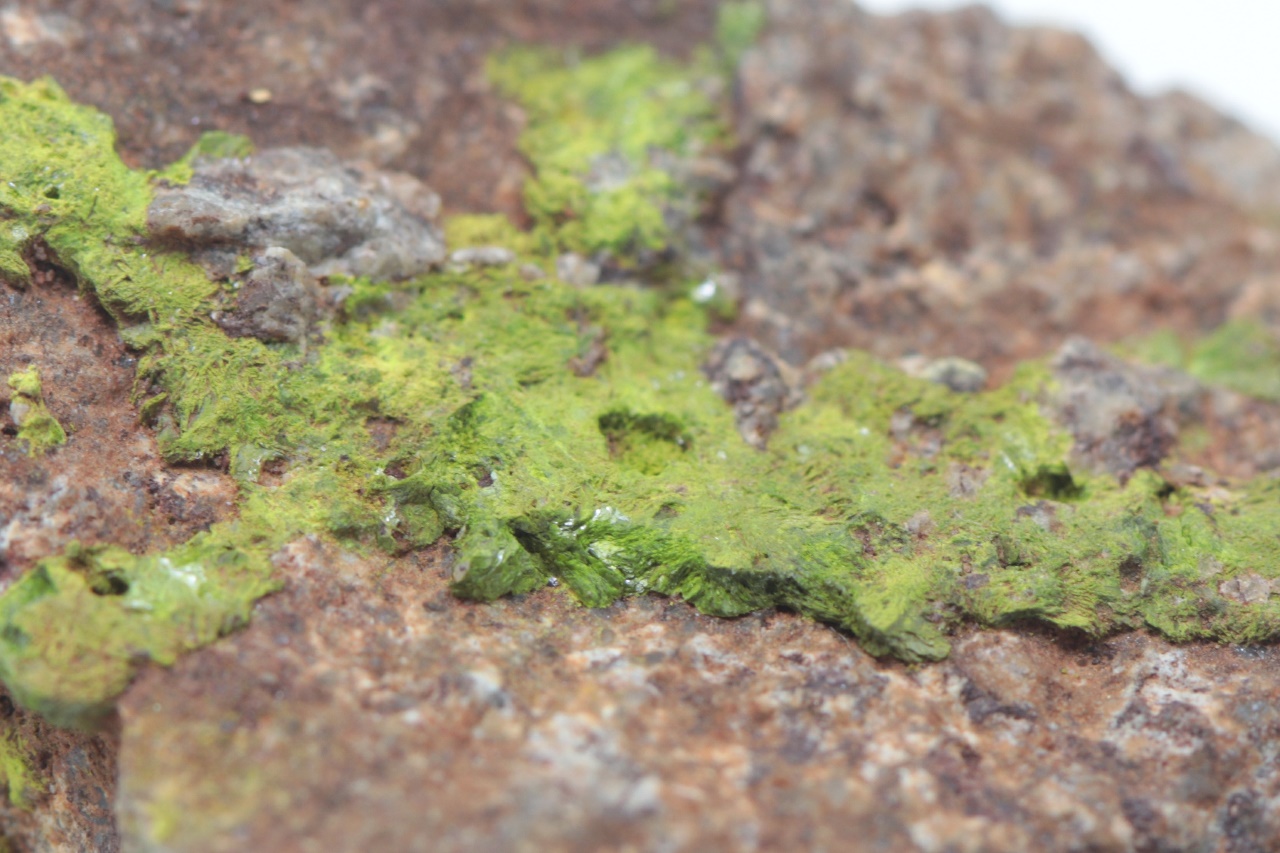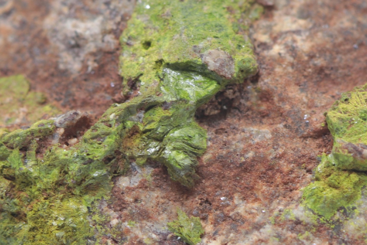 Raumfüllende Aggregate blättriger Kristalle des grünen Vanadats von Kupfer und Baryum.