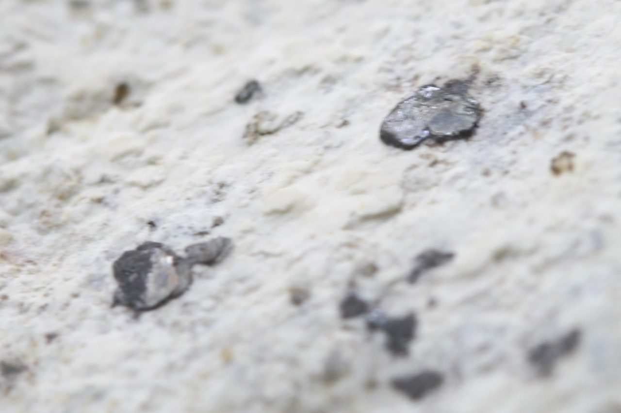 Metallisch glänzende Körner von Tellurid aus der Typlokalität und einzigen Fundstelle. Das größte Korn von Vihorlatit ist 1,5 mm groß.
