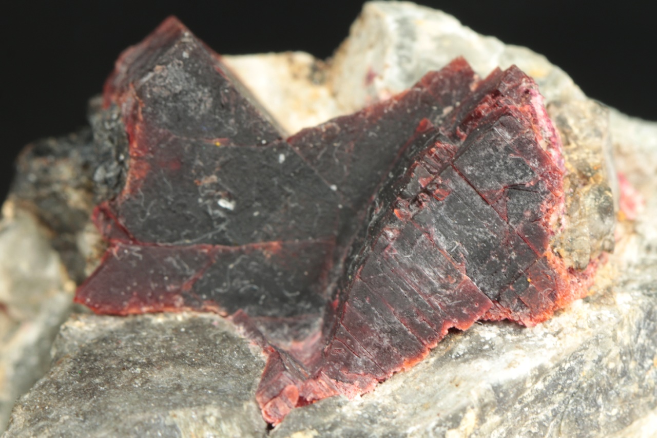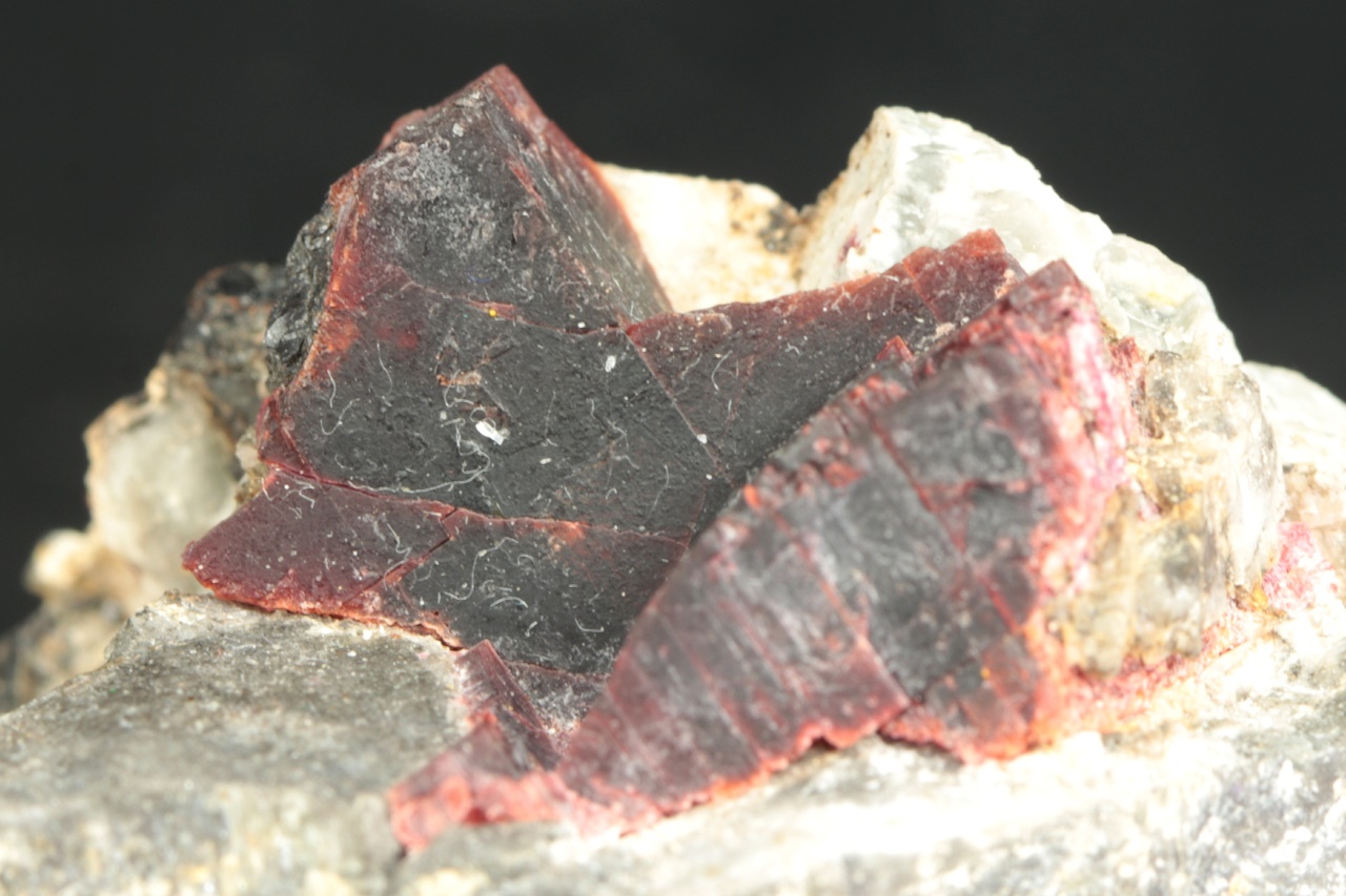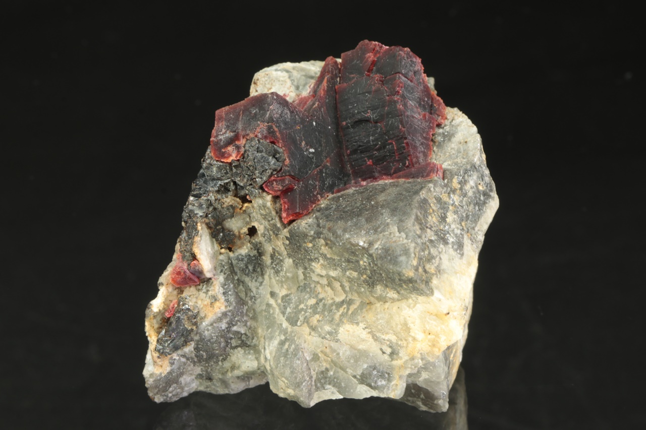 Außergewöhnlich große Kristalle des weinroten Villiamit. Die Größe des Kristallaggregats beträgt 2,5 × 2 cm.