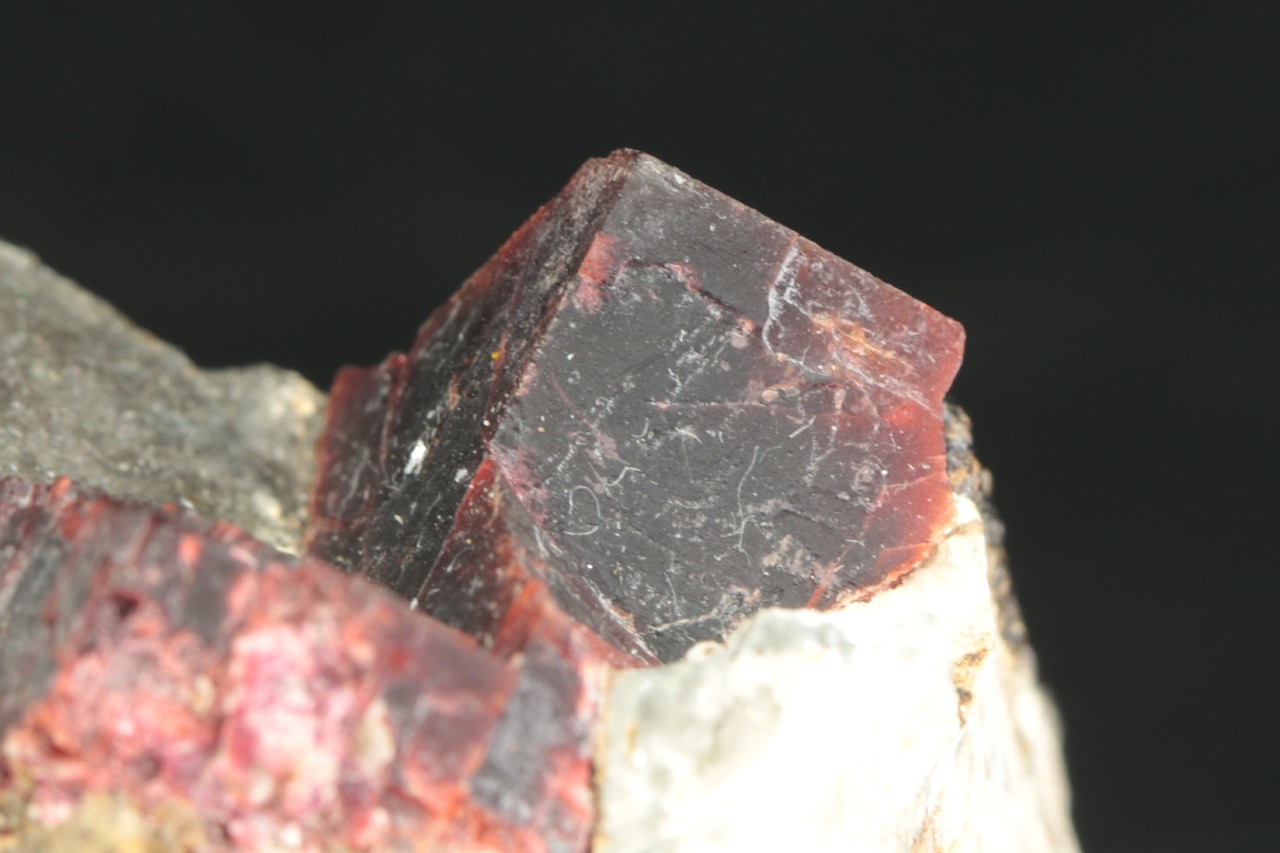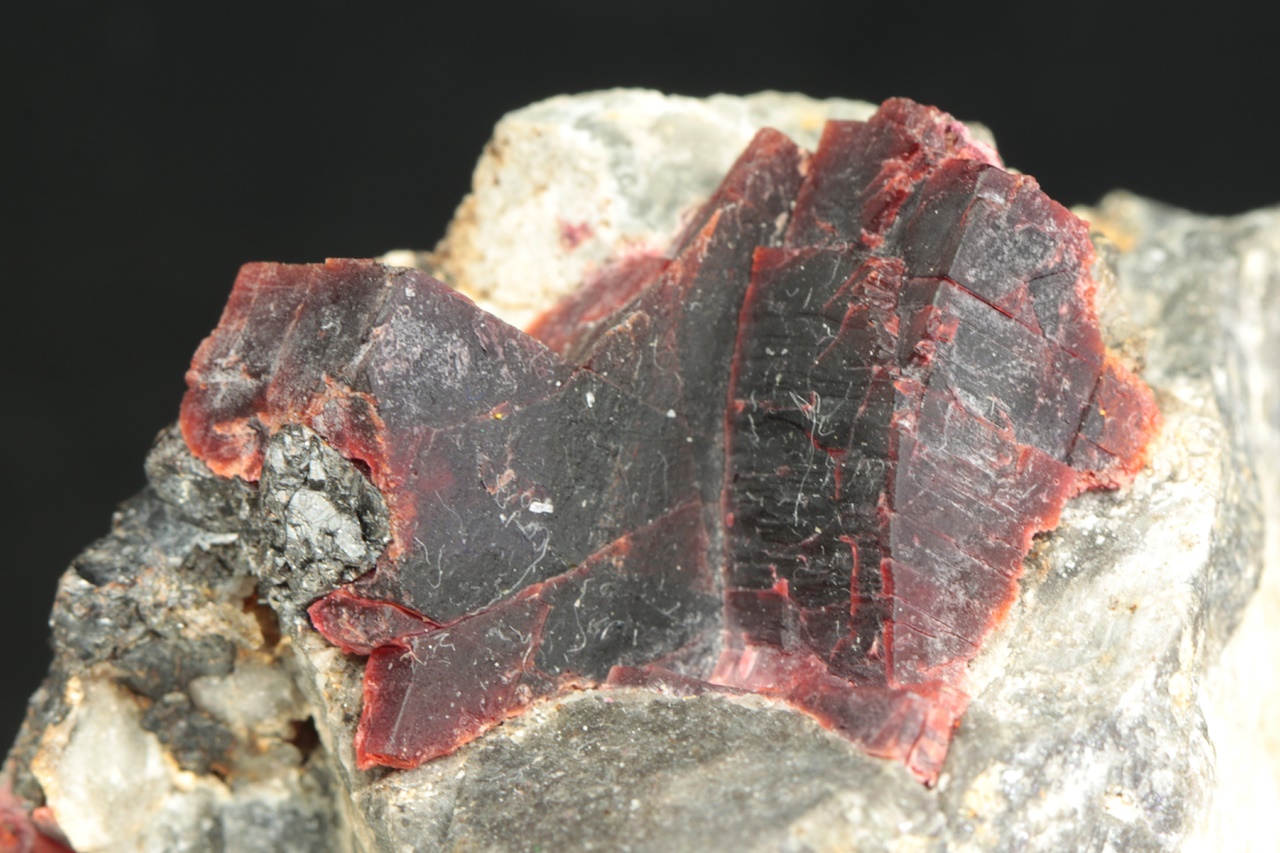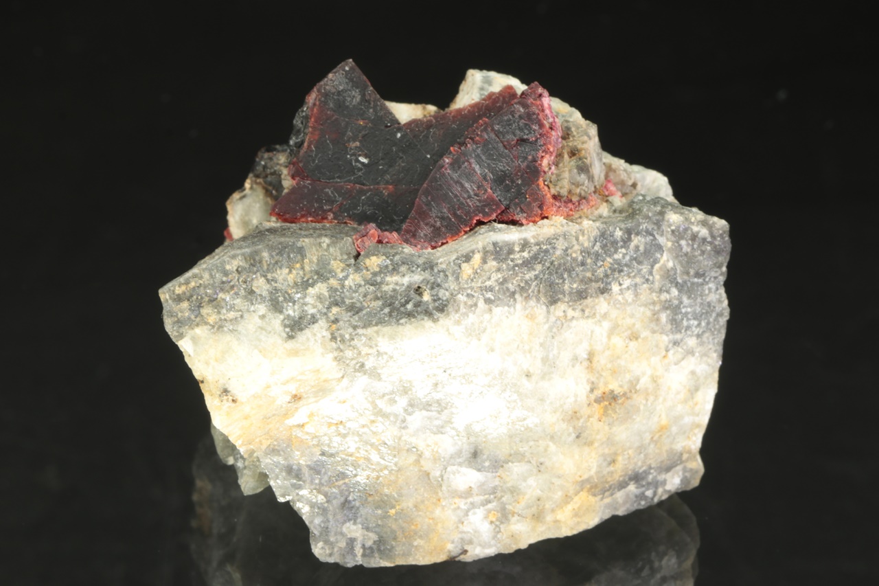 Außergewöhnlich große Kristalle des weinroten Villiamit. Die Größe des Kristallaggregats beträgt 2,5 × 2 cm.
