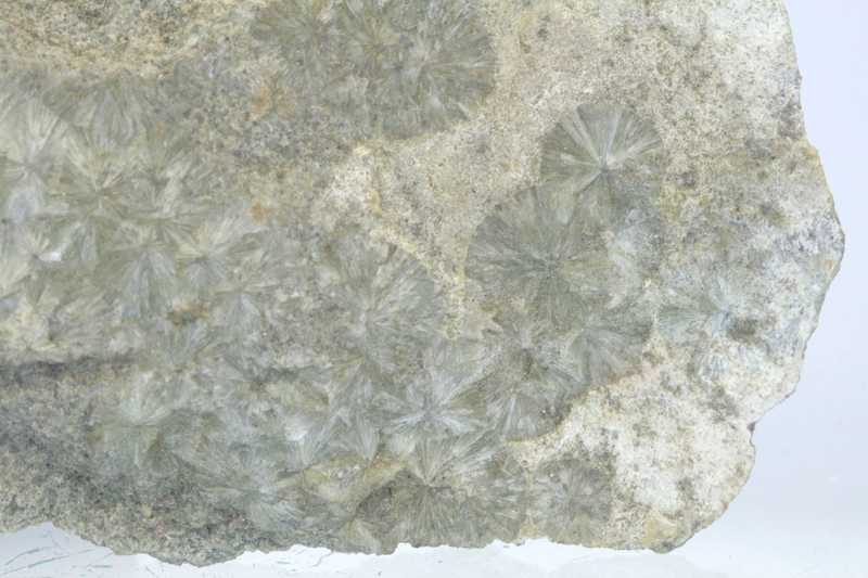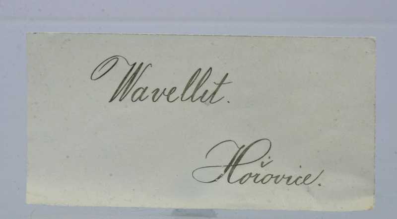 Probe von Wavellit-Phosphat aus Třenice. Historische Probe von typisch radialstrahlig angeordneten Wavellit-Aggregaten aus Hořovice (auf dem alten Zettel als Hořovice bezeichnet, aber sehr wahrscheinlich handelt es sich um Třenice); zu der Probe gehört ein historischer Zettel .