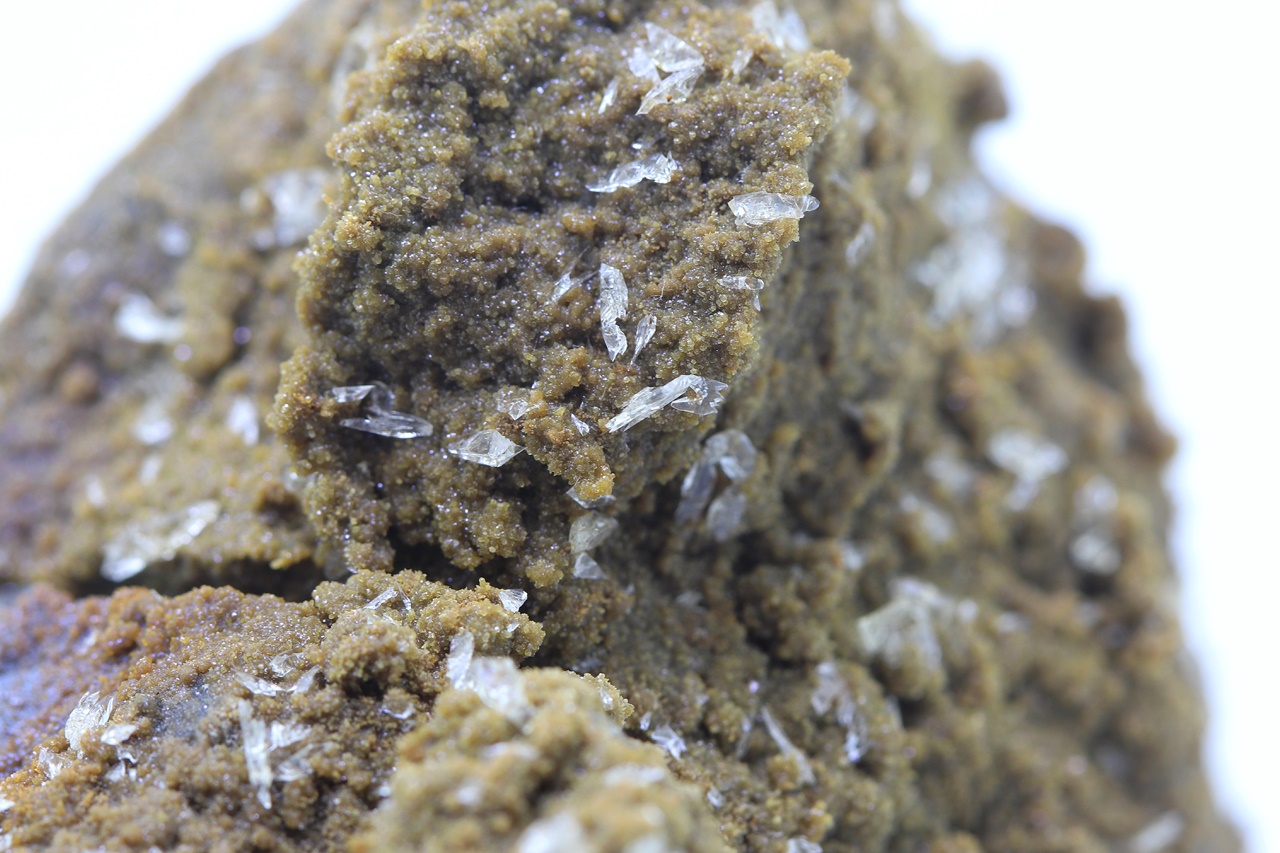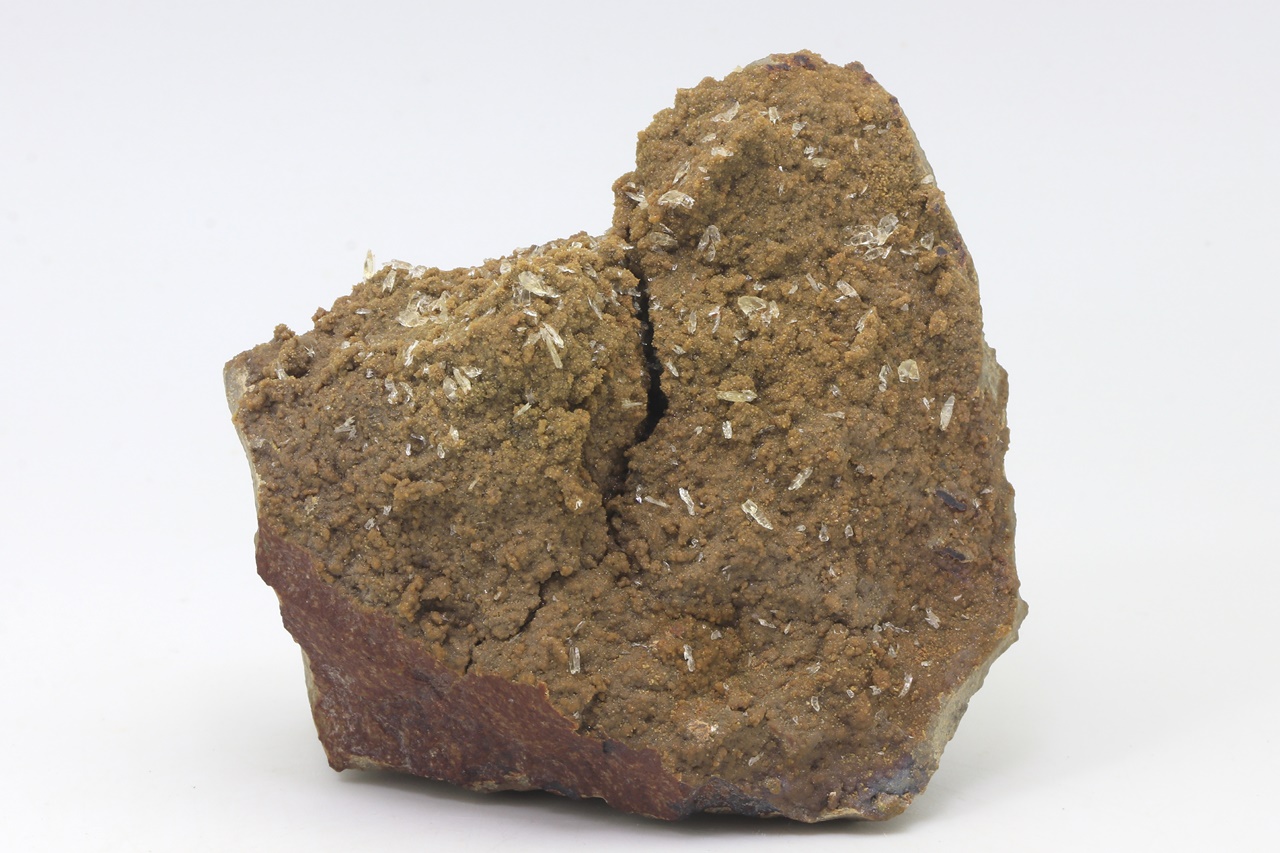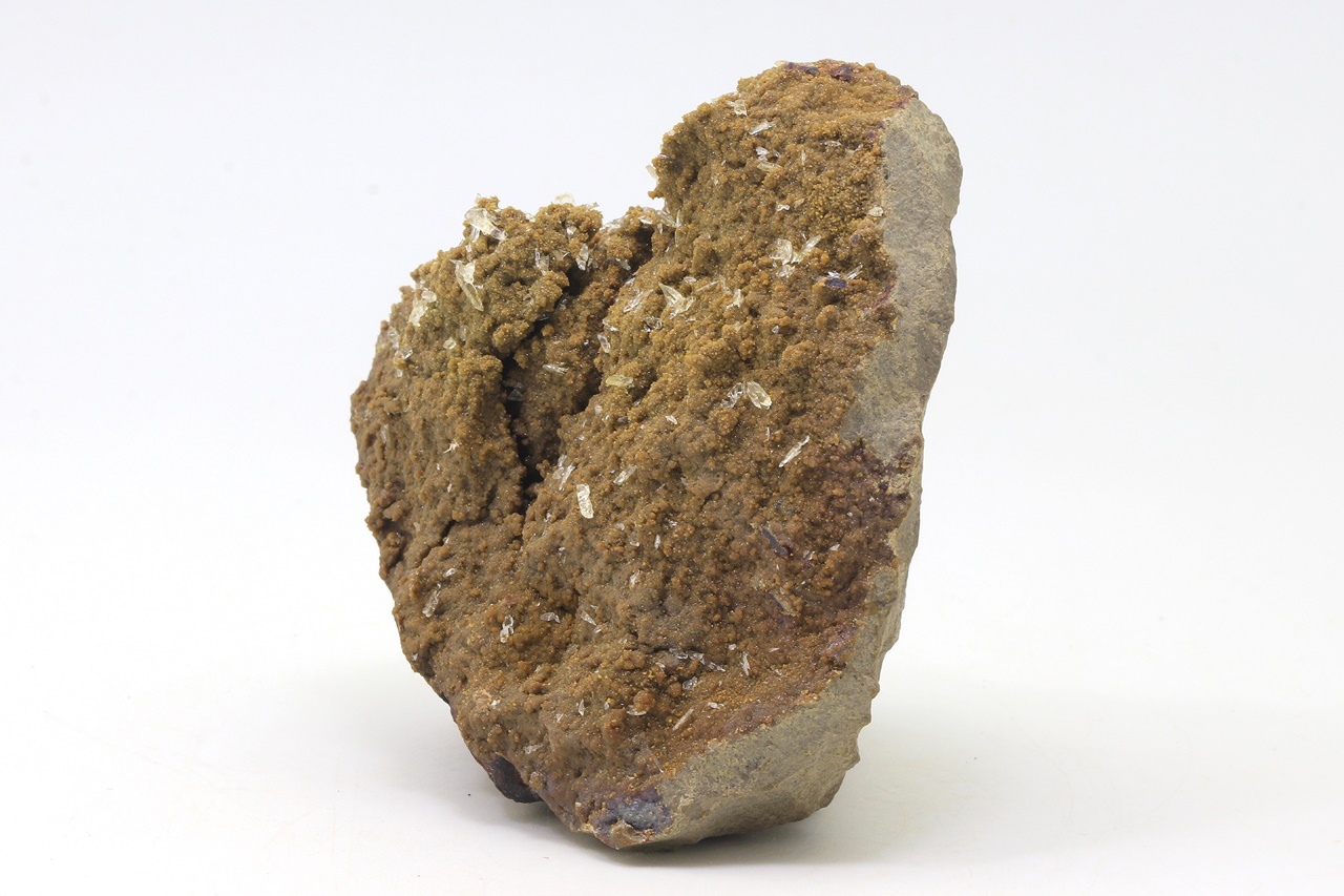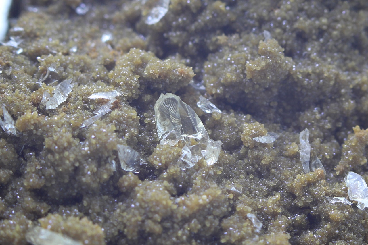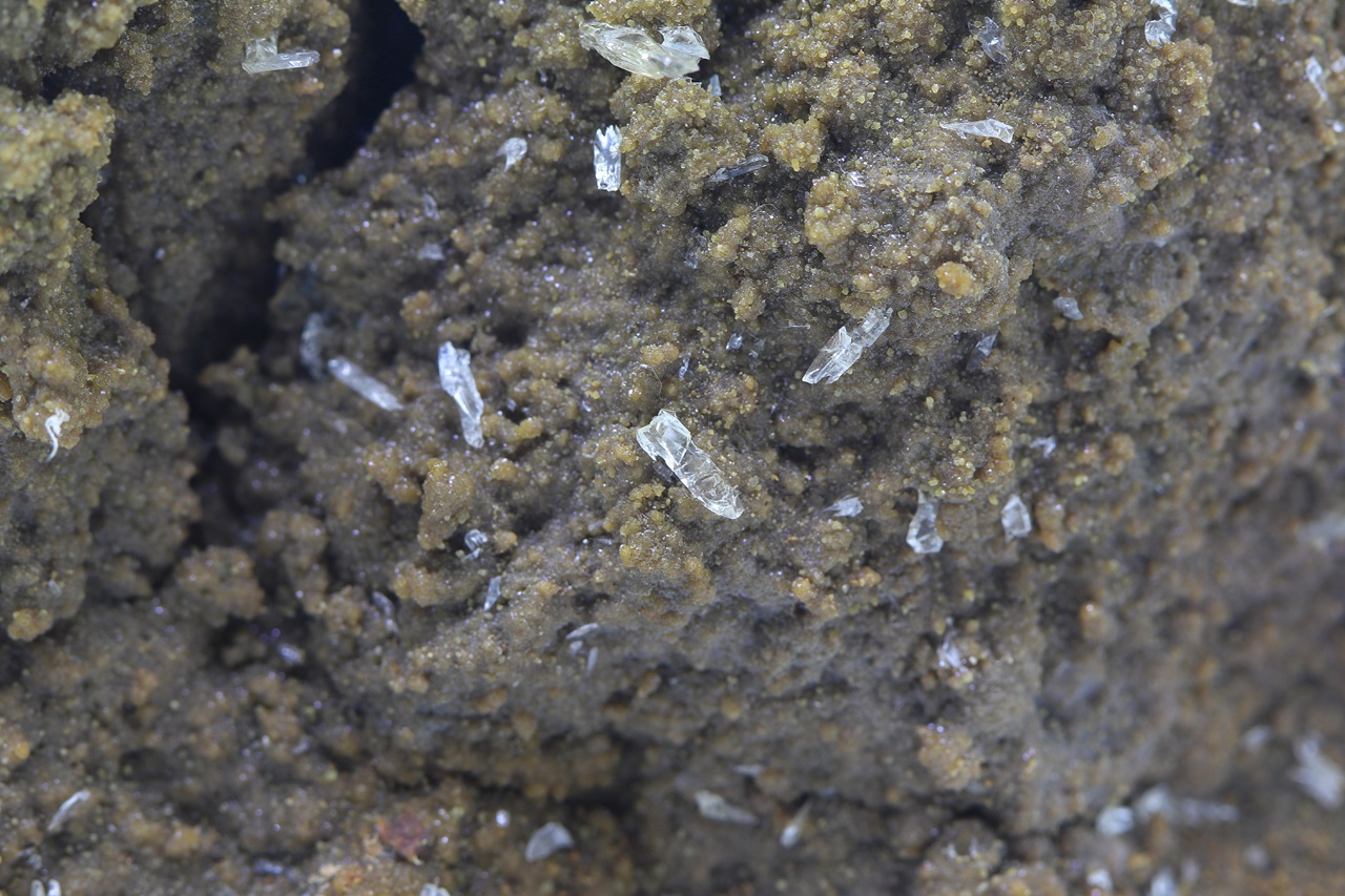 Klare glänzende Whewellit-Kristalle bis zu 4 mm Größe auf kleinen ockerfarbenen Siderit-Kristallen, die in einer Höhlung des Pelosiderits gewachsen sind.