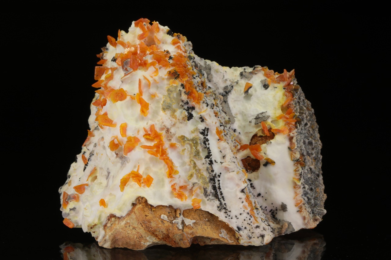 Intensiv orangefarbene, etwa 5 mm große, tafelförmige Wulfenit-Kristalle, gewachsen auf weißem feinkörnigen Aragonit.