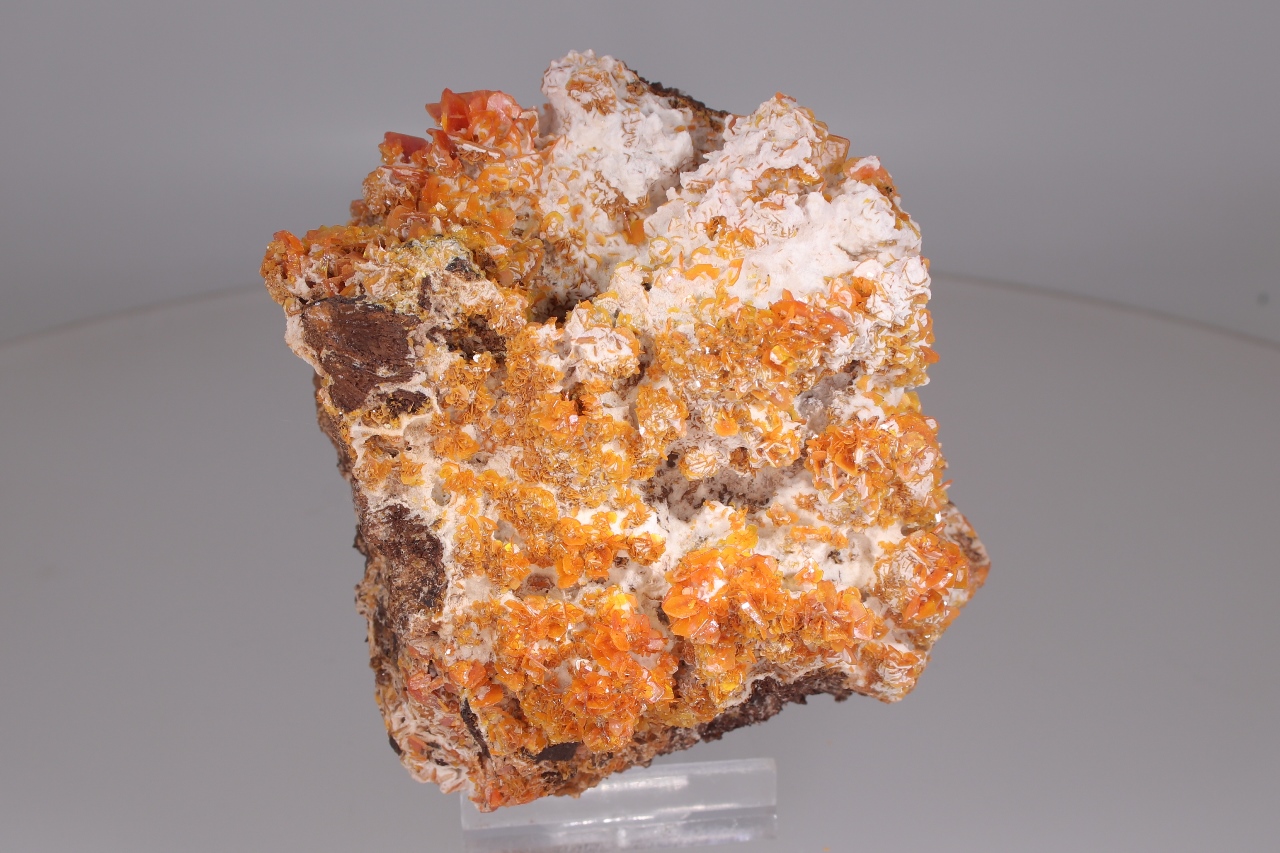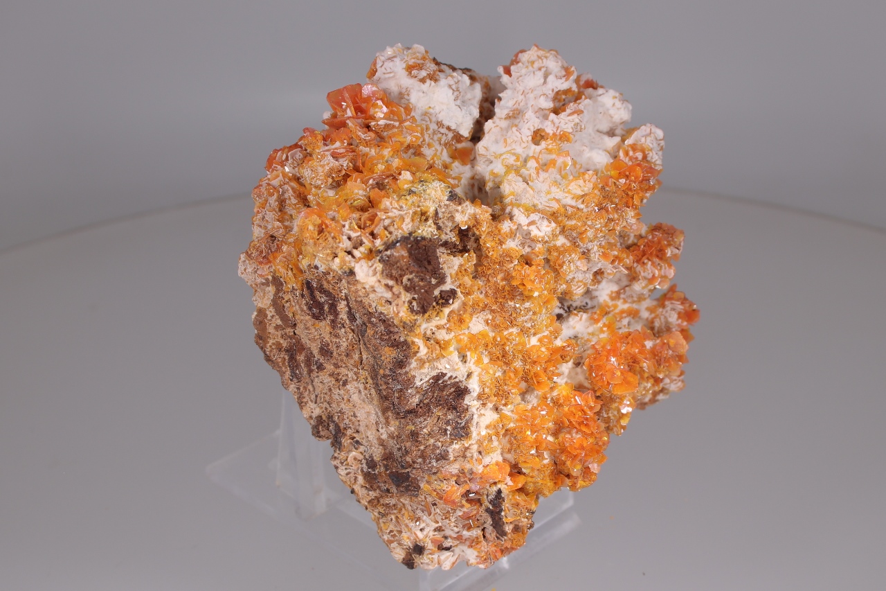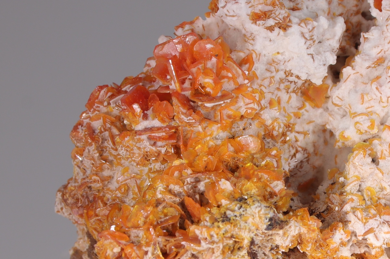 Reiche Druse von unbeschädigten, glänzenden, tafelförmigen Kristallen von intensiv orange gefärbtem Wulfenit, die aus kontrastierendem weißen Aragonit herausragen. Die größten Wulfenit-Kristalle sind bis zu 7 mm groß .