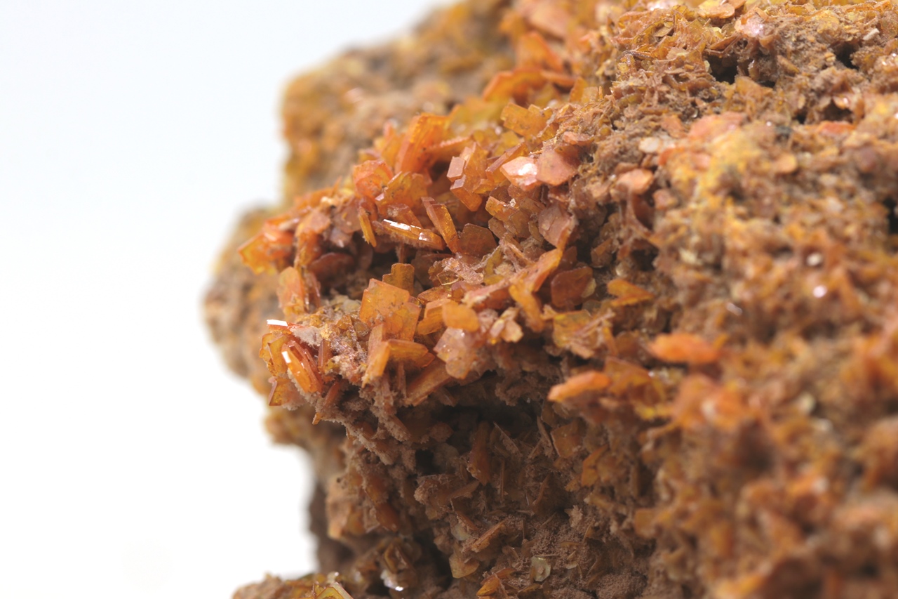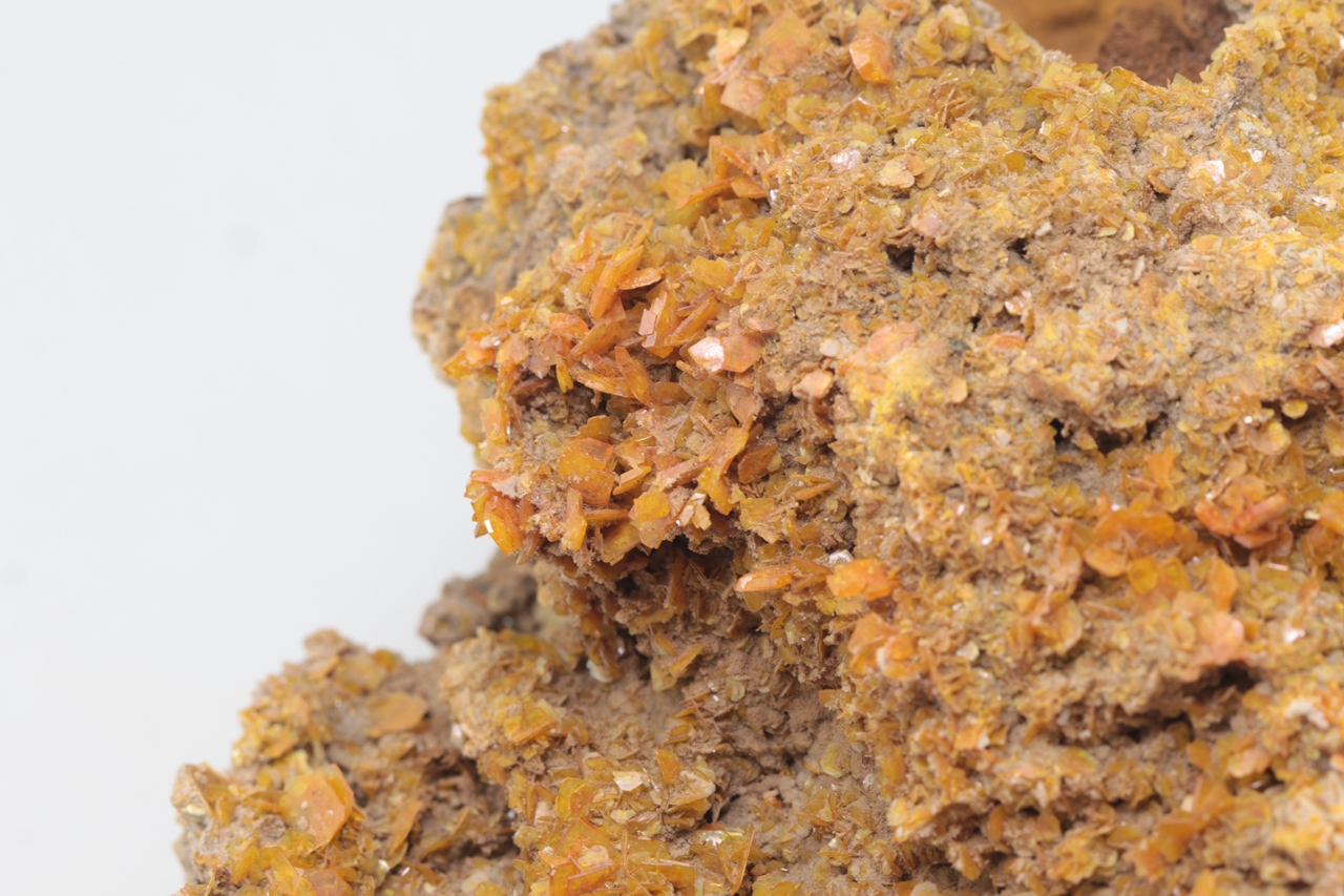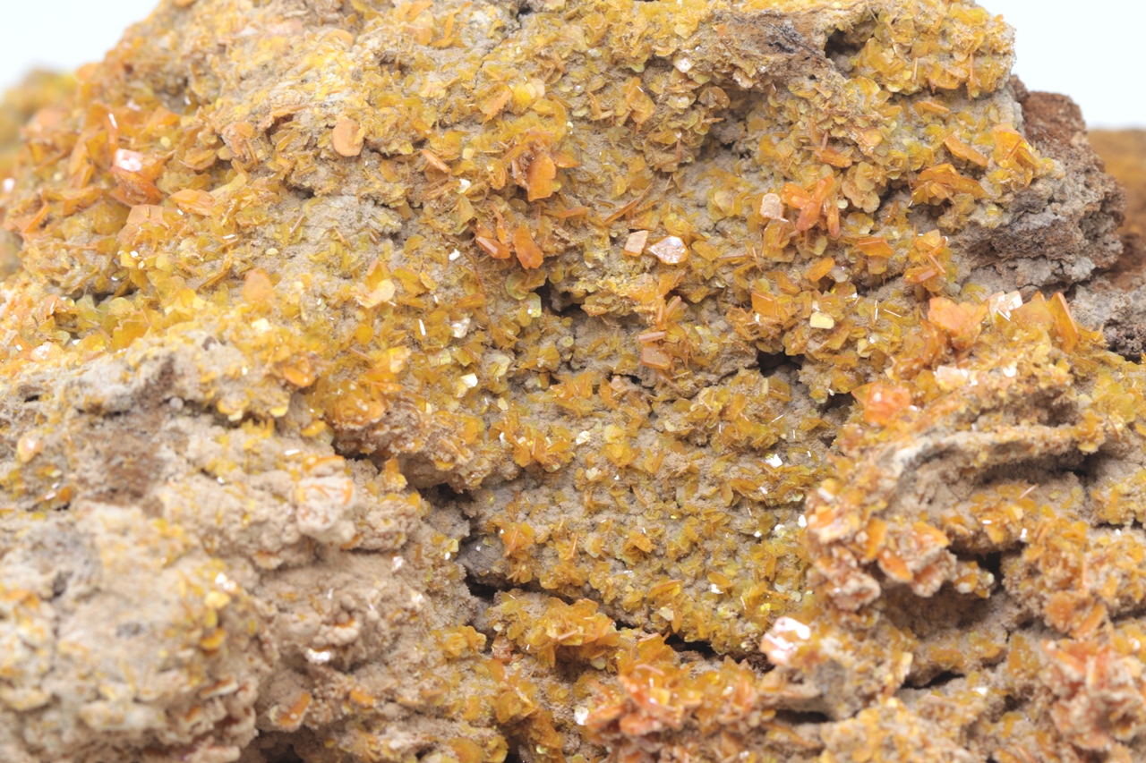 Ästhetischer Wulfenit-Muster von klarer orange Farbe. Tafelige Kristalle von bis zu 5 x 7 mm bedecken den größten Teil des Musters, haben bis zu diamantenen Glanz und mehrere Schattierungen von Orange.