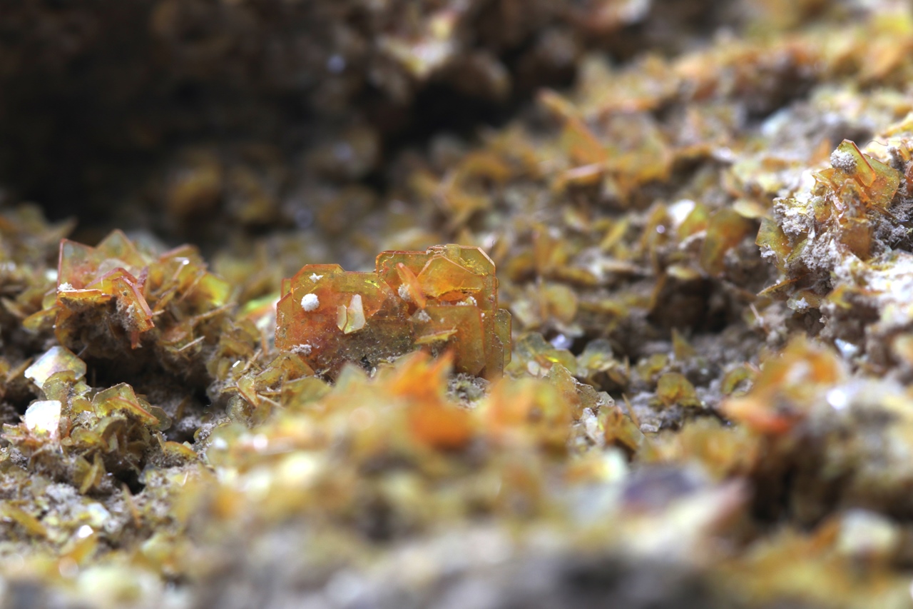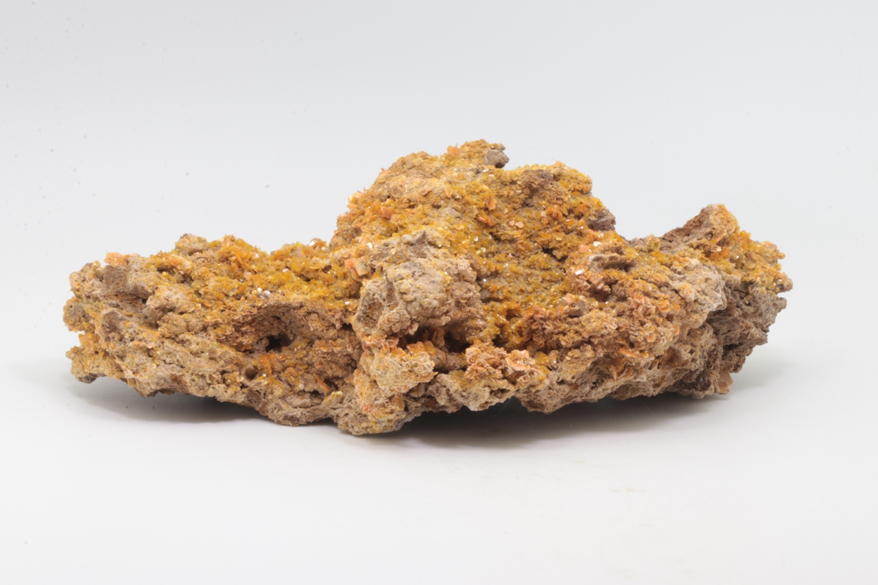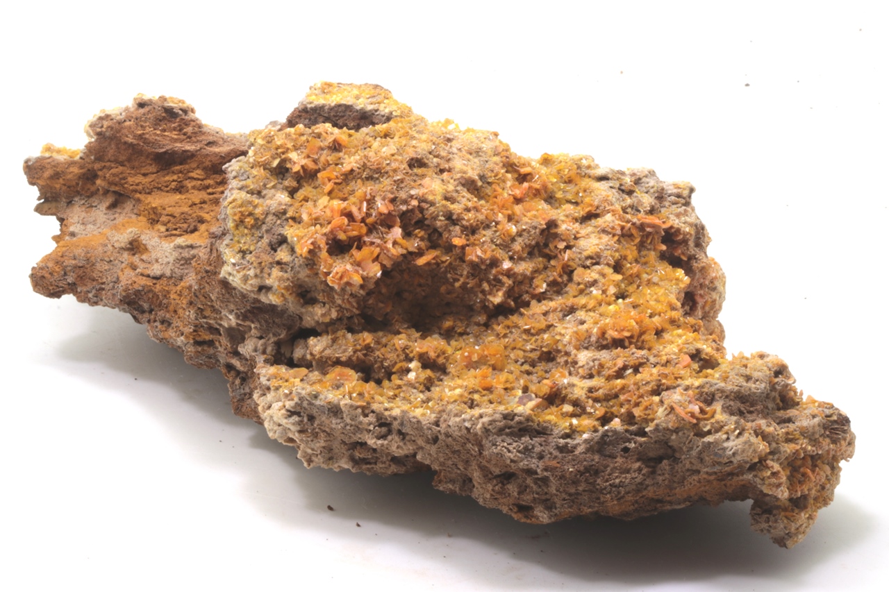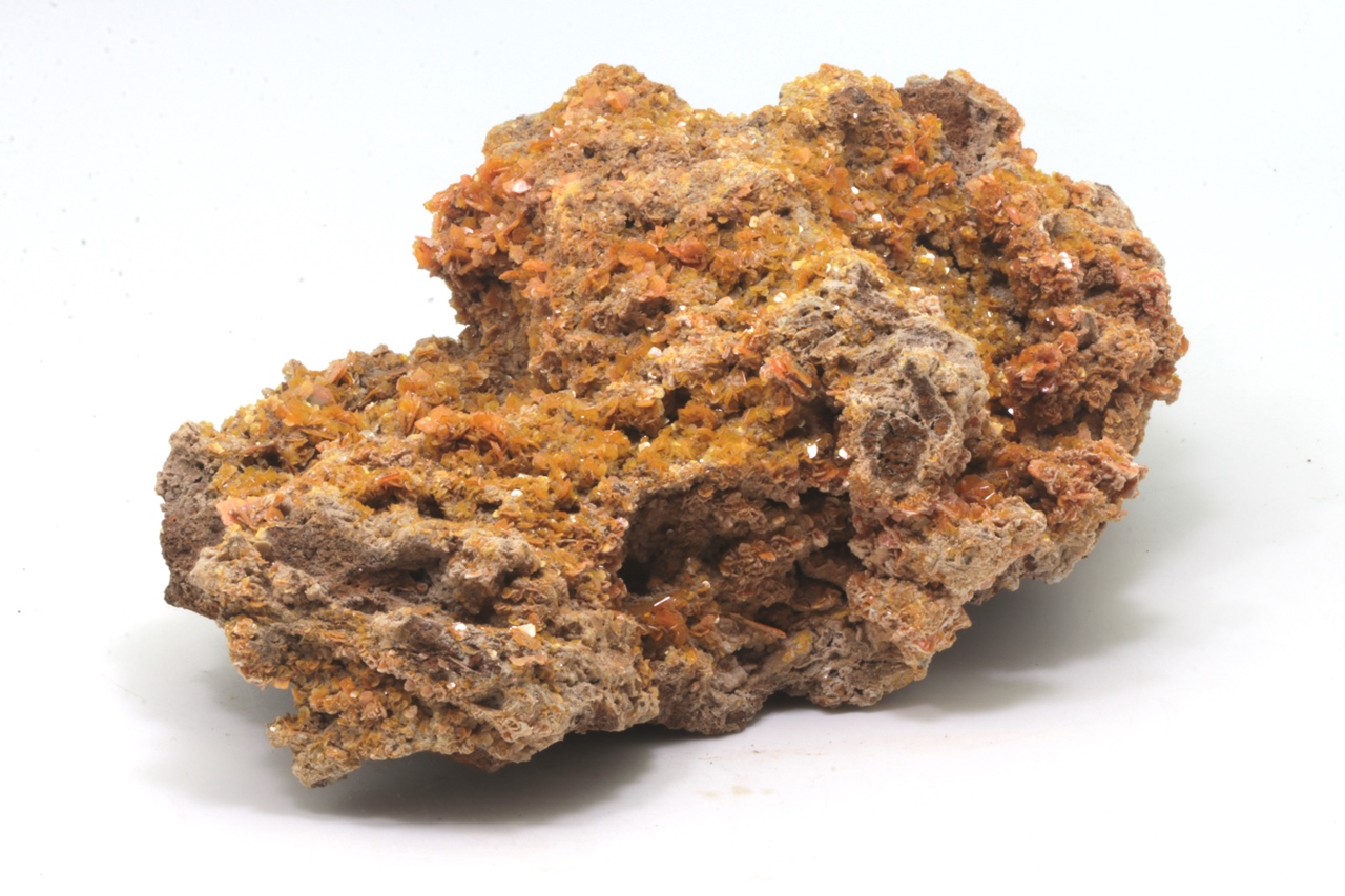 Ästhetischer Wulfenit-Muster von klarer orange Farbe. Tafelige Kristalle von bis zu 5 x 7 mm bedecken den größten Teil des Musters, haben bis zu diamantenen Glanz und mehrere Schattierungen von Orange.