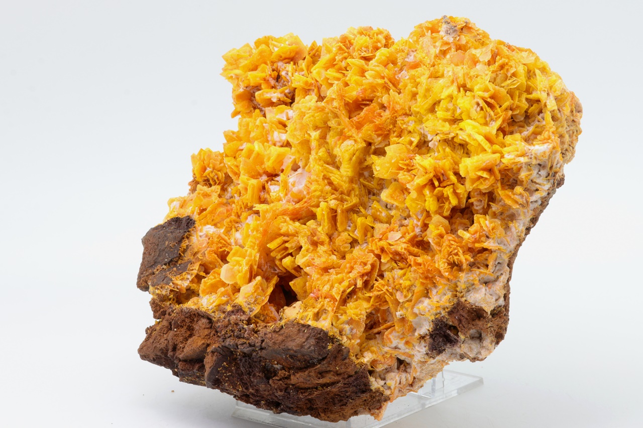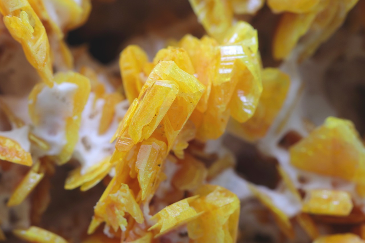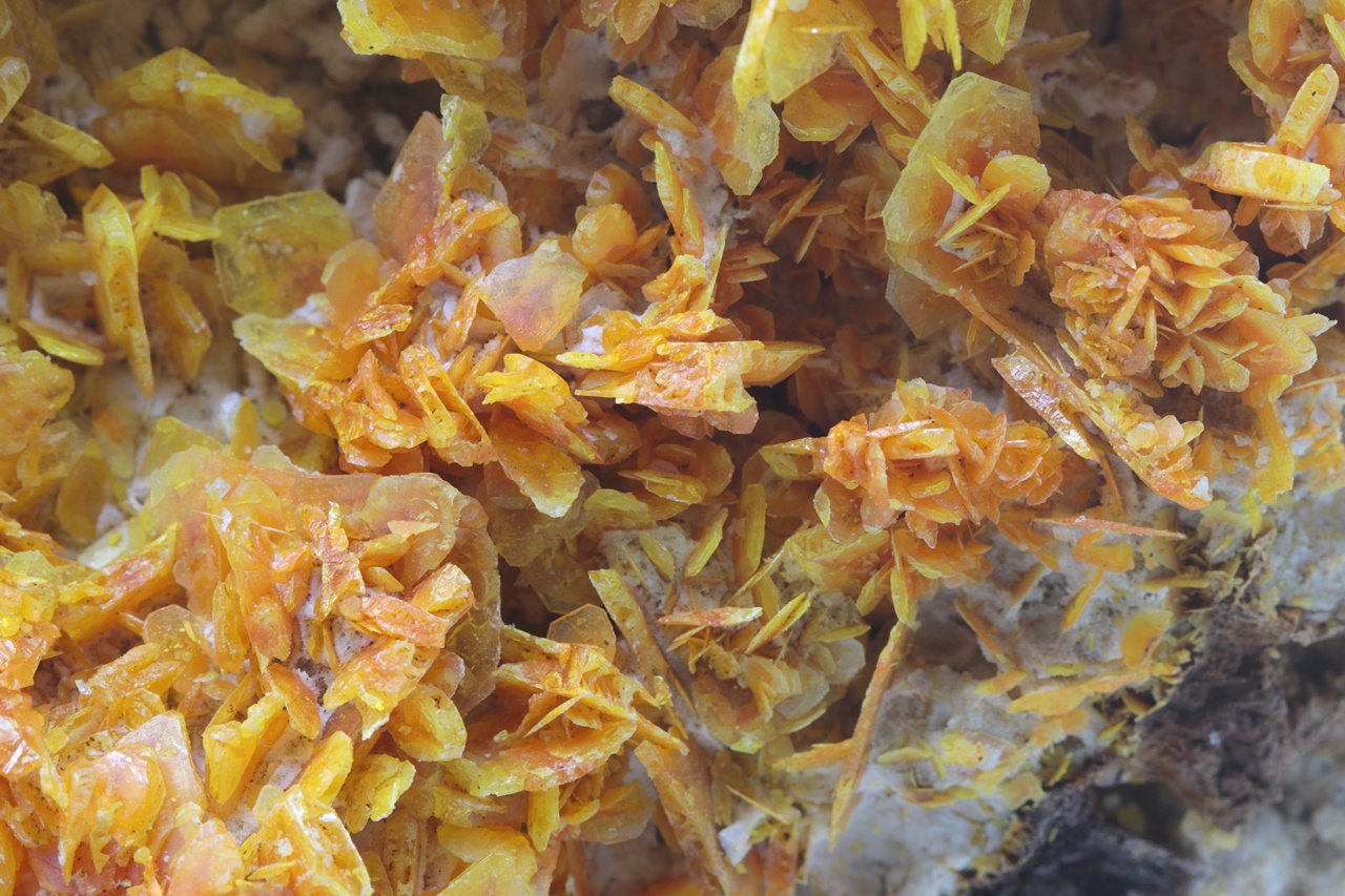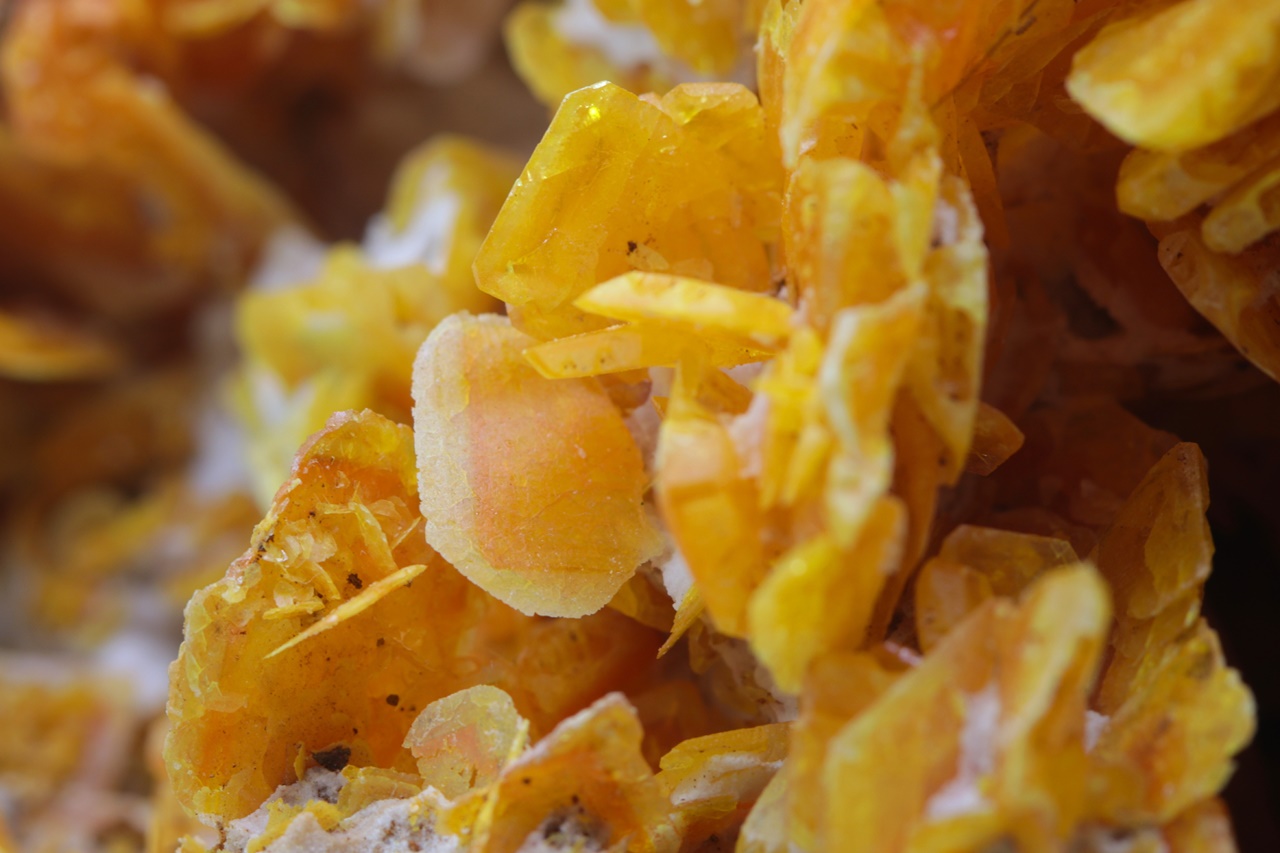 Eine außergewöhnlich große, ästhetische Druse, bestehend aus reichlich gewachsenen, seidenglänzenden Wulfenit-Kristallen, von denen einige ein skelettartiges Wachstum aufweisen. Die Kristalle sind zonal mit einem eher orangefarbenen Zentrum und in Gelb übergehenden Rändern. Der größte Kristall ist etwa 1 cm groß. Die Probe muss im Geschäft abgeholt werden.