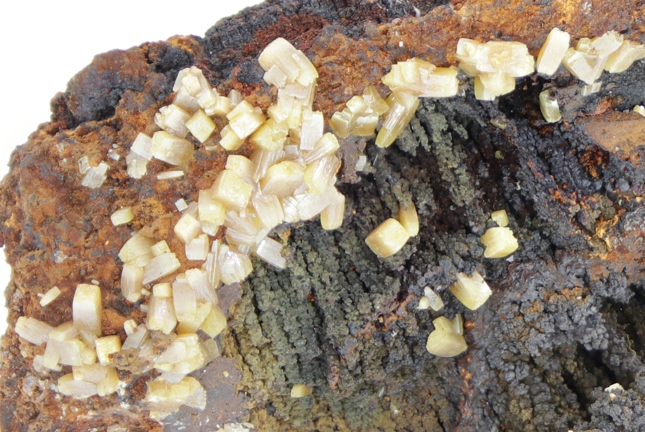 Gelbe Kristalle von Bleimolybdat mit Limonittropfsteinen.