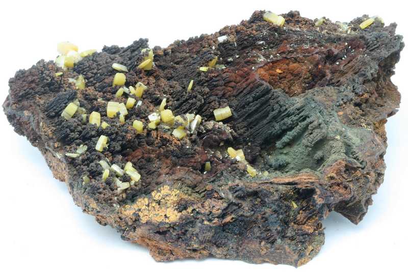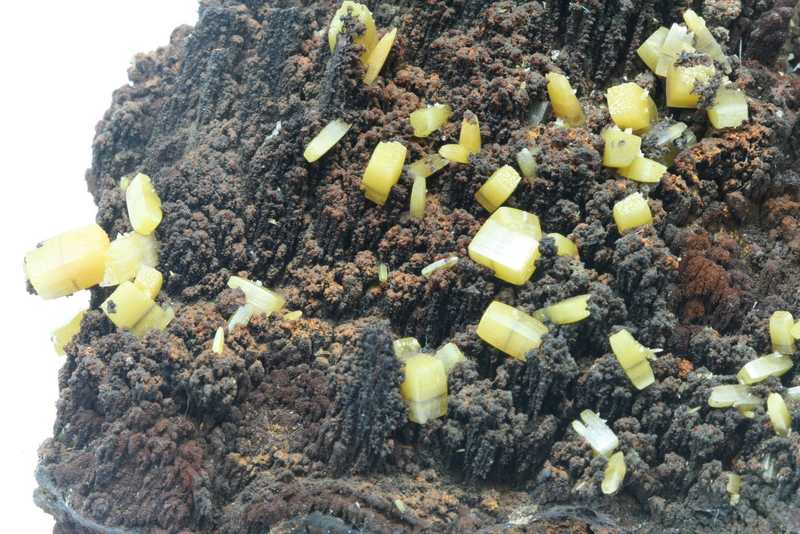 Probe von Wulfenit aus der mexikanischen Lokalität Mapimi. Druse von gelben Wulfenit-Kristallen bis zu 7 mm Größe.