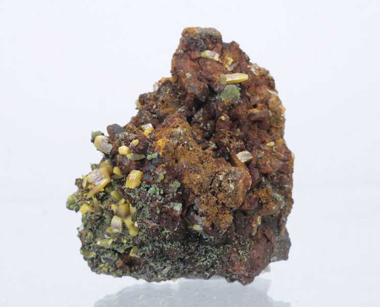Eine sehr ästhetische Stufe von Wulfenit mit Mimetesit aus dem mexikanischen Mapimi. Eine hochwertige Stufe gut entwickelter gelber bis gelborangefarbener, schuppenförmiger Wulfenit-Kristalle, die von grünen Mimetesit-Aggregaten begleitet werden; das Exemplar hat eine abgeschittene Basis .