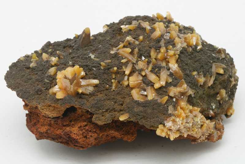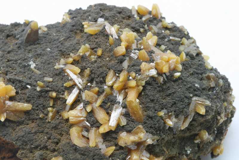 Ein sehr interessantes Exemplar von Wulfenit mit einer Größe von bis zu 11 mm und seltenem Mottramit aus dem mexikanischen Mapimi. Ein sehr schönes Exemplar mit Wulfenitkristallen, die teilweise von dunklen Aggregaten von Mottramit überwachsen sind.