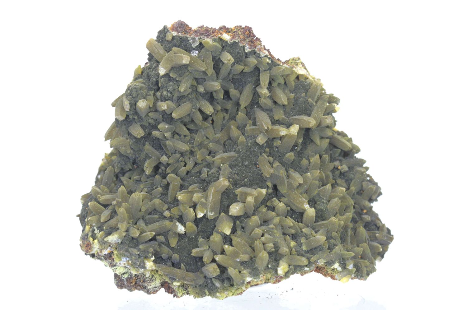 Sehr schöne Probe einer offenen Höhle mit klassisch entwickelten Wulfenitkristallen, die teilweise von dunklen Mottramit-Aggregaten überwachsen sind – diese füllen dann die Räume zwischen den Wulfenitkristallen aus, die auch perimorph sind (dunkler Farbton).