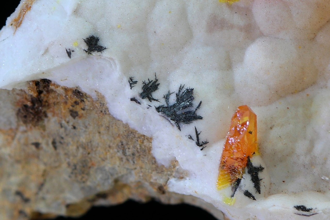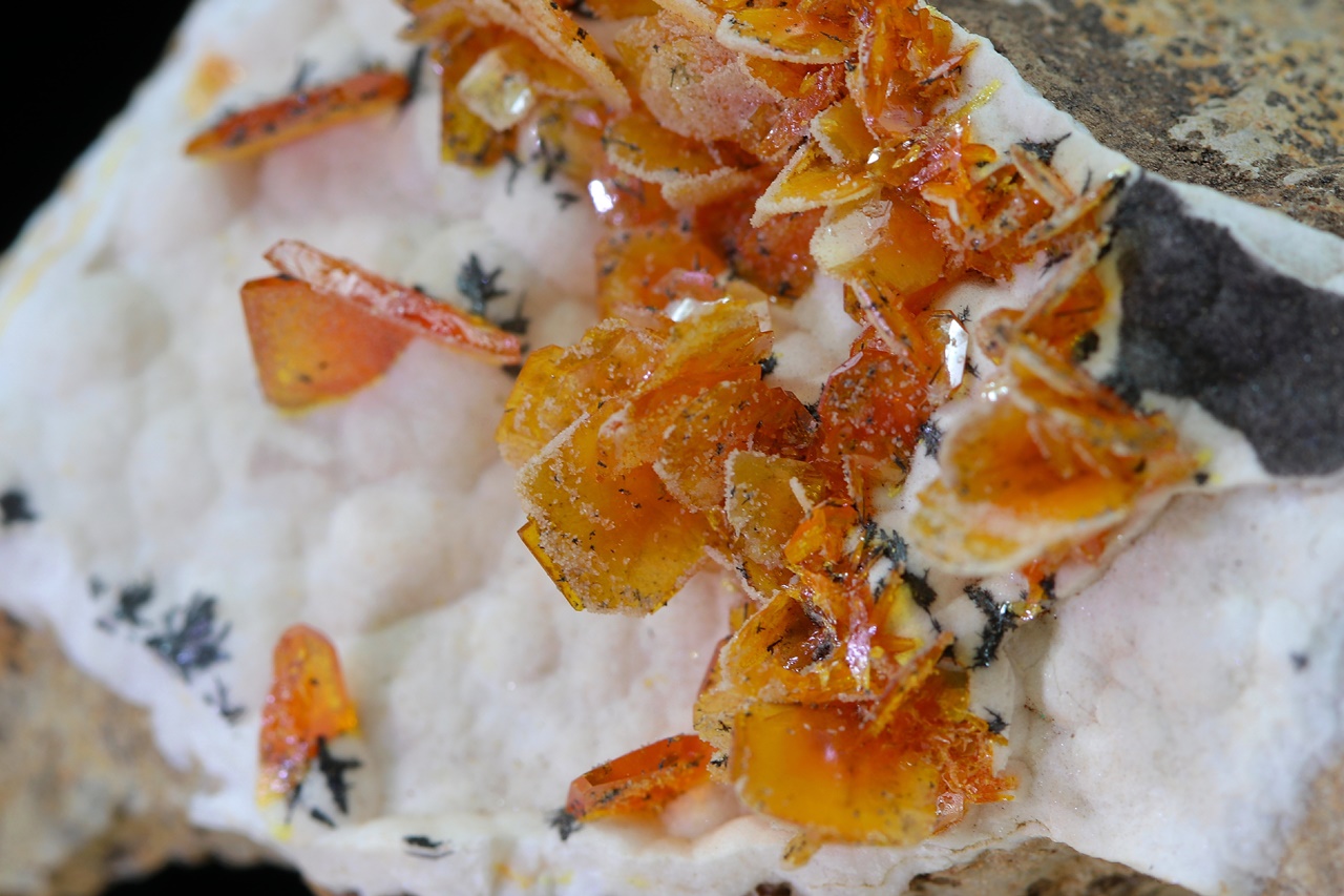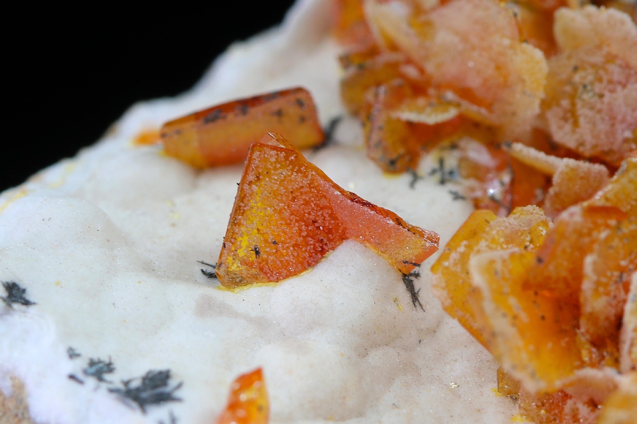 Wunderschöne, orangefarbene, tafelige Wulfenit-Kristalle gewachsen auf weißem Aragonit mit Nadeln von schwarzem Bleioxid – Plattnerit. Der größte Wulfenit-Kristall ist 5 mm groß.