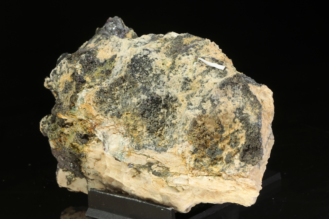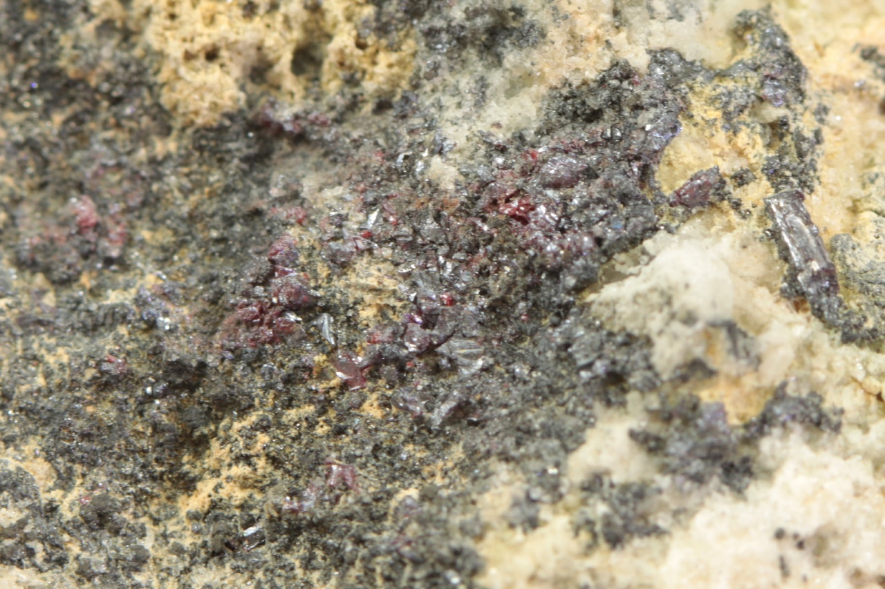 Nezvykle velká (1,5 mm) srostlice krystalů vzácného oranžového xantokonu s se skupinou sytě červených krystalů proustitu až 1 mm velkých.