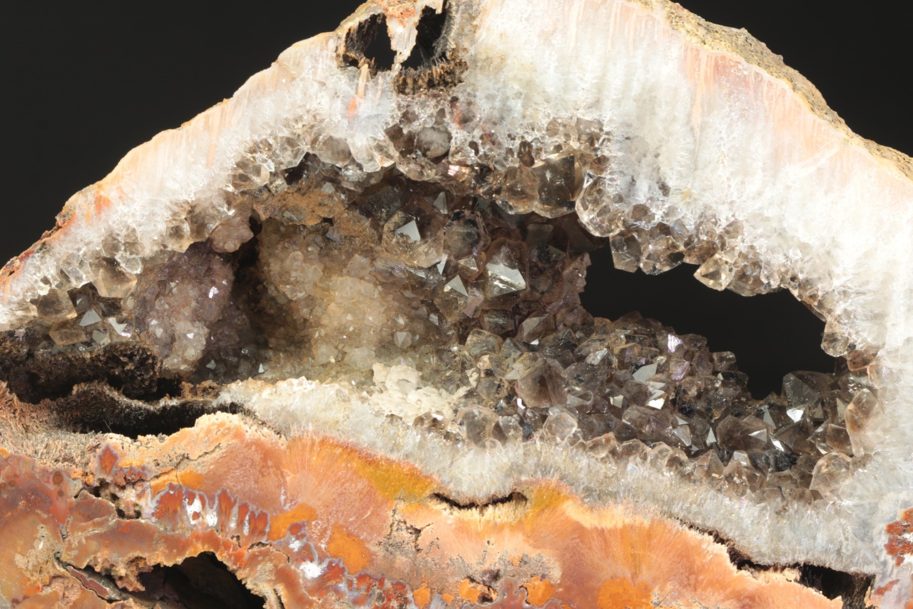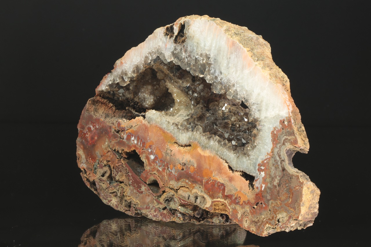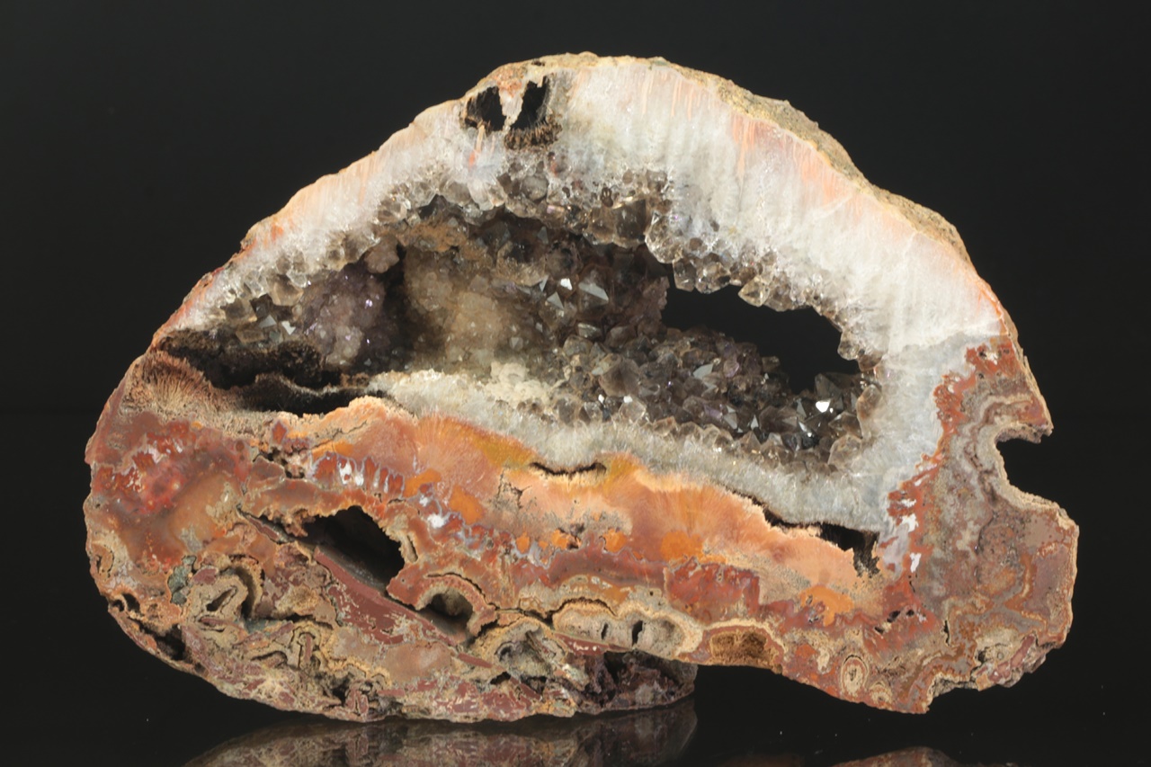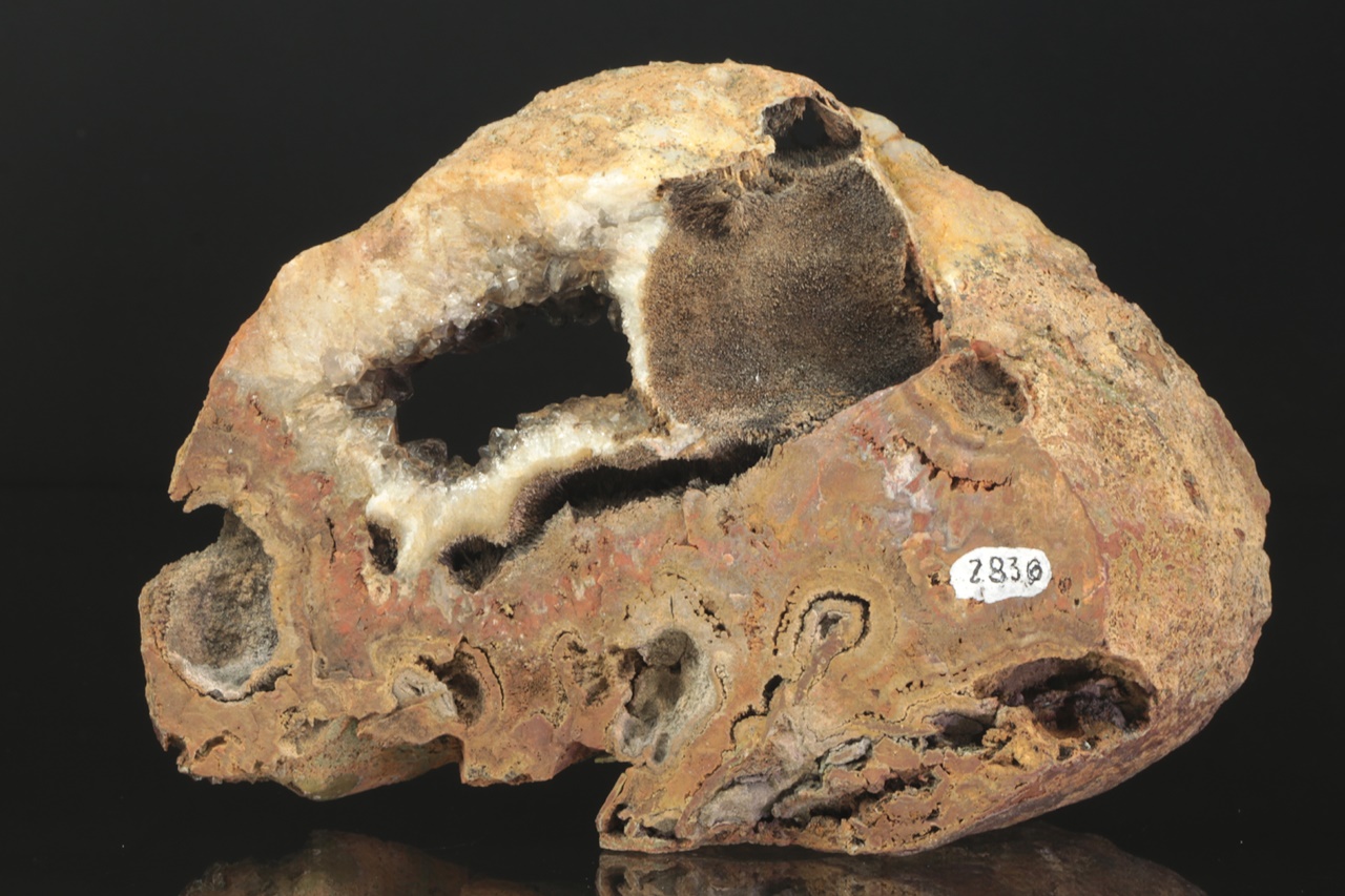 Polierte Achatscheibe mit einer braunen Höhlung. Die Dimensionen der Höhlung betragen 10 × 3 cm.