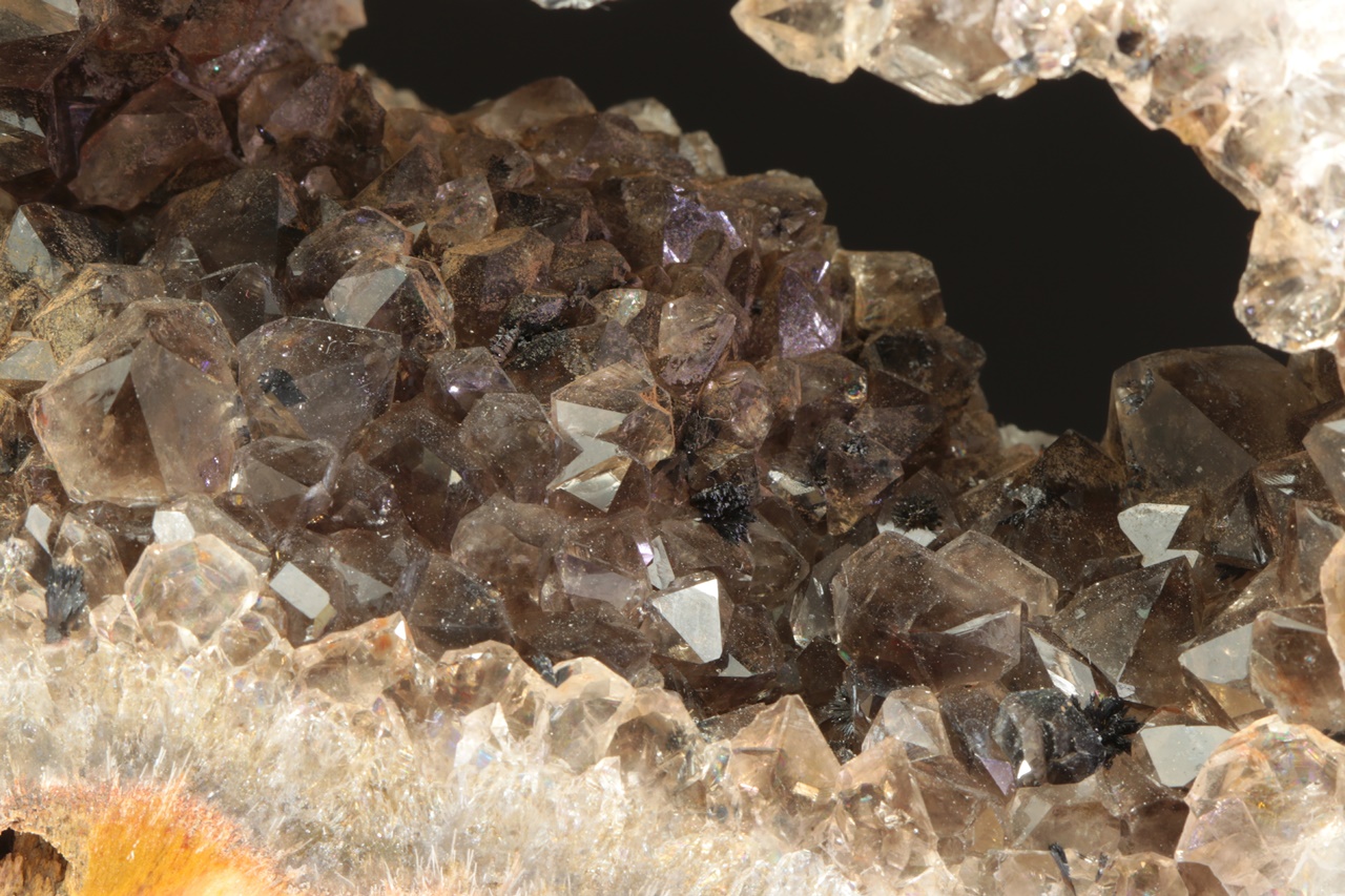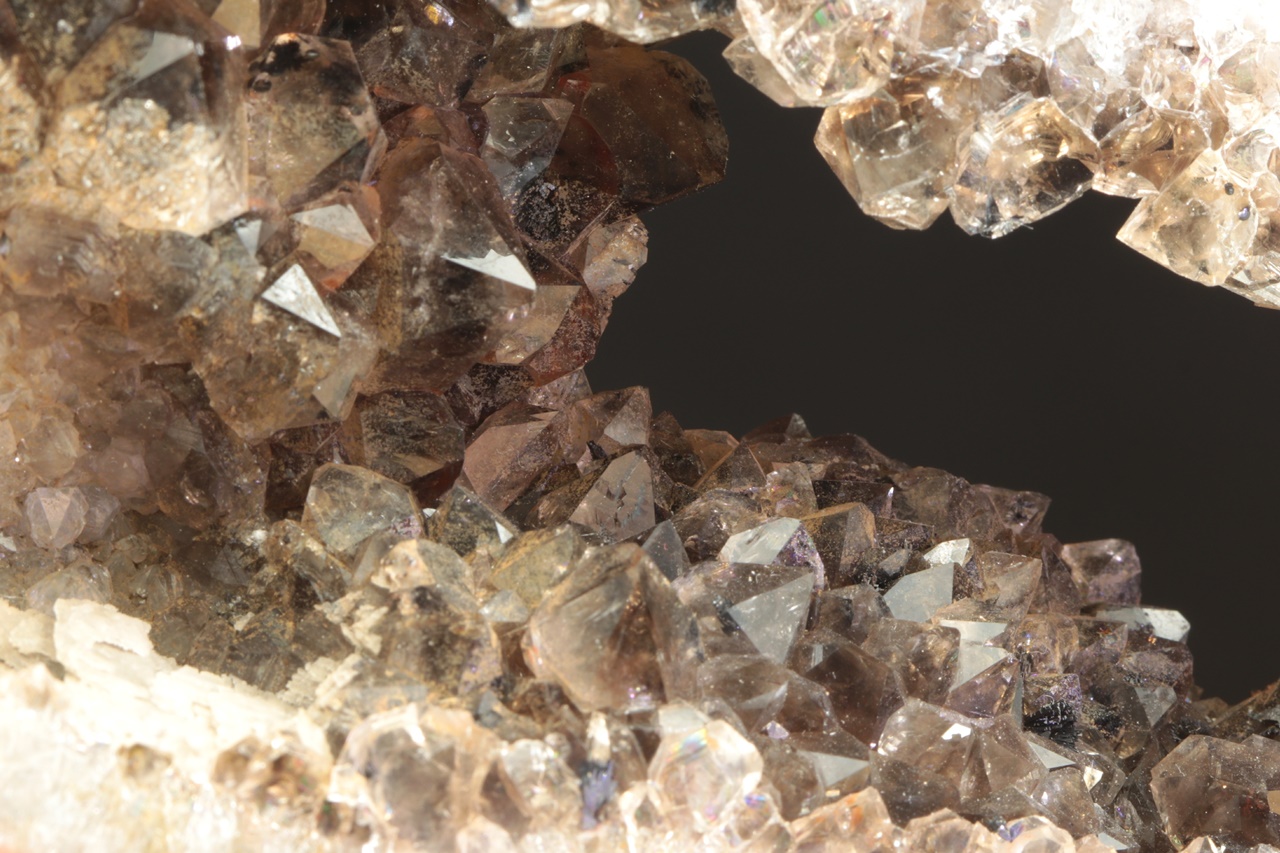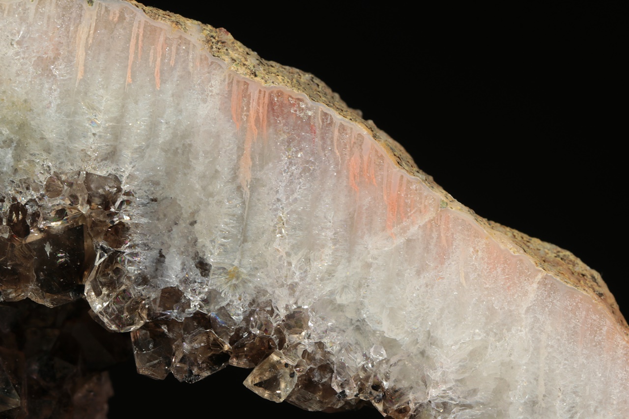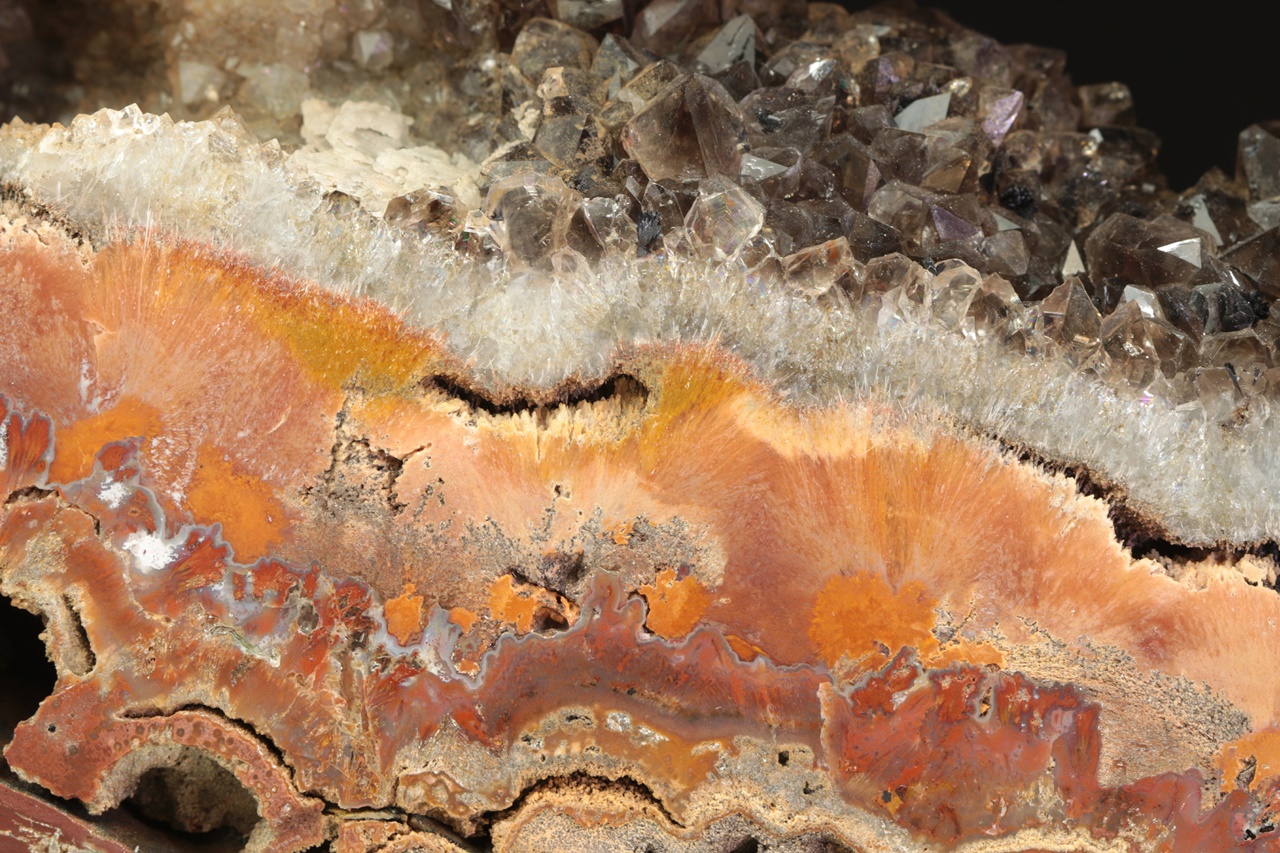 Polierte Achatscheibe mit einer braunen Höhlung. Die Dimensionen der Höhlung betragen 10 × 3 cm.