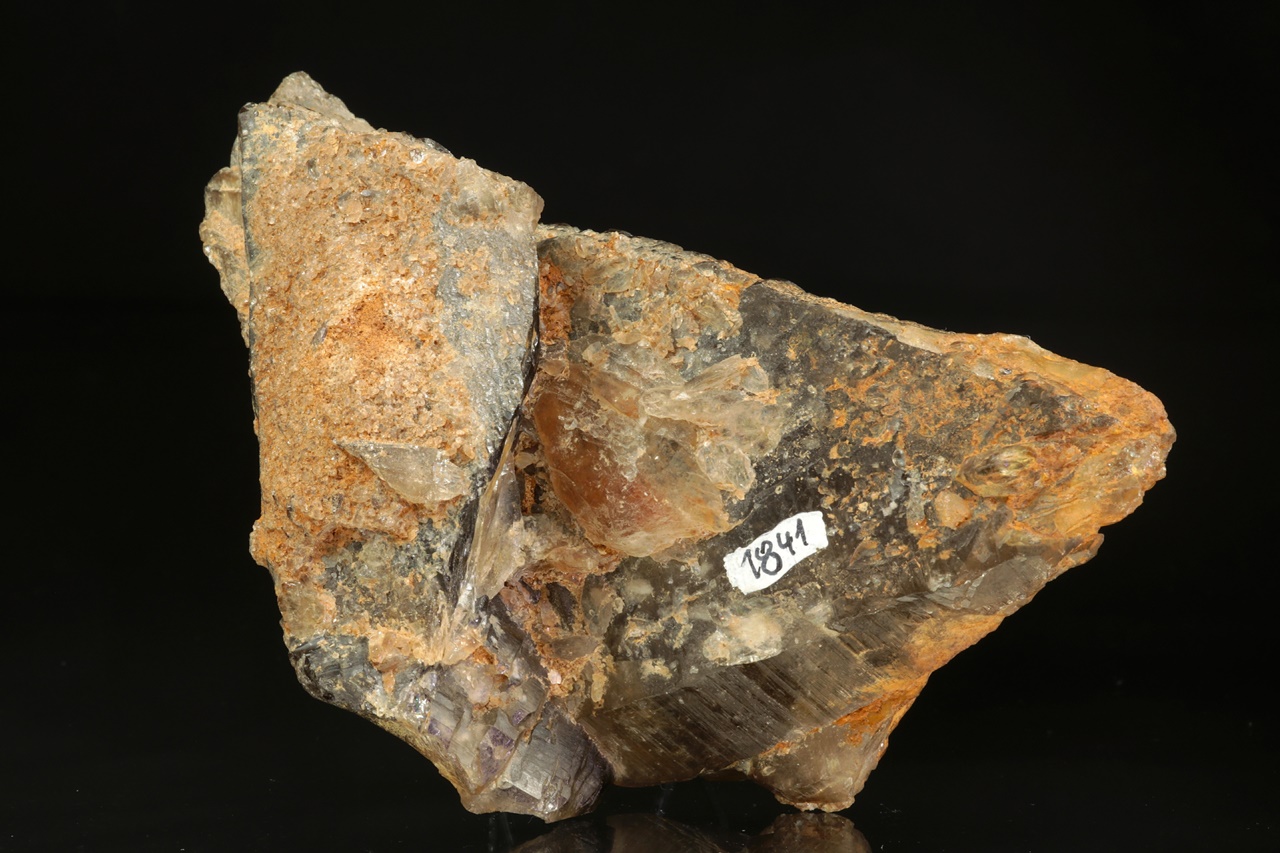 Srostlice tří krystalů tmavé záhnědy s tabulkami cinvalditu a béžovým živcem. Krystaly jsou ze zadní strany dohojené.