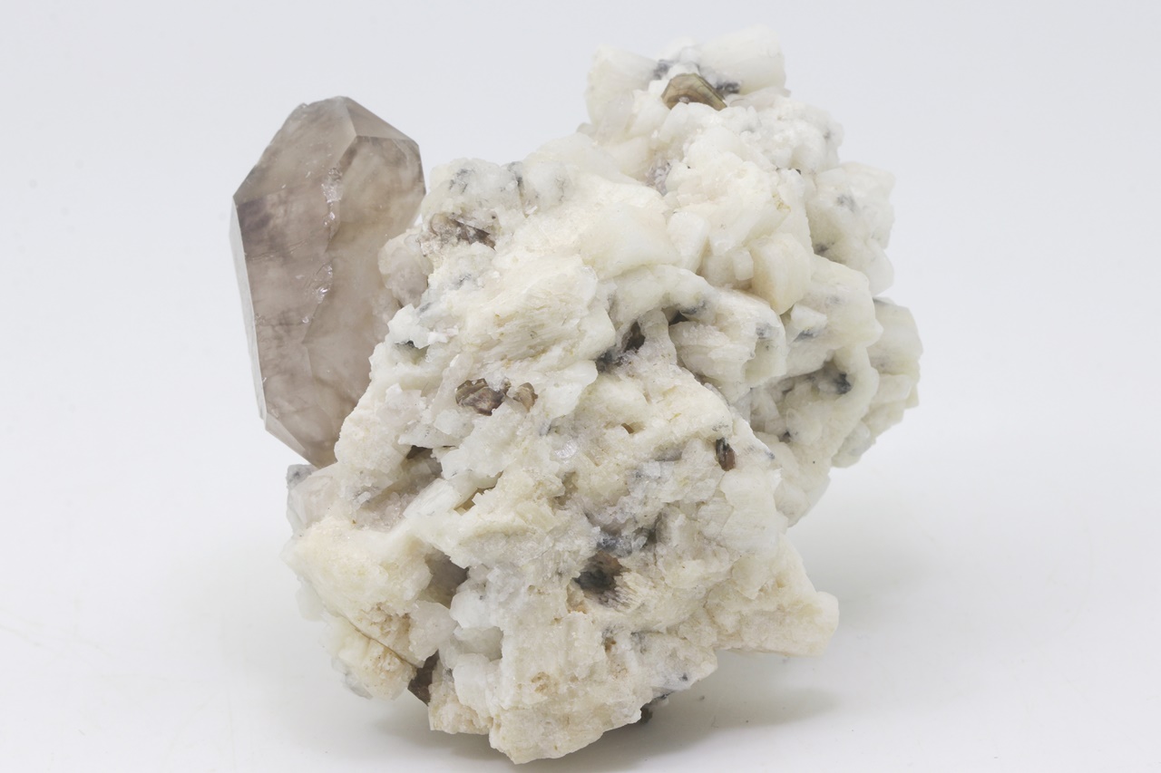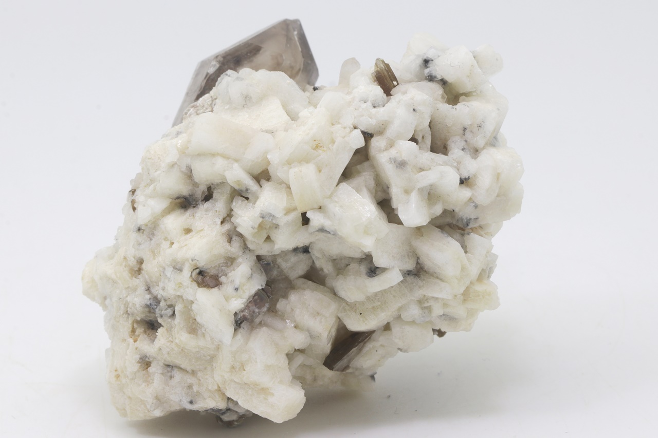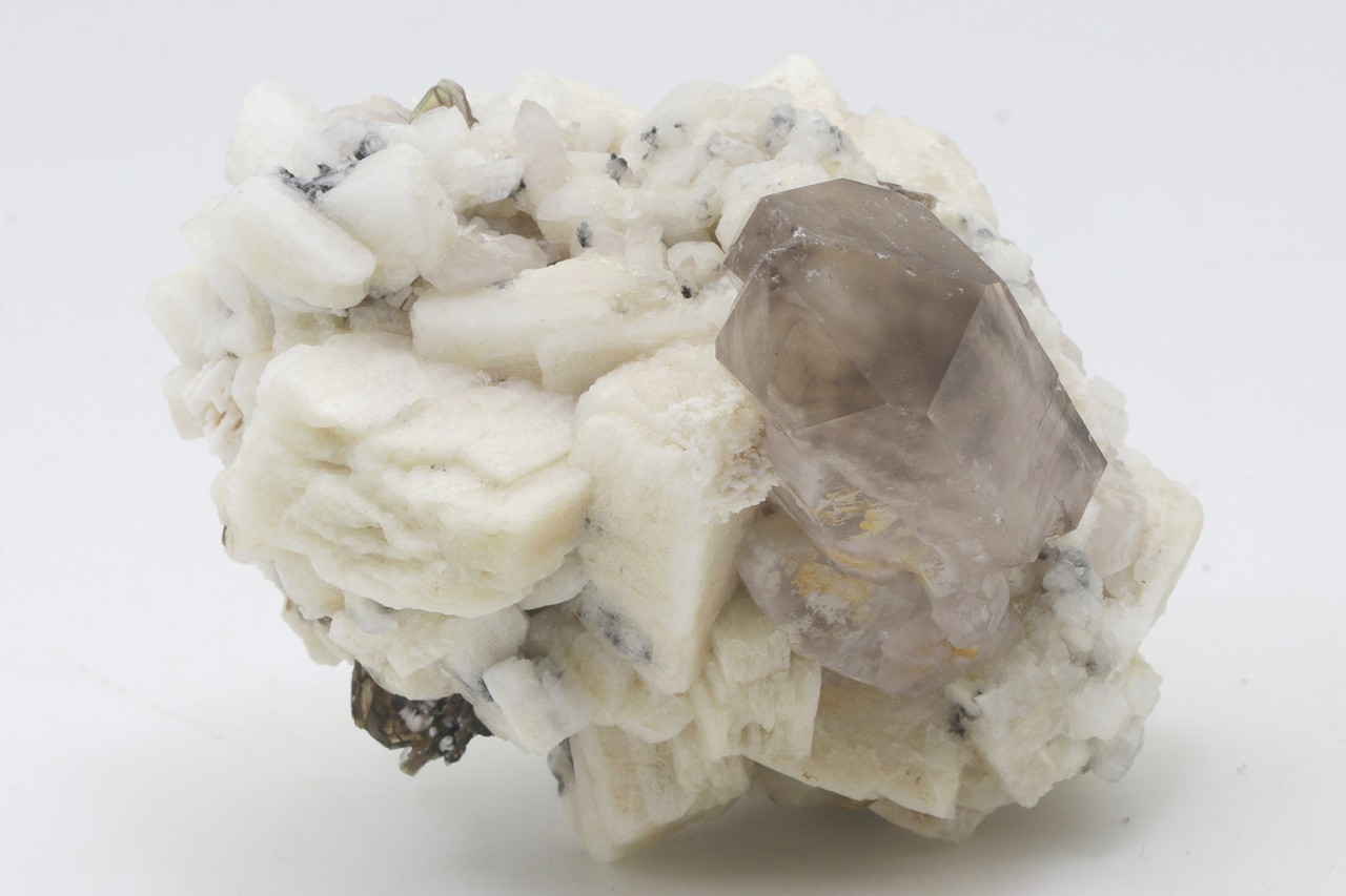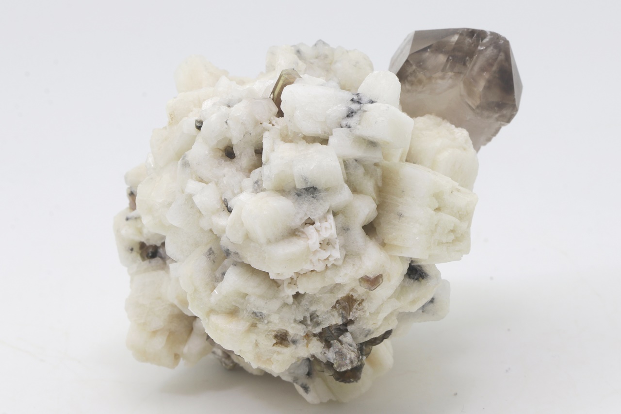 Beidseitige Druse weißer Albit-Kristalle bis 2 cm Größe mit einem 4,5 cm großen Rauchquartz .