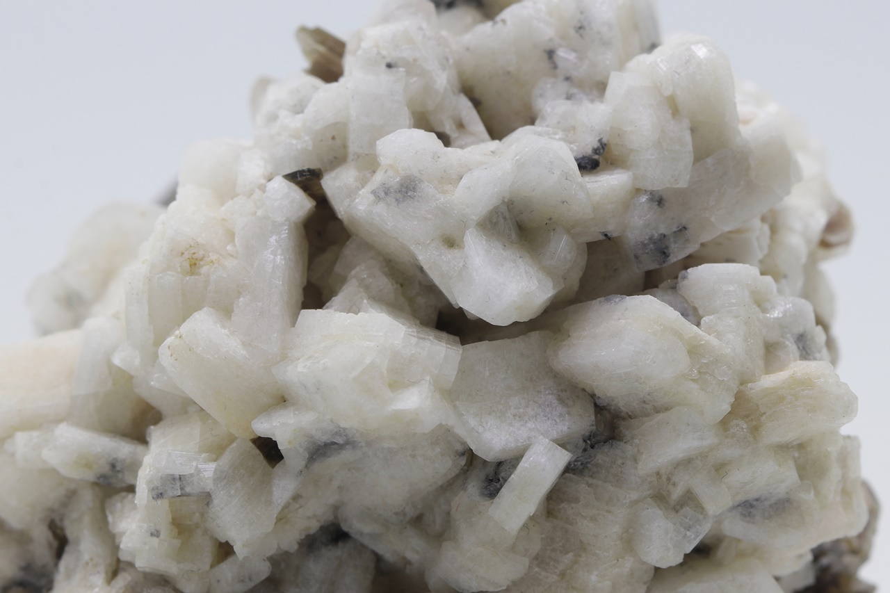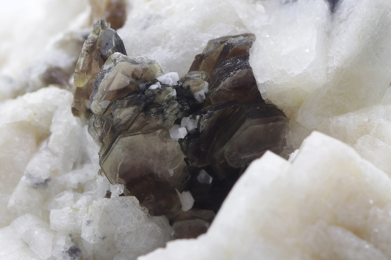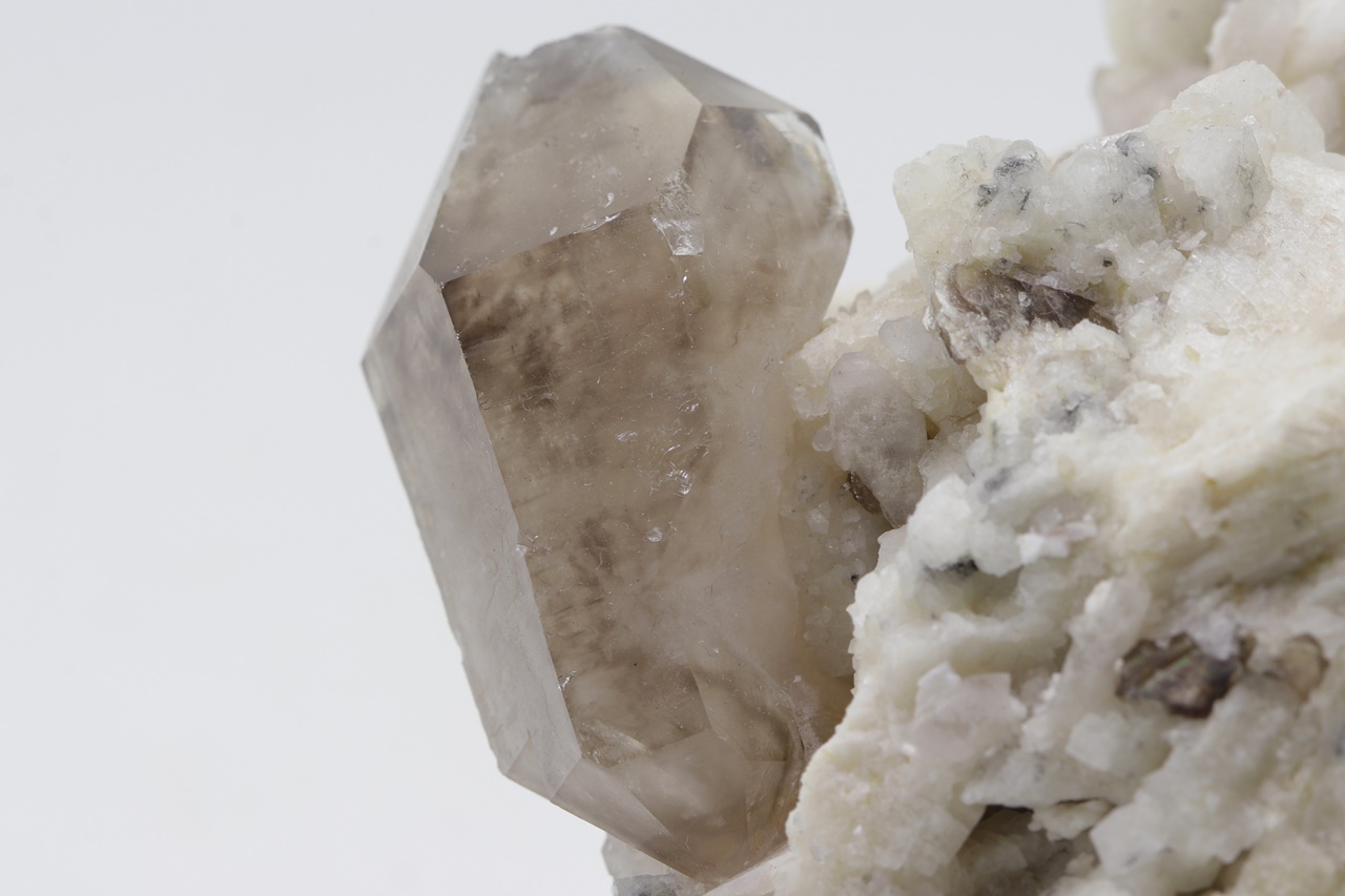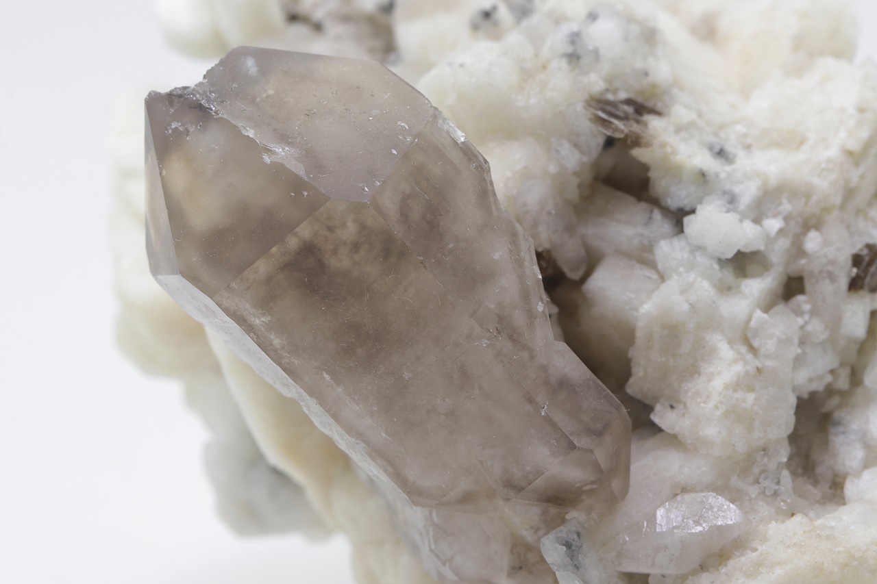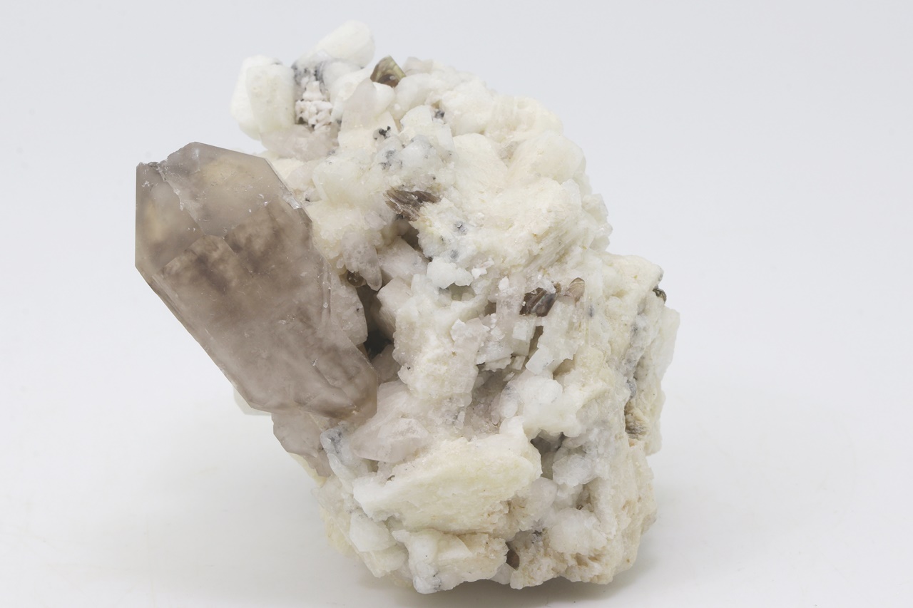 Beidseitige Druse weißer Albit-Kristalle bis 2 cm Größe mit einem 4,5 cm großen Rauchquartz .