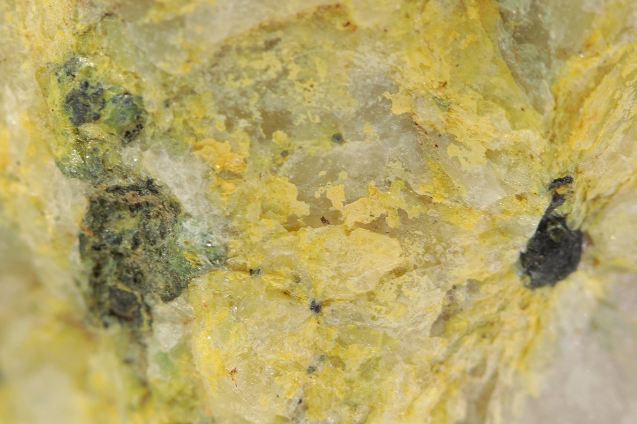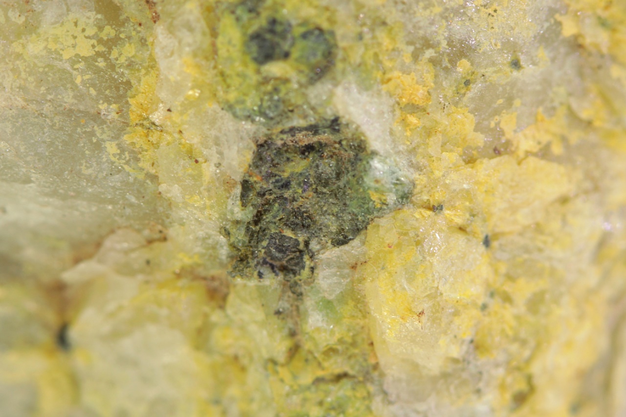 Schwarze Zavaritskit-Körner, die mit Preisingerit durchwachsen, sind von gelbem Russellit umgeben. Das größte Zavaritskit-Korn ist 5 mm groß.